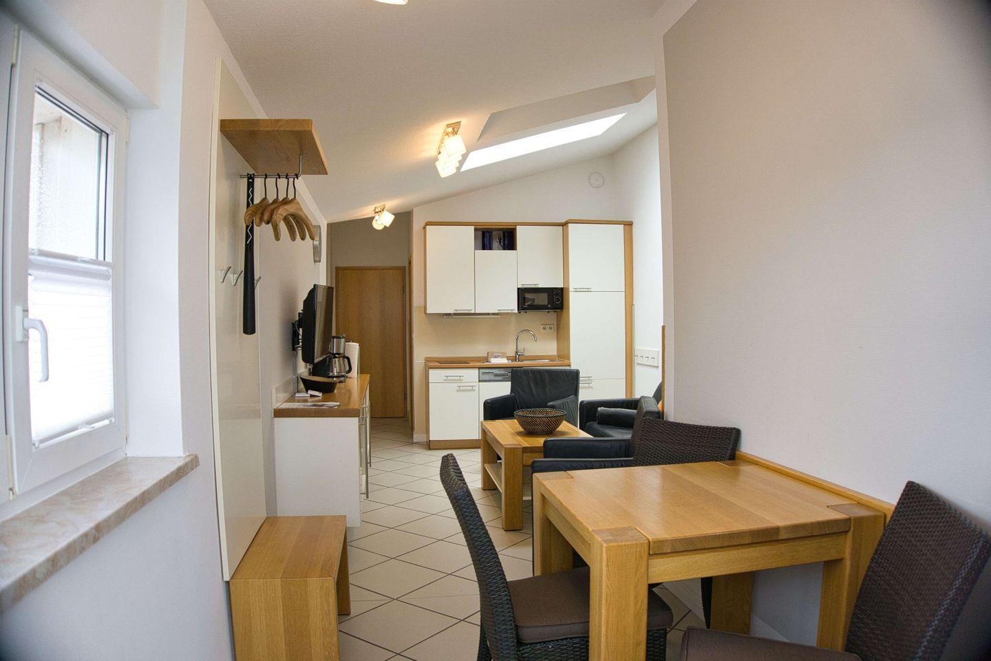 WOHNEN // Wohnraum mit Essbereich, Esstisch mit 4 Stühlen, Sitzgarnitur, Couch mit Schlaffunktion, Kabel-TV, Radio, CD-Player ++