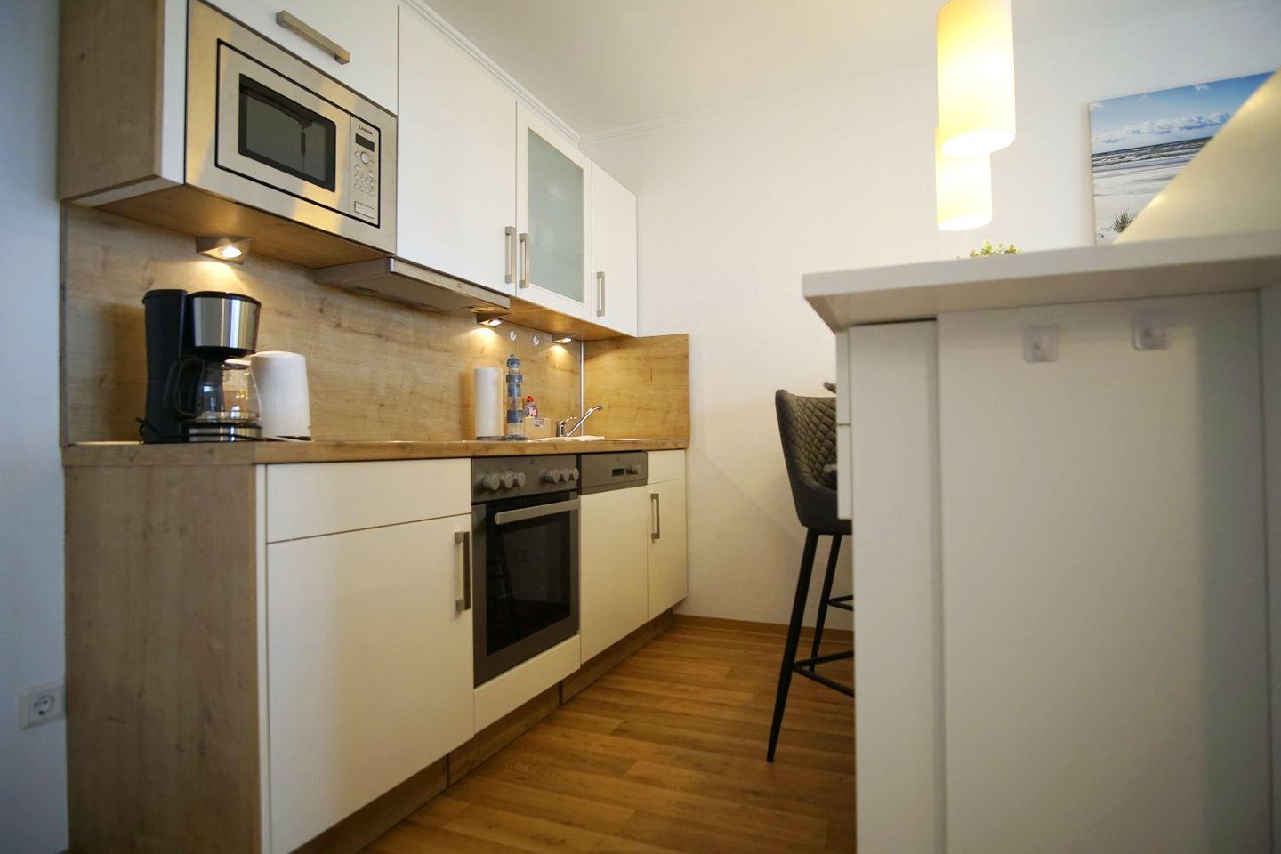 KÜCHE // Küchenzeile, Cerankochfeld (4-Platten), Spülmaschine, Kühlschrank mit Gefrierfach, Backofen, Mikrowelle, Toaster, Wasserkocher, Kaffeemaschine, reichlich Besteck, Geschirr und Küchenutensilien ++