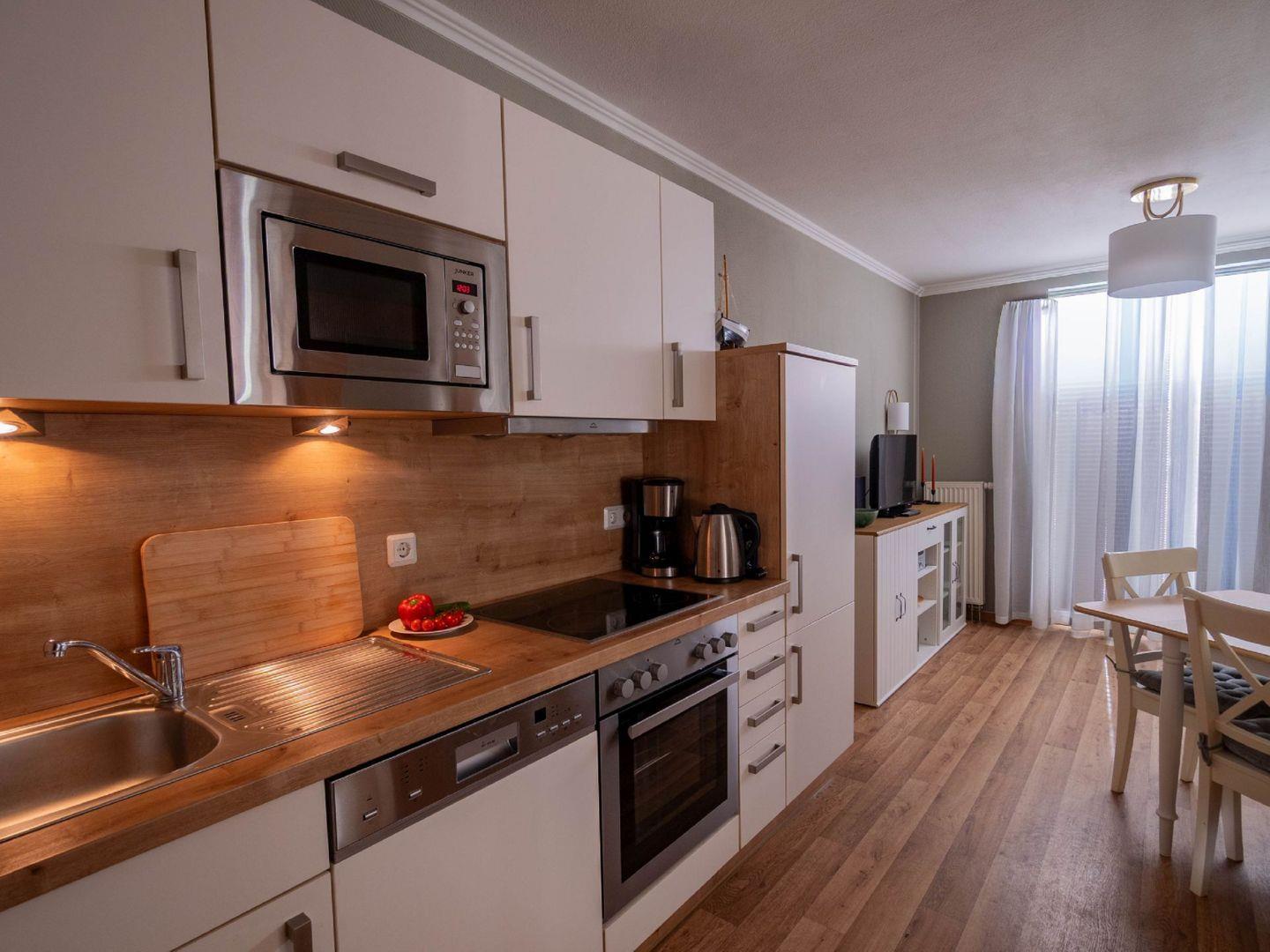KÜCHE // Küchenzeile, 4-Platten Herd, Spülmaschine, Kühlschrank mit Gefrierfach, Backofen, Toaster, Wasserkocher, Kaffeemaschine, reichlich Besteck, Geschirr und Küchenutensilien ++
