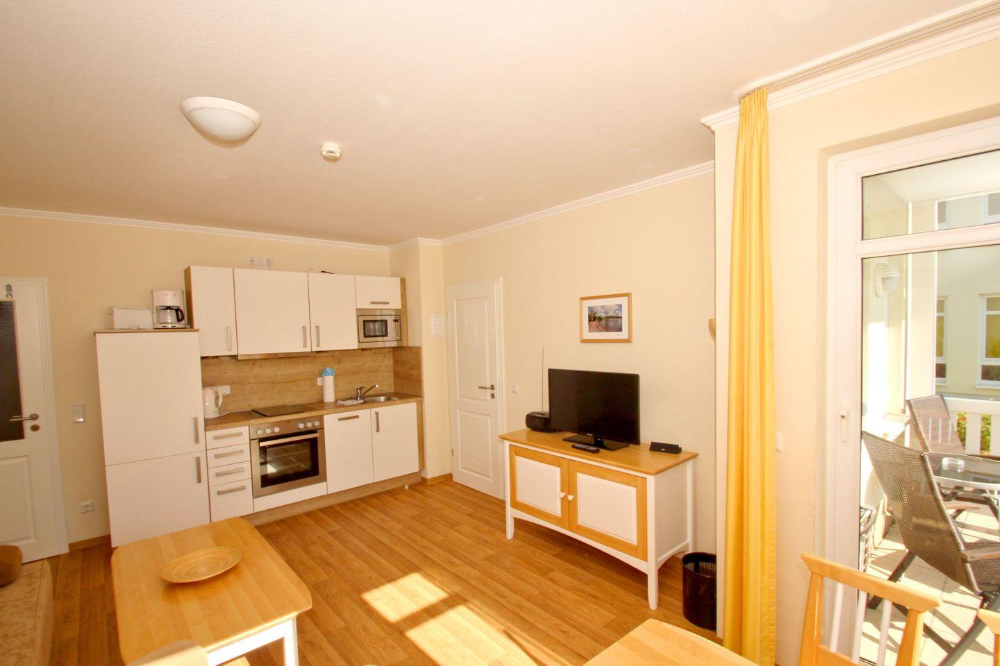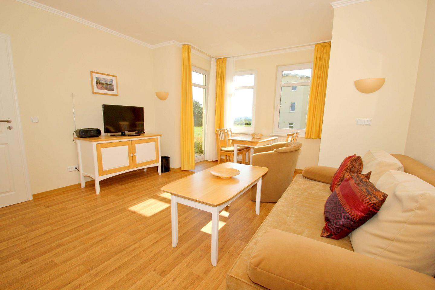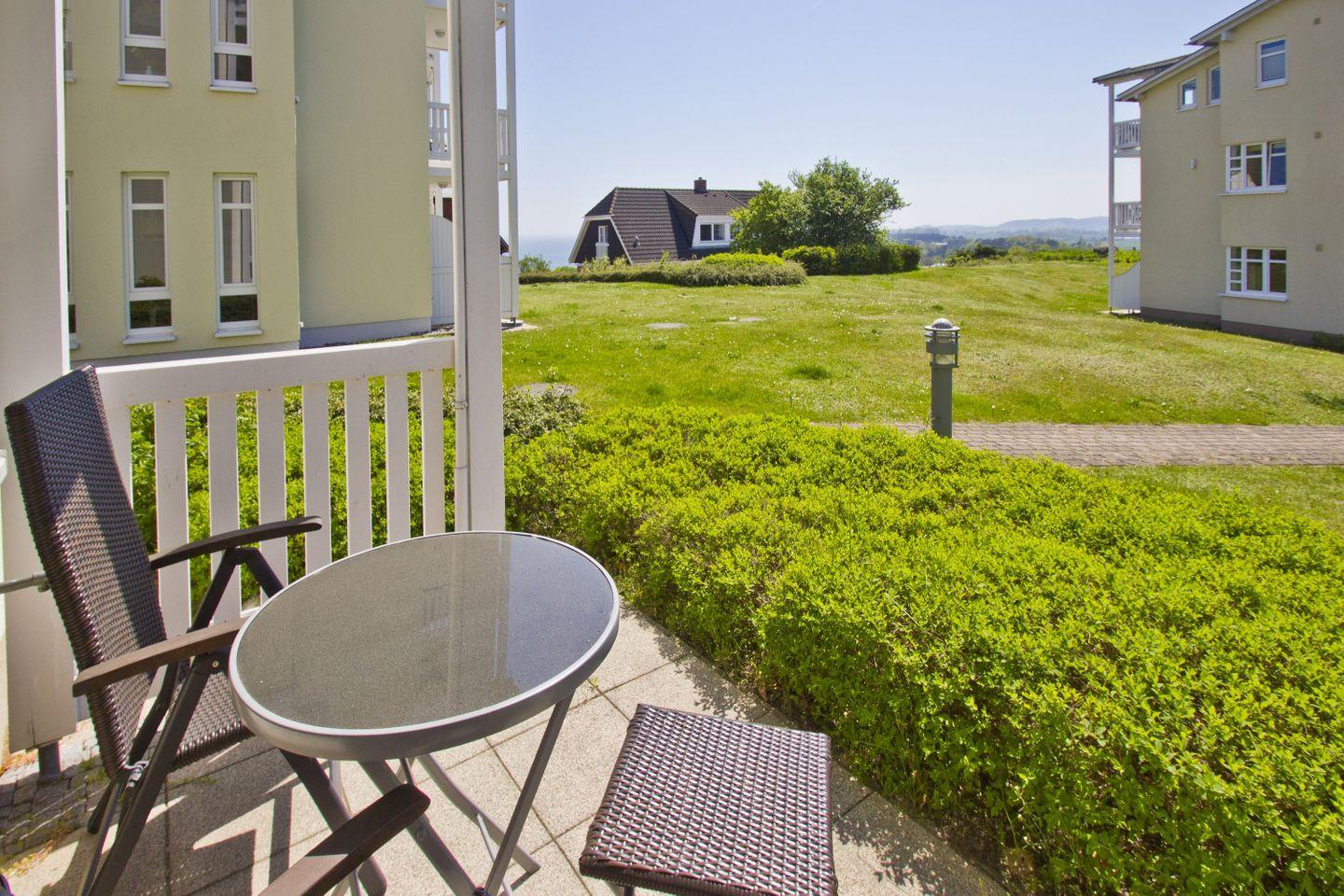 Komfortable Ferienwohnung mit Terrasse und Meerblick in Göhren, inklusive kostenfreiem Zugang zum Erlebnisbad und Sauna.