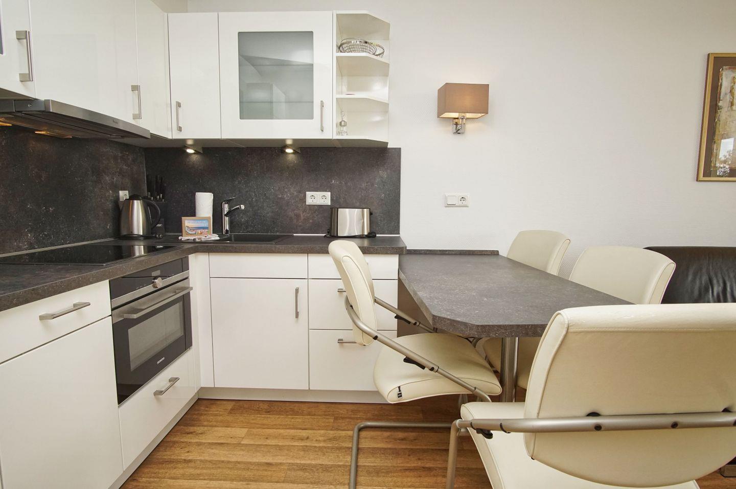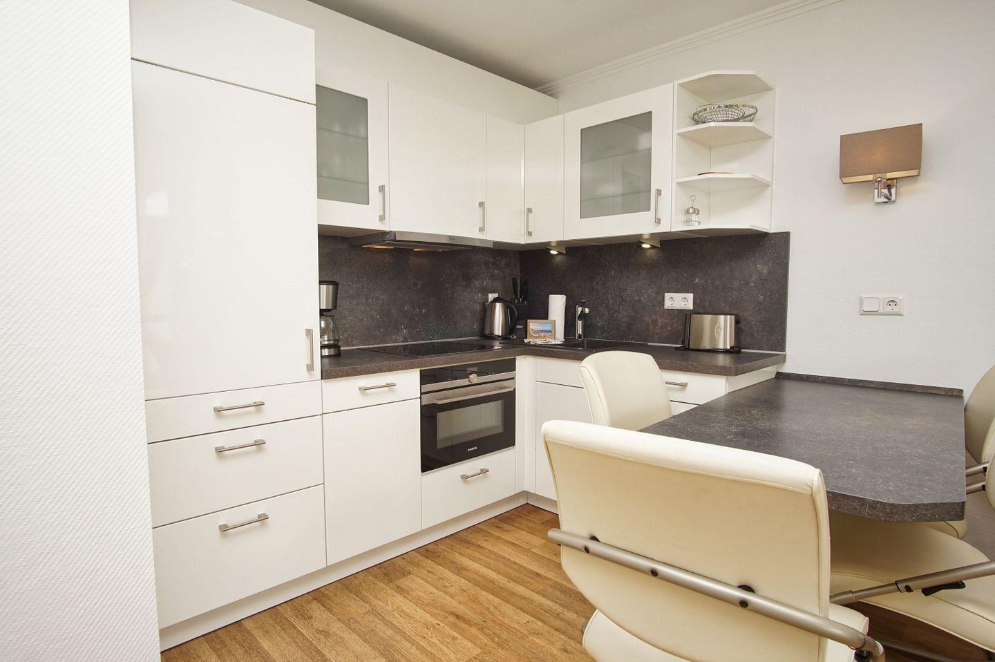 KÜCHE // Küchenzeile, 4-Platten-Herd, Spülmaschine, Kühlschrank mit Gefrierfach, Backofen mit Mikrowellenfunktion, Toaster, Wasserkocher, Kaffeemaschine, reichlich Besteck, Geschirr und Küchenutensilien ++