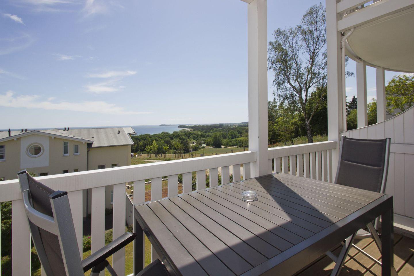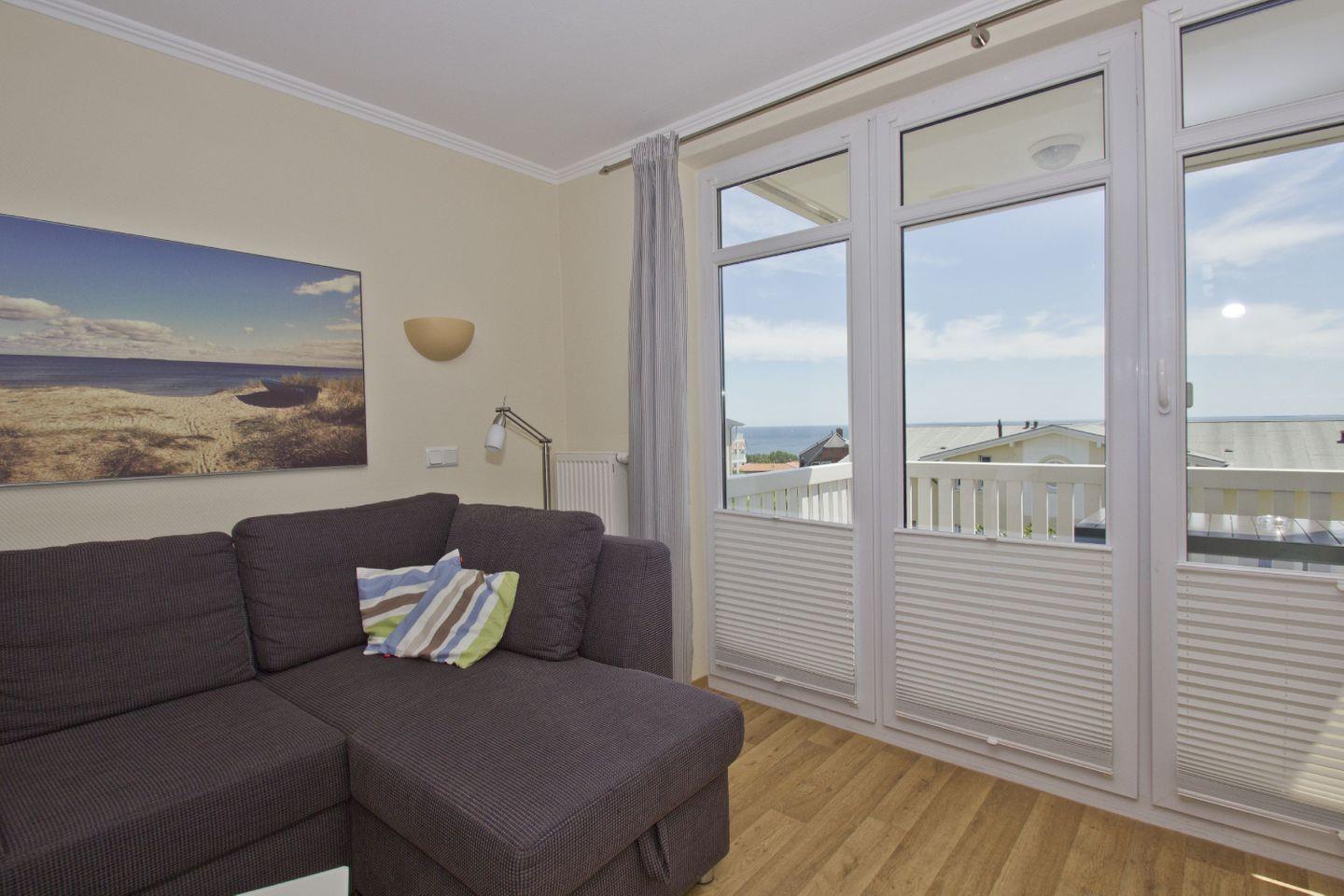 Charmante Ferienwohnung in Göhren mit Balkon, Meerblick und kostenfreiem Zugang zu Schwimmbad und Sauna.