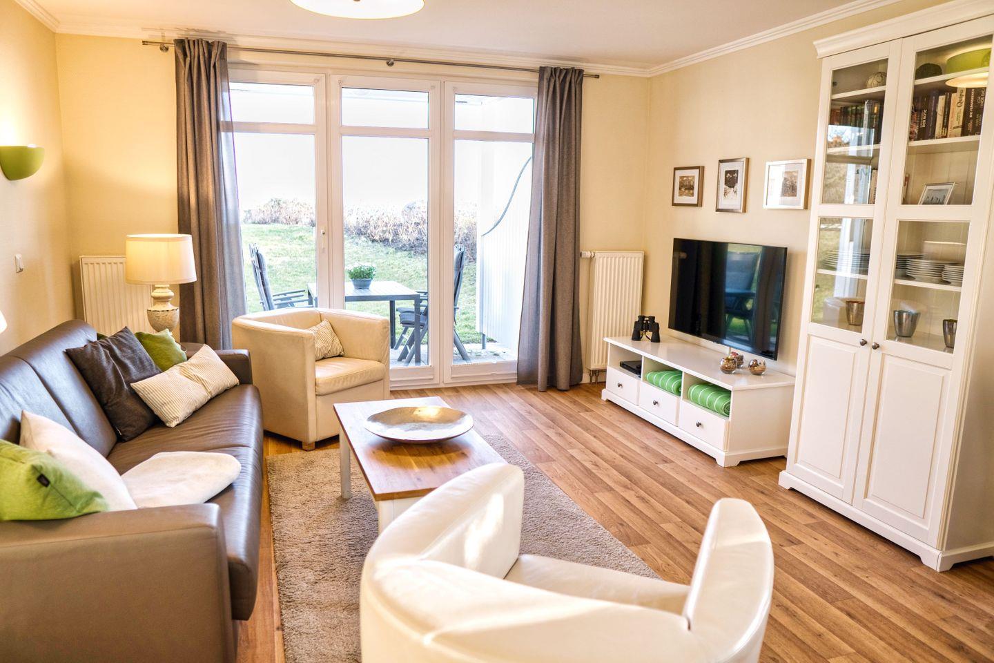 Genießen Sie eine komfortable Ferienwohnung mit Terrasse und Meerblick in Göhren, inklusive kostenlosem Zugang zum Erlebnisbad und Sauna.