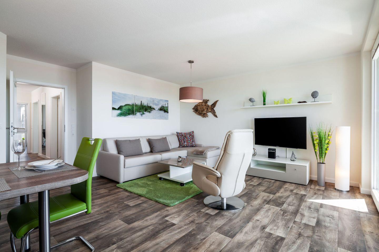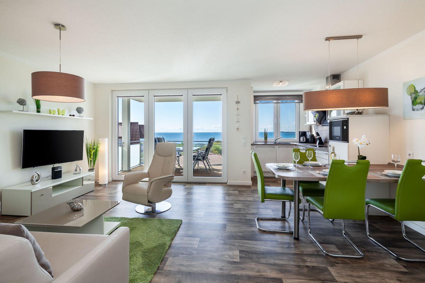 Die 1-, 2- und 3- Raum Ferienwohnungen in den Meeresblick Residenzen sind nicht nur großzügig geschnitten und komfortabel eingerichtet, die meisten verfügen darüber hinaus über eine traumhafte Aussicht über Südost Rügen und die weite Ostsee. Kostenloses WLan ist in dieser Residenzanlage selbstverständlich. Pro Ferienwohnung steht Ihnen ein PKW-Stellplatz (kostenfrei) zur Verfügung.