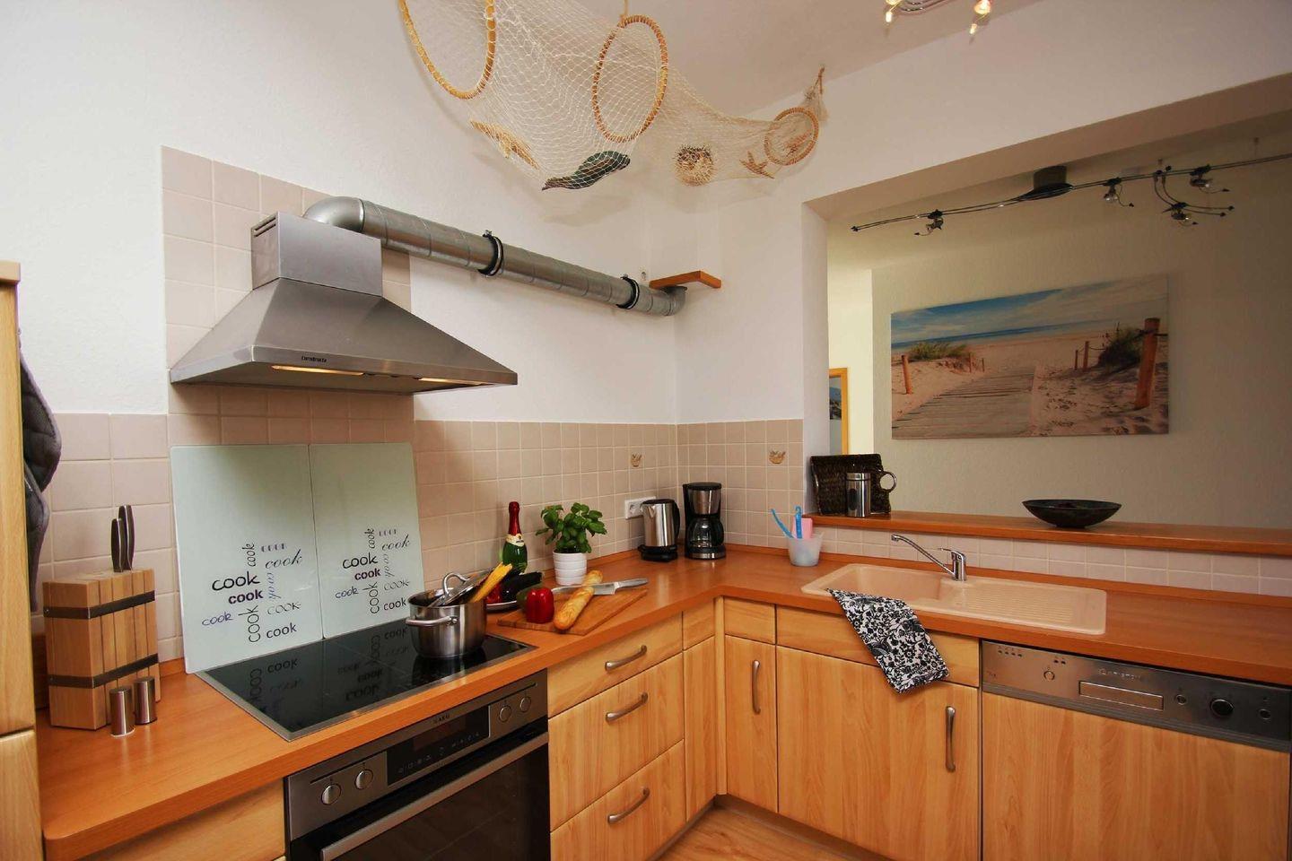 KÜCHE // Küchezeile, 4-Felder Ceranherd, Kühlschrank, Spülmaschine, Mikrowelle, Toaster, Wasserkocher, Kaffeemaschine, reichlich Besteck, Geschirr und Küchenutensilien ++