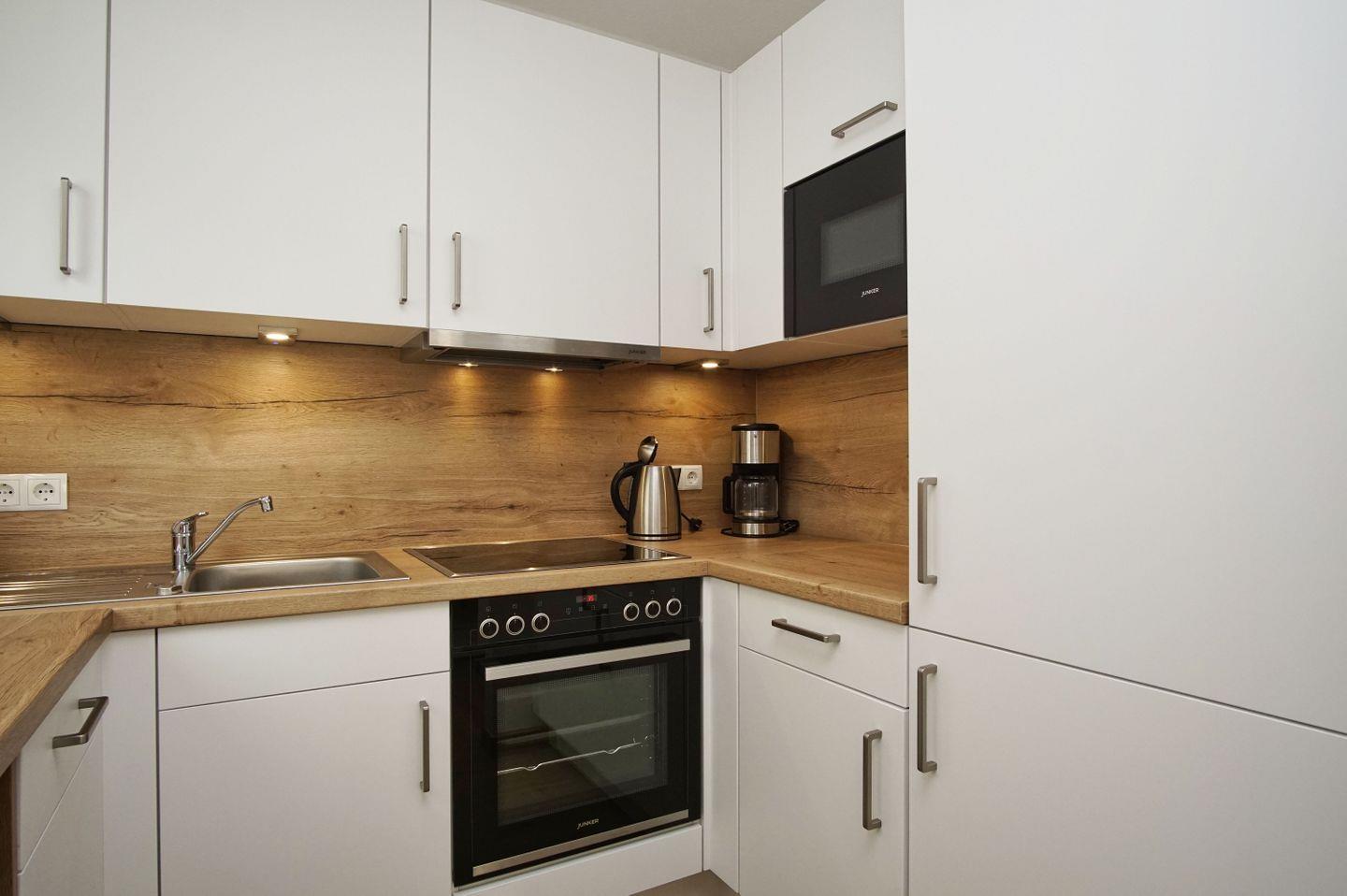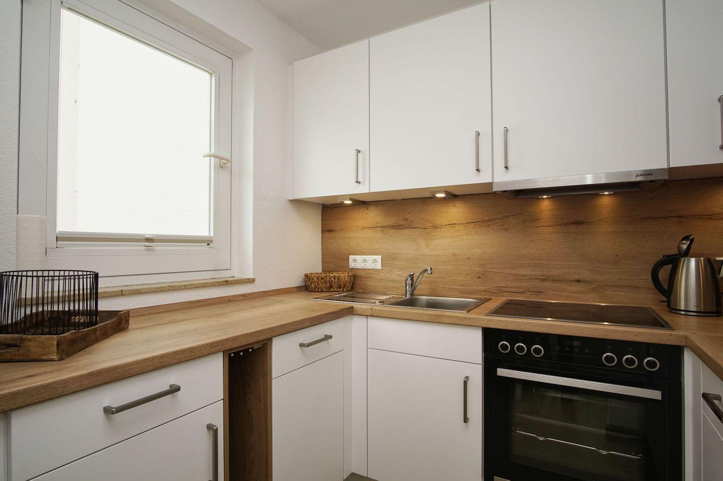 KÜCHE // offene Küche, Ceranfeld, Spülmaschine, Kühlschrank mit Gefrierfach, Backofen, Toaster, Wasserkocher, Kaffeemaschine, reichlich Besteck, Geschirr und Küchenutensilien ++