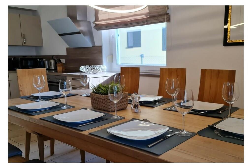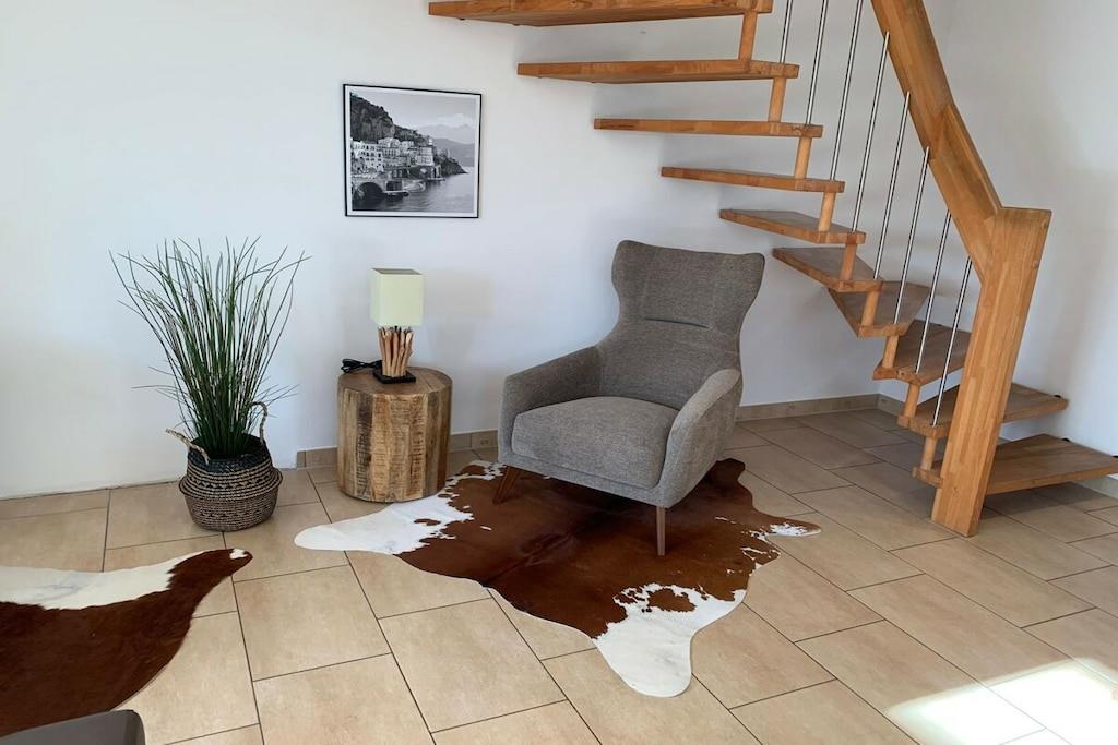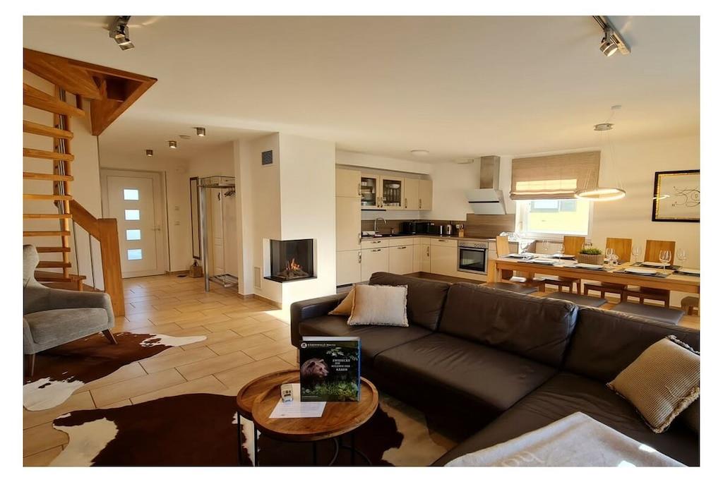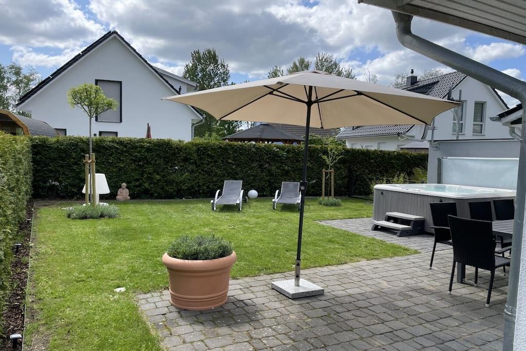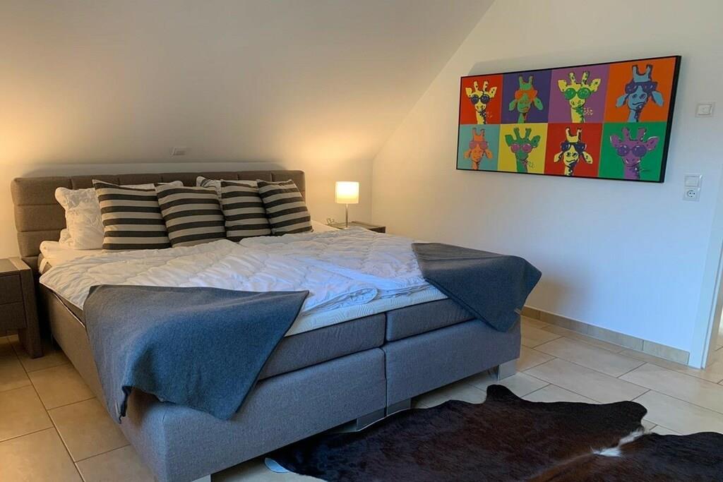 Das Luxus-Ferienhaus ist mit viel Liebe zum exklusiven Detail ausgestattet. Es bietet Ihnen alles, was Sie für Ihren entspannten und erholsamen Urlaub benötigen: 4 Schlafzimmer, 2 Tageslicht-Bäder, eine Sauna, einen ganzjährig auf 38 Grad beheizten Außen-Whirlpool, einen eingezäunten Garten sowie eine große Einfahrt mit bis zu 3 Pkw-Parkplätzen und Ladestation für Elektrofahrzeuge. Der Ladestrom wird Ihnen separat berechnet. Der große Wohnbereich mit offener Küche und Zugang zum Garten lädt Sie zum Verweilen ein und schafft Platz zum Essen in gemütlicher Runde. Vor dem Gaskamin können Sie auf der Sofalandschaft mit Musik oder Sky TV lauschige Abende verbringen und den Tag ausklingen lassen. Insbesondere in der kälteren Jahreszeit können Sie hier herrlich entspannen. Im Ferienhaus finden Sie eine umfangreiche Sammlung an Filmen, Büchern und Spielen vor. Die 3 der 4 Schlafzimmer haben ebenfalls alle einen Flat-TV und sind jeweils mit großzügigen 180 x 200 cm großen Boxspringbetten für einen herrlich erholsamen Schlaf ausgestattet. Eines der Schlafzimmer hat ein Einzelbett. Ihre kleine Urlaubs-Wellness-Oase umfasst Rainshower-Duschen in den großzügigen Bädern sowie die Sauna im Hauptbad. Im Garten befindet sich der ganzjährig nutzbare Außen-Whirlpool, der selbst im Winter mit angenehmen 38 Grad Wassertemperatur zum Relaxen einlädt. Der Garten ist teileingezäunt. Auf der Terrasse steht für Sie ein Grill für schmackhafte Barbecues bereit. Das Ferienhaus wird über eine einzeln steuerbare Fußbodenheizung wohlig für Sie beheizt. Die Fenster und die Terrassentür verfügen über Insektenschutzgitter. Für unsere kleinen Gäste gibt es einen Hochstuhl sowie ein Kinderbett. Eine Waschmaschine mit Wäschetrockner sowie ein Bügeleisen und -brett stehen für Sie – im Fall der Fälle – ebenfalls kostenlos zur Verfügung. Unsere Einfahrt bietet Ihnen die Möglichkeit, bis zu 3 Fahrzeuge nebeneinander zu parken.