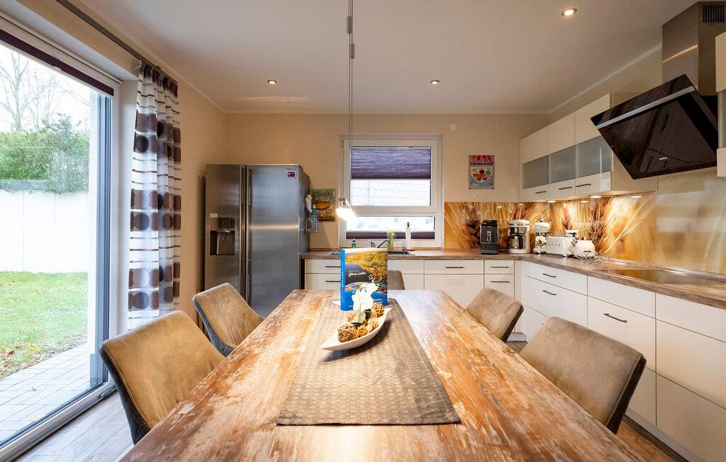 Erleben Sie unvergessliche Tage in diesem luxuriösen Ferienhaus, das modernen Wohnkomfort mit gemütlichem Ambiente verbindet. Betreten Sie den großzügigen Wohnbereich und lassen Sie sich von der warmen Atmosphäre empfangen. Machen Sie es sich auf dem komfortablen Sofa bequem, genießen Sie den Kamin und einen Film auf dem großen Fernseher. Bereiten Sie in der offenen, voll ausgestatteten Küche Ihre Lieblingsgerichte zu und genießen Sie dabei den Blick in den Garten. Ein großer Esstisch und stilvolles Design schaffen den idealen Rahmen für gemeinsame Mahlzeiten. Entspannen Sie auch in der privaten Sauna.