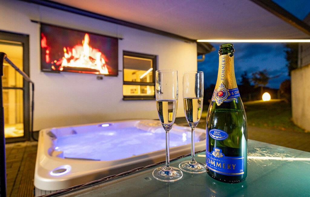 Treten Sie hinaus auf die Terrasse und atmen Sie tief durch. Nutzen Sie den Whirlpool unter freiem Himmel, während Sie den Sonnenuntergang oder einen Film auf dem Outdoor-Bildschirm verfolgen. Stoßen Sie mit einem Glas Sekt an und lassen Sie den Tag entspannt ausklingen. Der gepflegte Garten bietet viel Platz für gemeinsame Stunden im Freien oder ruhige Momente allein.