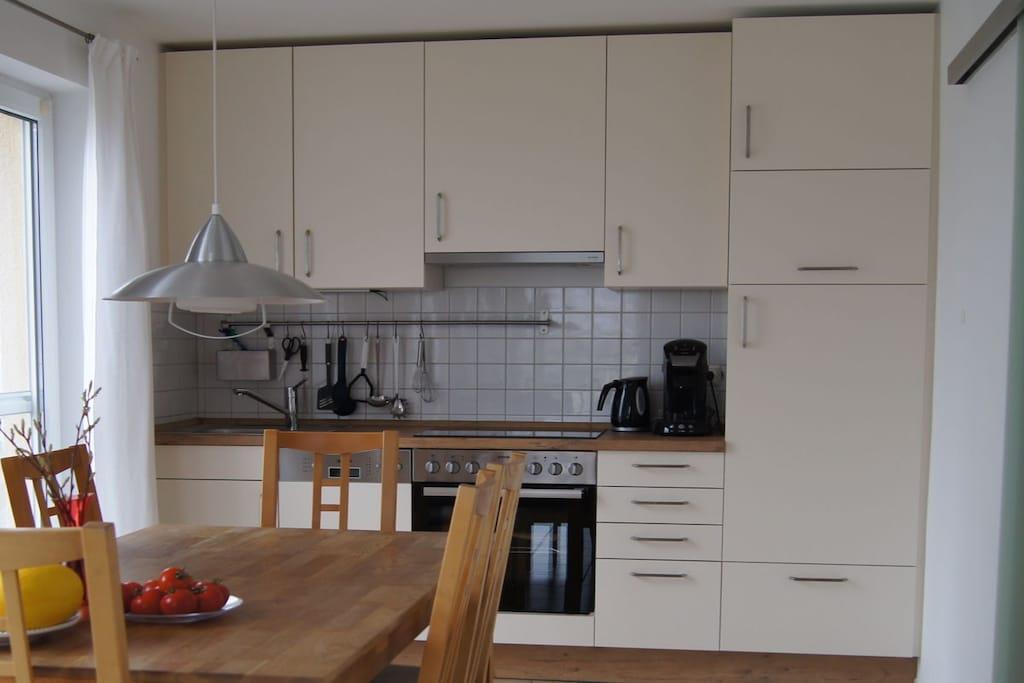 Das Haus ist komfortabel eingerichtet. Wohnzimmer: Sitzecke mit TV, DVD, Stereoanlage und Kaminofen. Offene Küche: Ceranfeldherd mit Backofen, Geschirrspüler, Mikrowelle und Kühlschrank mit Tiefkühlfach; Esstisch für alle Personen. Badezimmer im Erdgeschoss mit Badewanne und Duschkabine, im Obergeschoss mit Duschkabine . Schlafzimmer: jeweils mit einem Doppelbett (einteilige Matratze 160*200) und Kleiderschrank. Auf beiden Seiten des Hauses befindet sich eine Terrasse. Ein dritter Sitzplatz ist mit Blick auf den hauseigenen Blumenhang angelegt. Gartenmöbel und ein Holzkohlegrill sind vorhanden. Ein Stellplatz für Ihren PKW ist vor dem Haus.