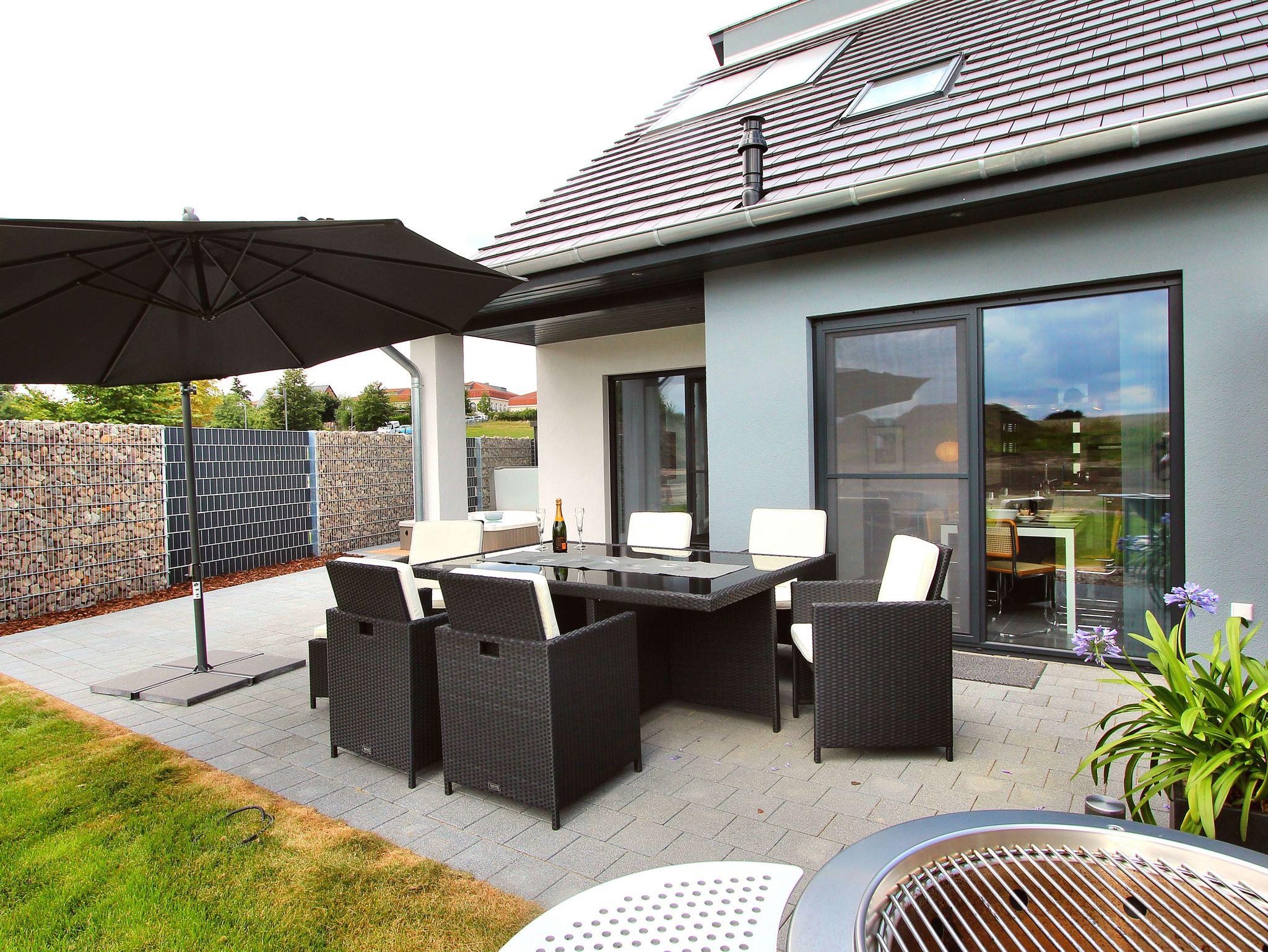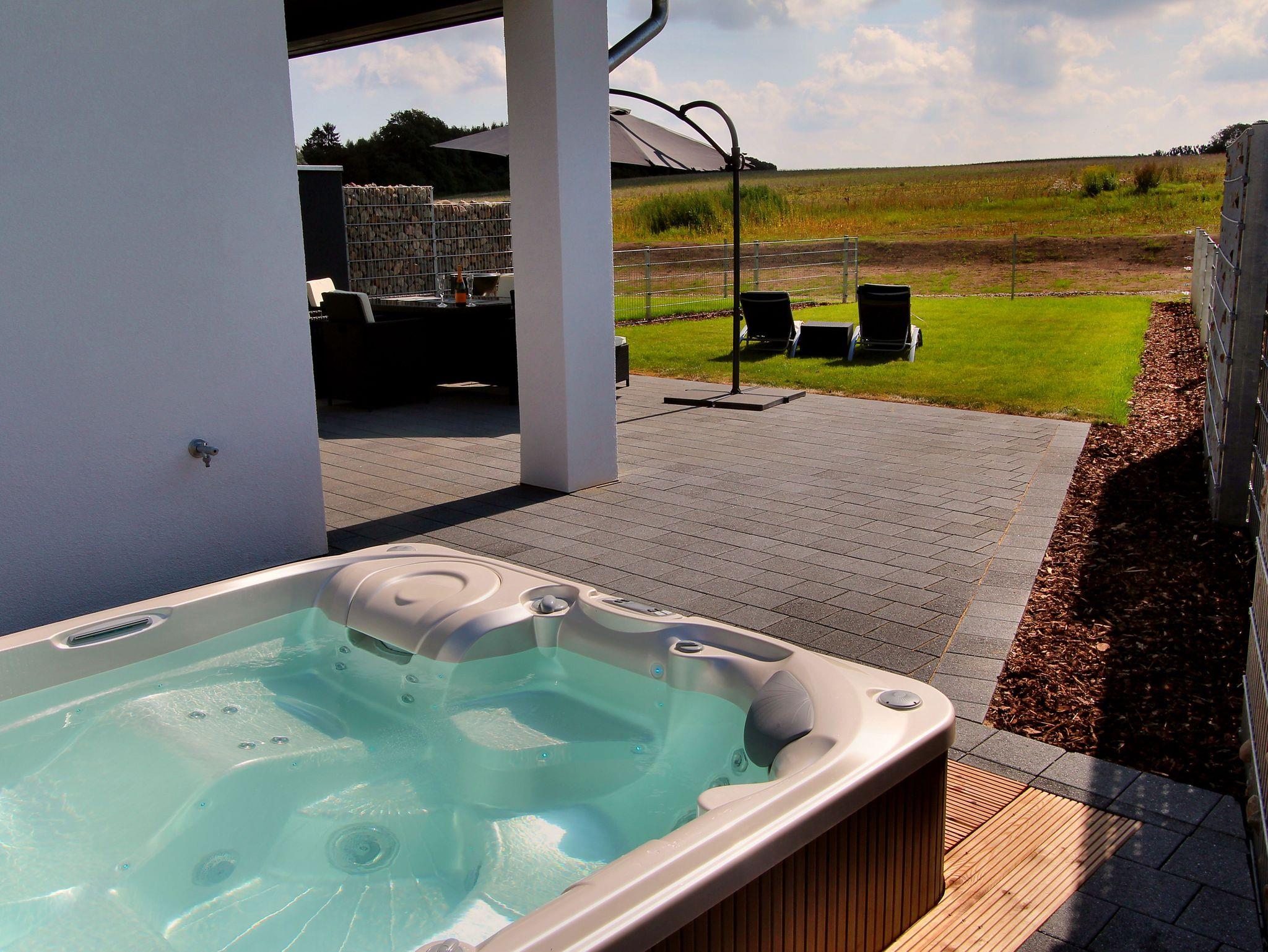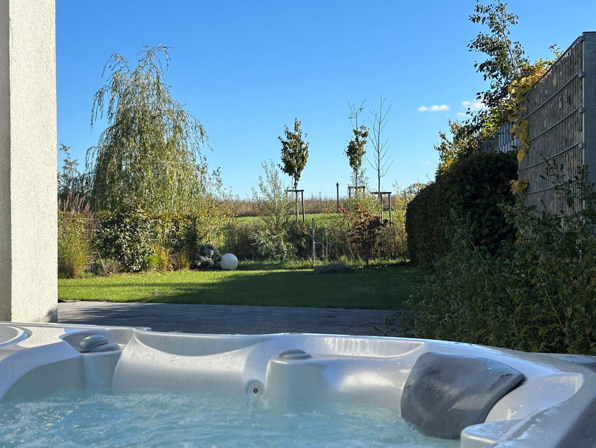 Der Außenbereich verfügt über einen Garten, eigenem mit 38 Grad beheizten Whirlpool und einem Holzkohlegrill. Auf der Terrasse finden Sie einen großen Gartentisch, 6 Gartensessel, 2 Hocker und 2 Sonnenliegen (alle mit Auflagepolstern) und einen Sonnenschirm.