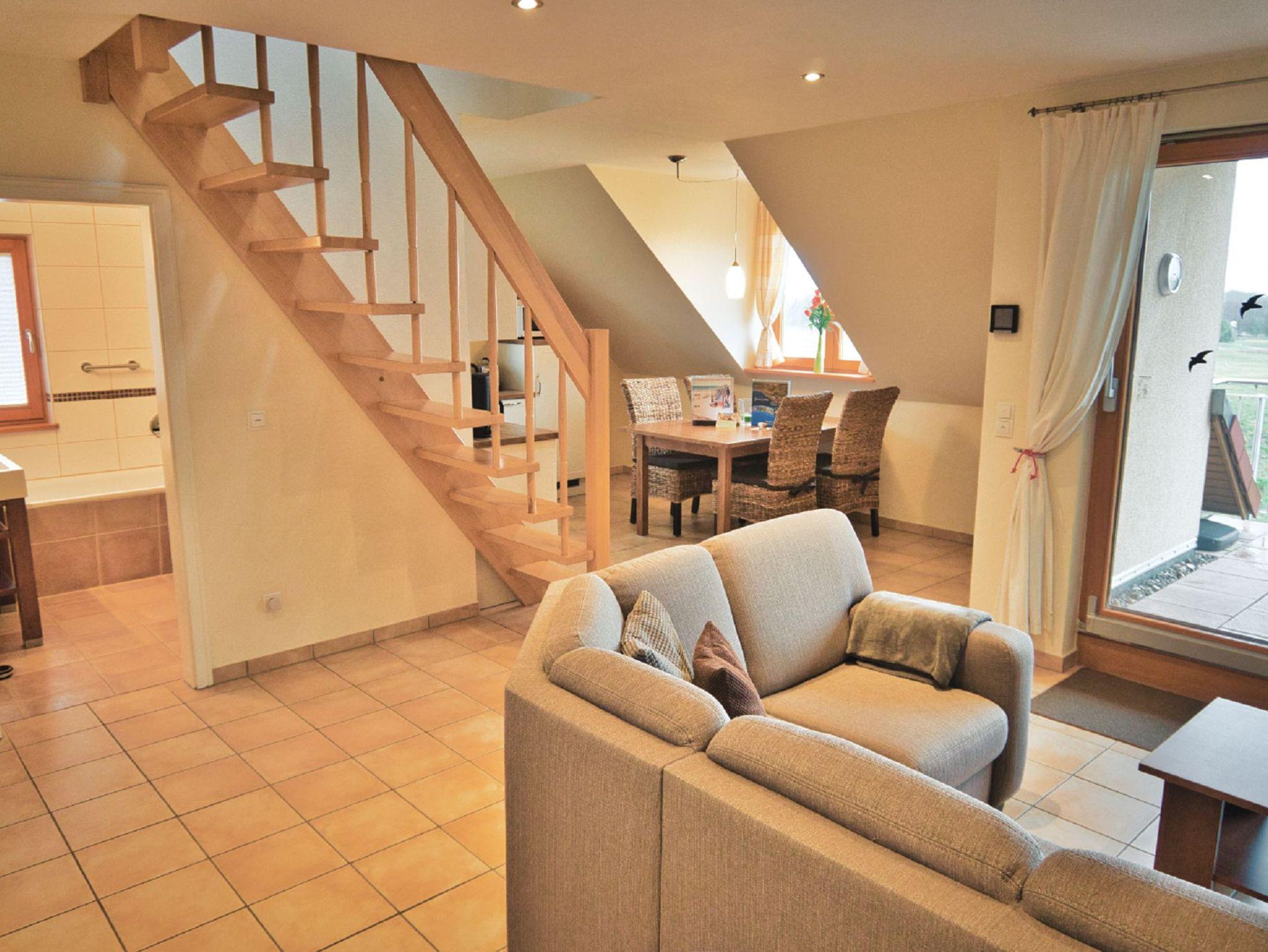Der erweiteter Aufenthaltsbereich im ausgebauten Spitzboden bietet Ihnen mit einer Vollspektruminfrarot-Sauna (Wärme dringt binnen kurzer Zeit tief in den Körper ein und beeinflusst positiv den Stoffwechsel sowie die Muskulatur, der Körper entschlackt, Giftstoffe scheidet er aus. Gewinnbringend ist natürlich auch die psychische und physische Entspannung). Hier können Sie sich danach auf dem (Schlaf-) Sofa erholen. Ebenfalls befindet sich dort ein TV und Schreibtisch sowie eine sep. Toilette mit Waschbecken im Spitzboden.