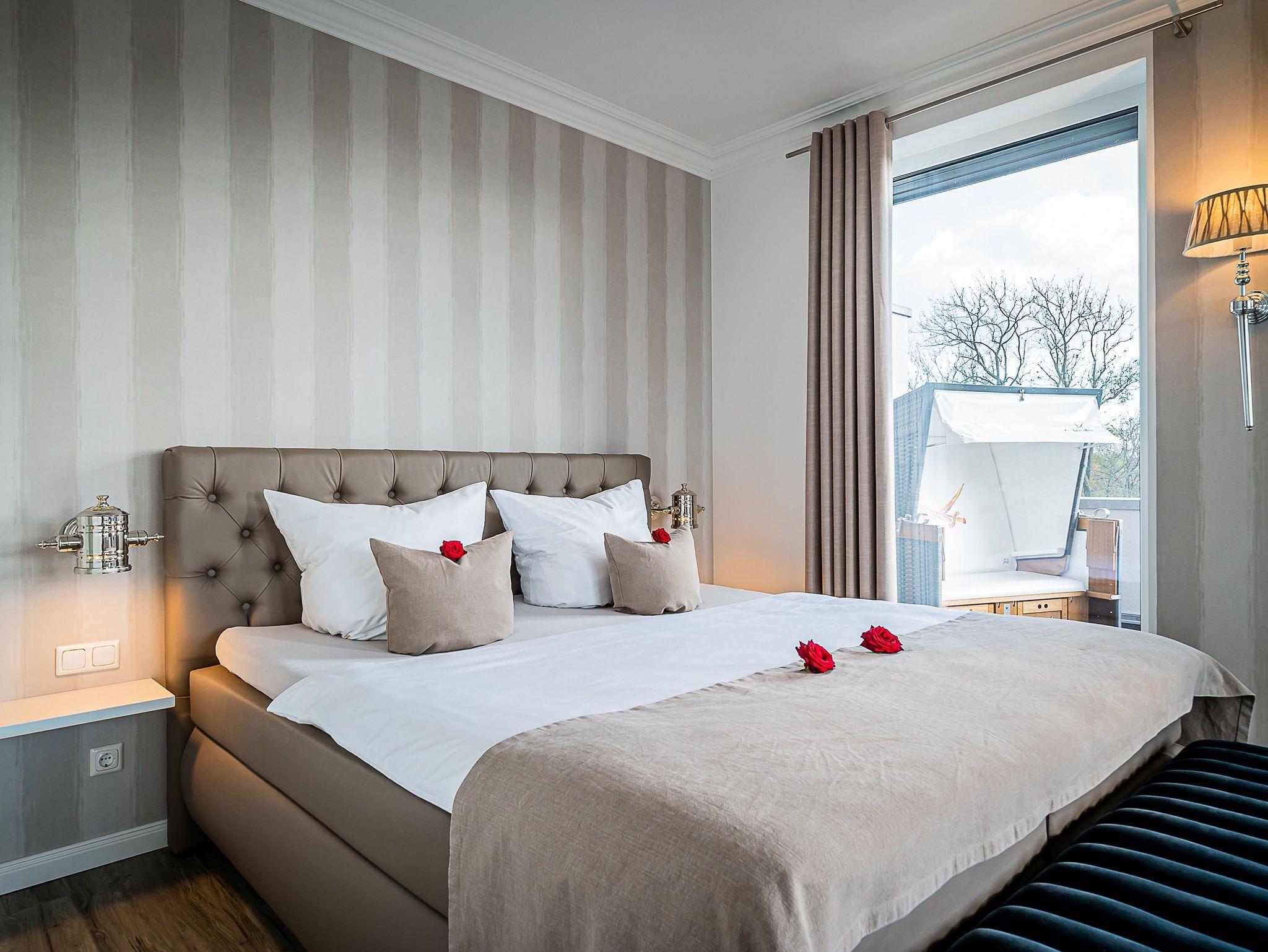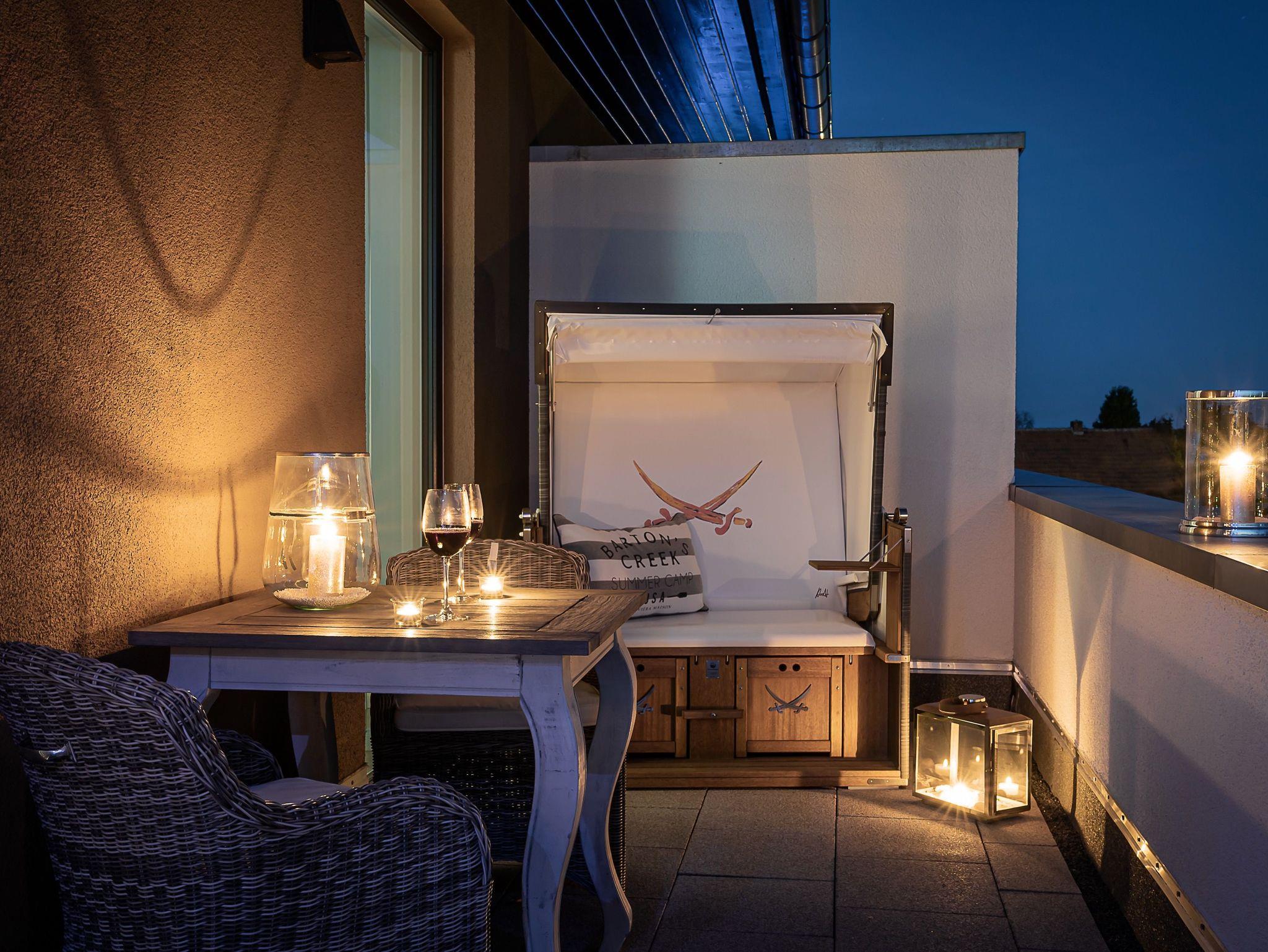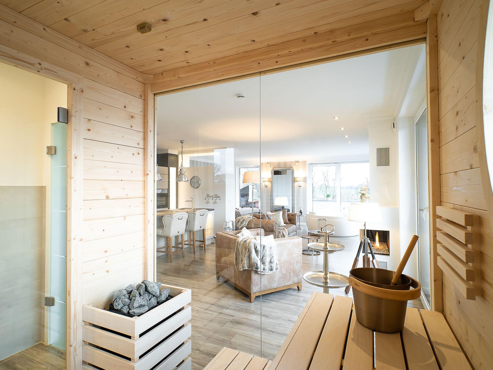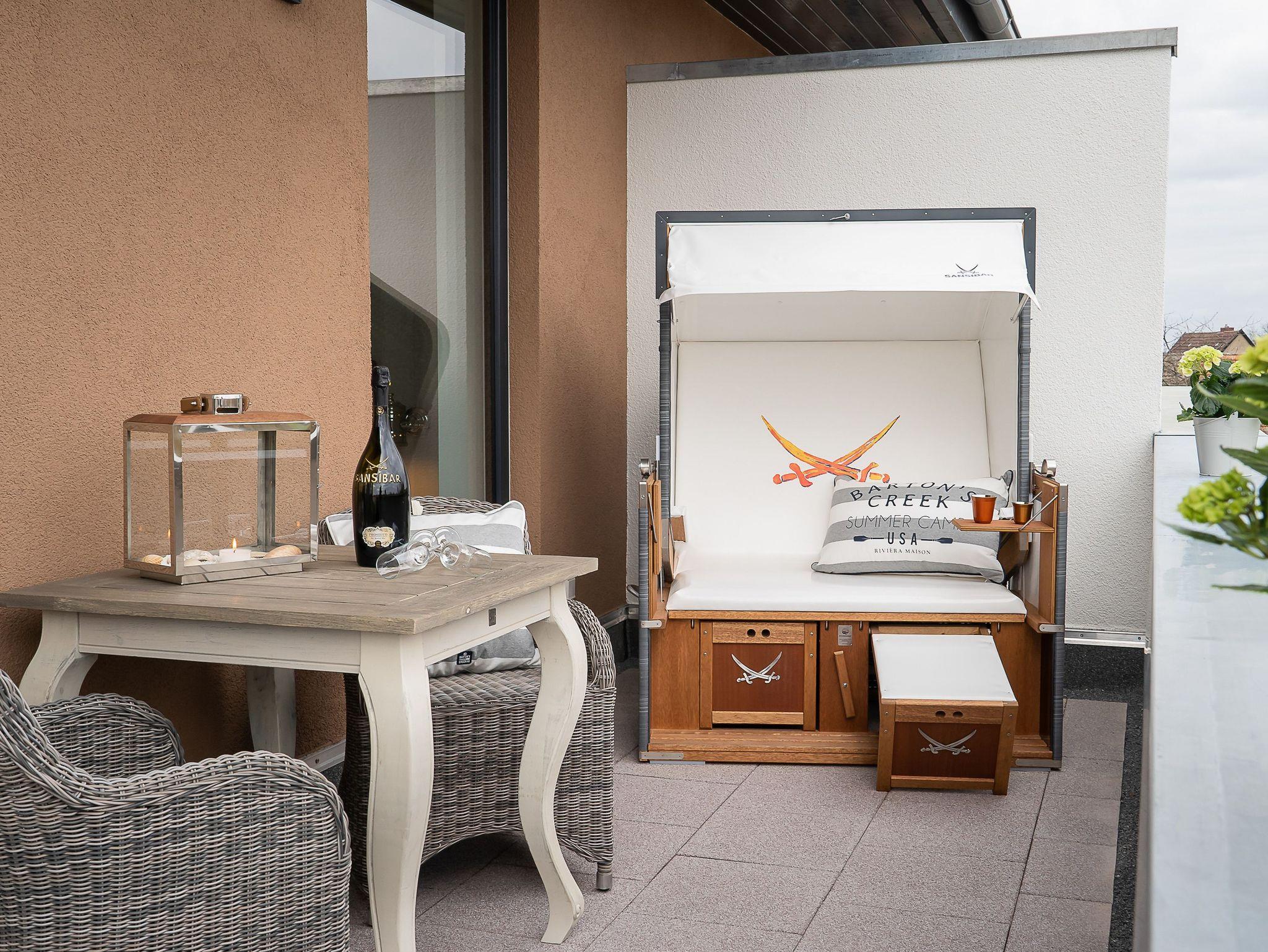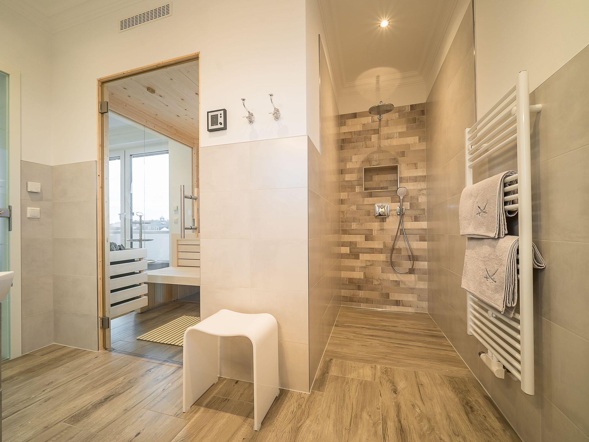 Das Tageslichtbad mit Spa-Charakter verfügt über eine verglaste Sauna, Raindance-Dusche und hochwertige Ausstattung. Eine umlaufende Sonnen-Dachterrasse bietet Outdoormöbel und einen Original Sylter Strandkorb sowie einen Weber Elektrogrill.