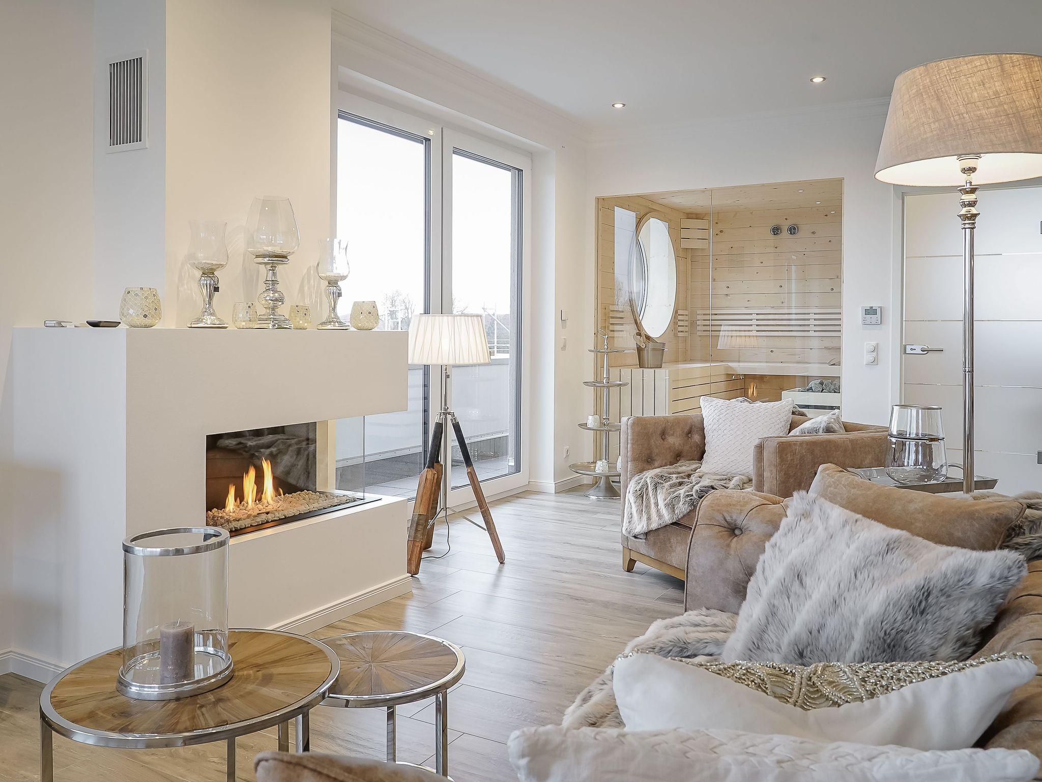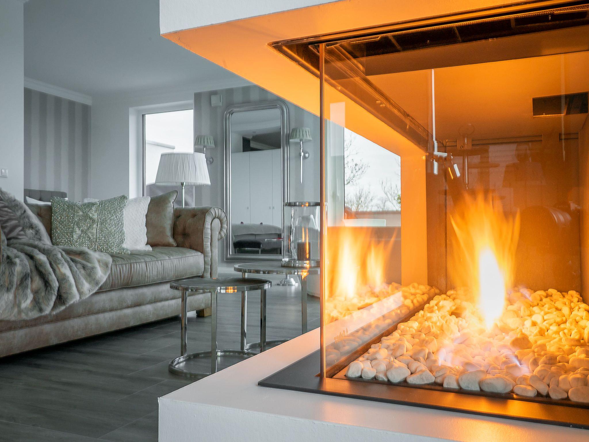 Entspannen Sie auf dem bequemen Sofa vor dem modernen Gas Kamin (mit Kohlenmonoxid Melder) und genießen Sie Unterhaltung auf dem 55-Zoll-Full-HD-Smart TV mit QLED Technologie. Ein BOSE-Soundbar sorgt für exzellenten Klang.
