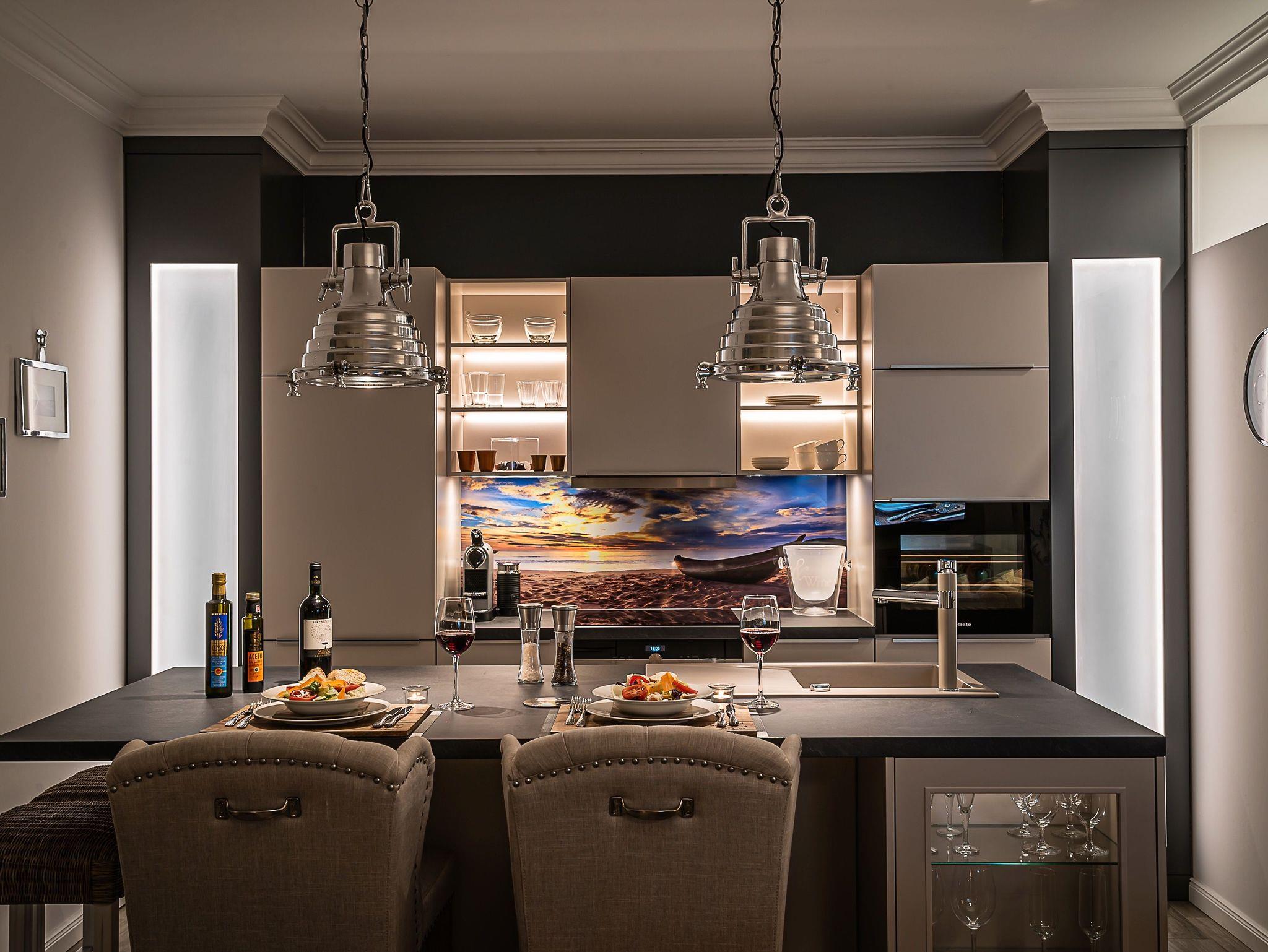 Die Luxus-Einbauküche mit Kücheninsel bietet hochwertige Elektroeinbaugeräte und zahlreiches Zubehör.