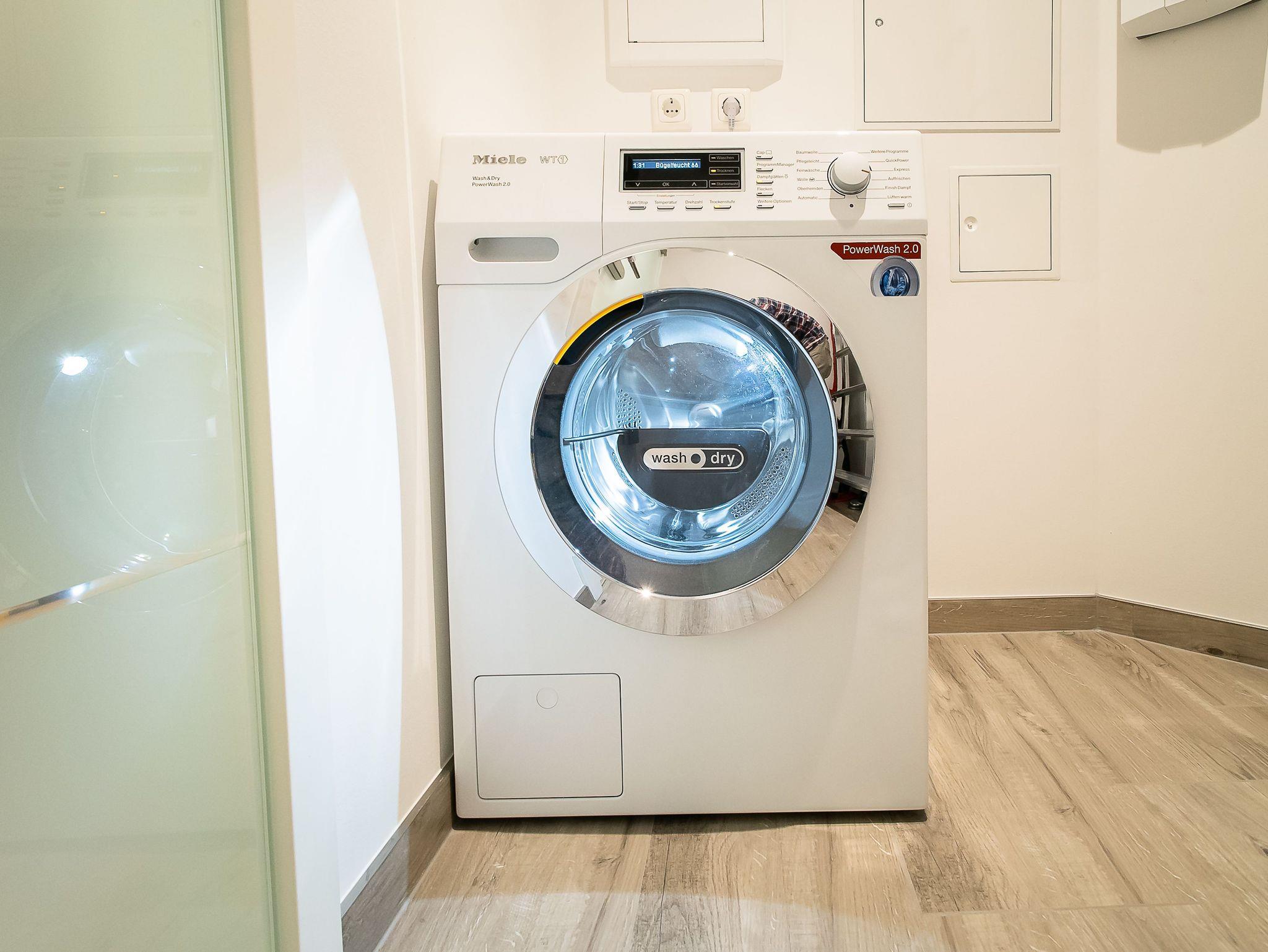 Ein Miele Waschtrockner steht zur kostenfreien Nutzung bereit. Ein kostenfreier Parkplatz befindet sich am Haus.