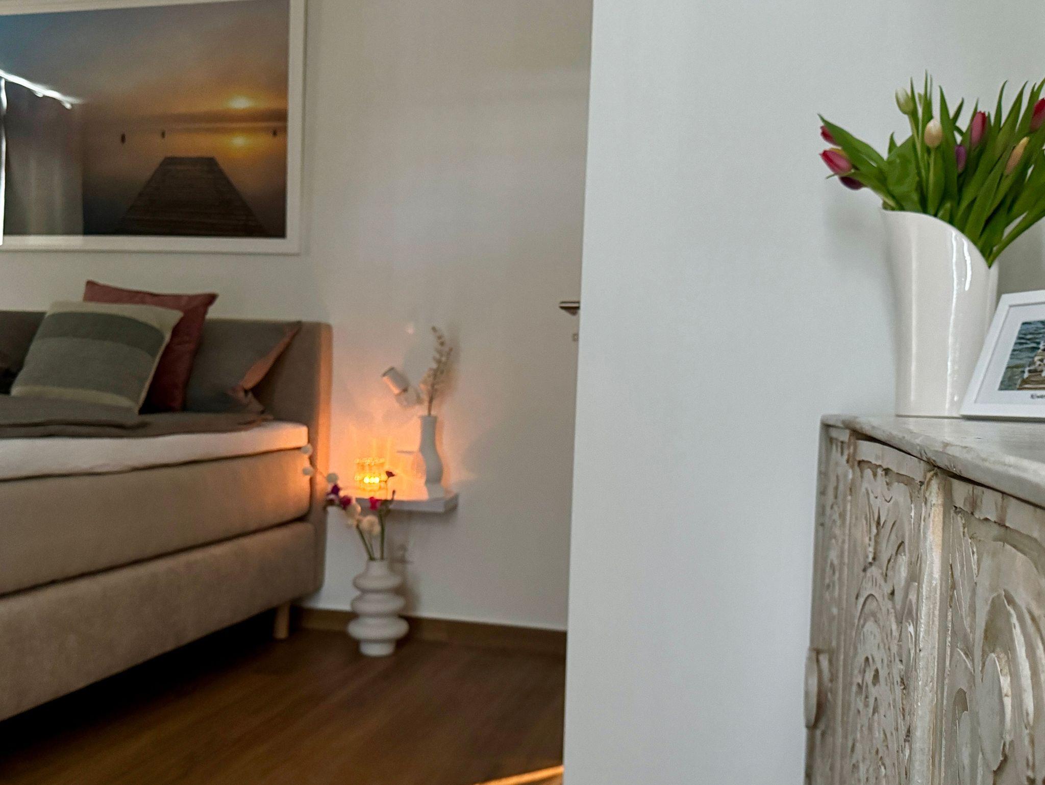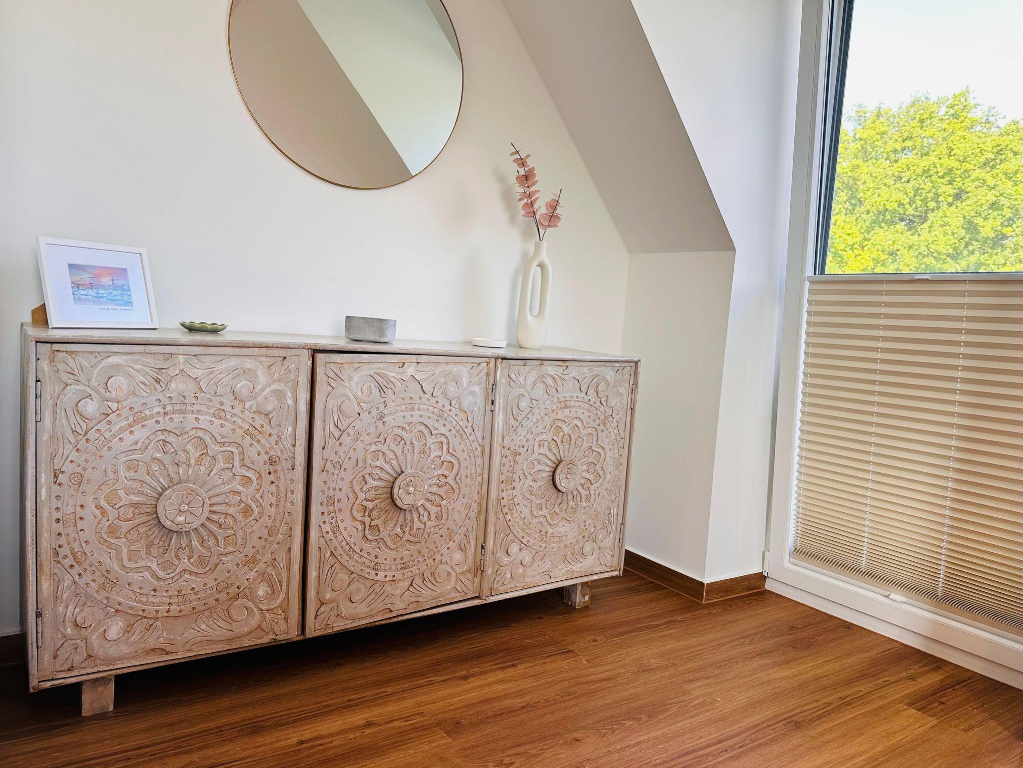 Eines der Schlafzimmer verfügt außerdem über einen Balkon mit Blick in Richtung Schlosspark und lädt zu atemberaubenden Sonnenuntergängen mit weitem Blick über die Natur ein. Ebenso befindet sich auf der Etage das zweite, sehr helle Bad mit Dusche sowie ein separater Raum mit Waschmaschine und Trockner.