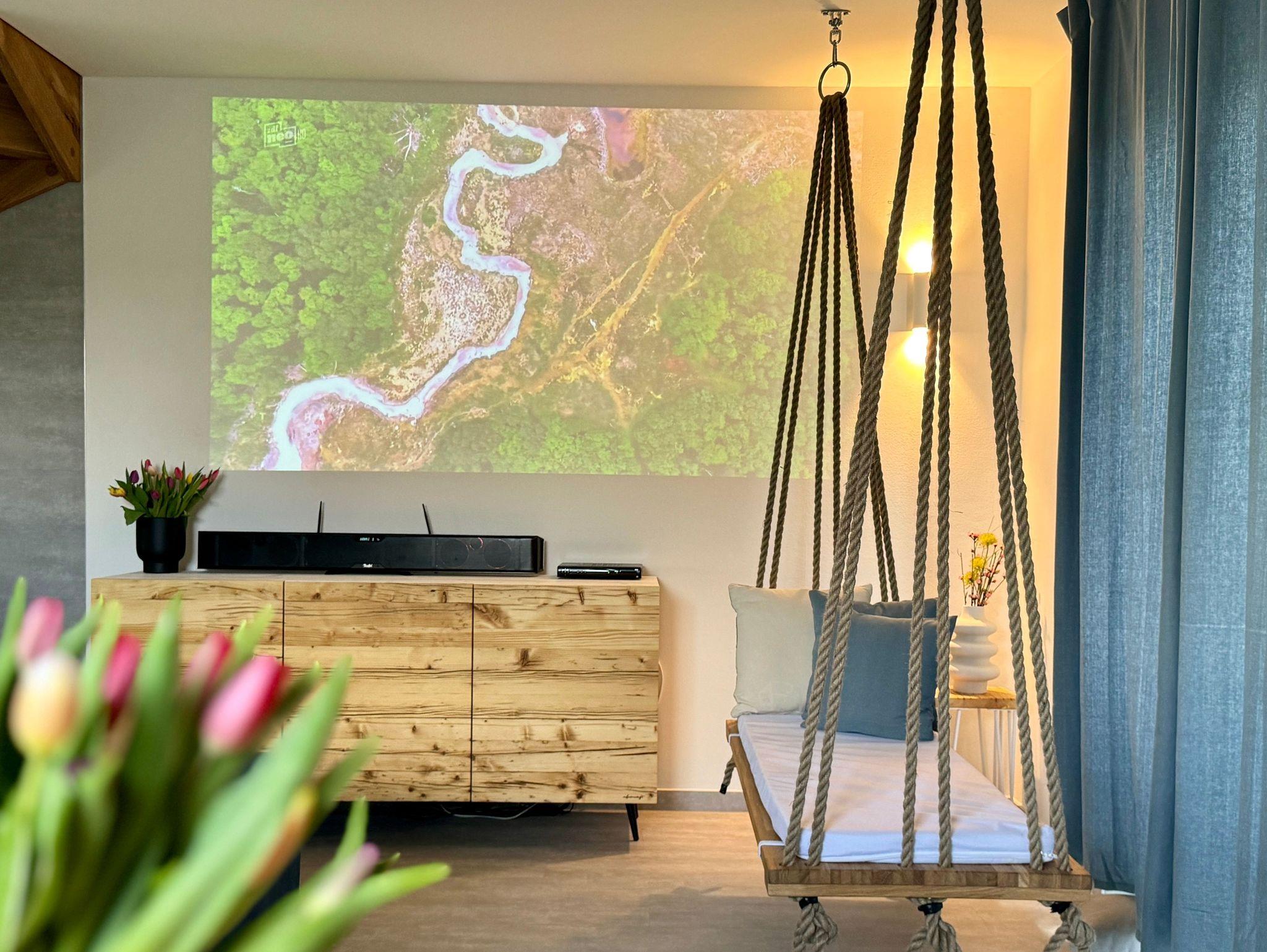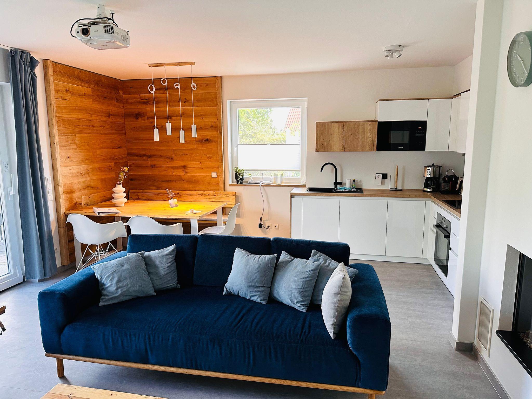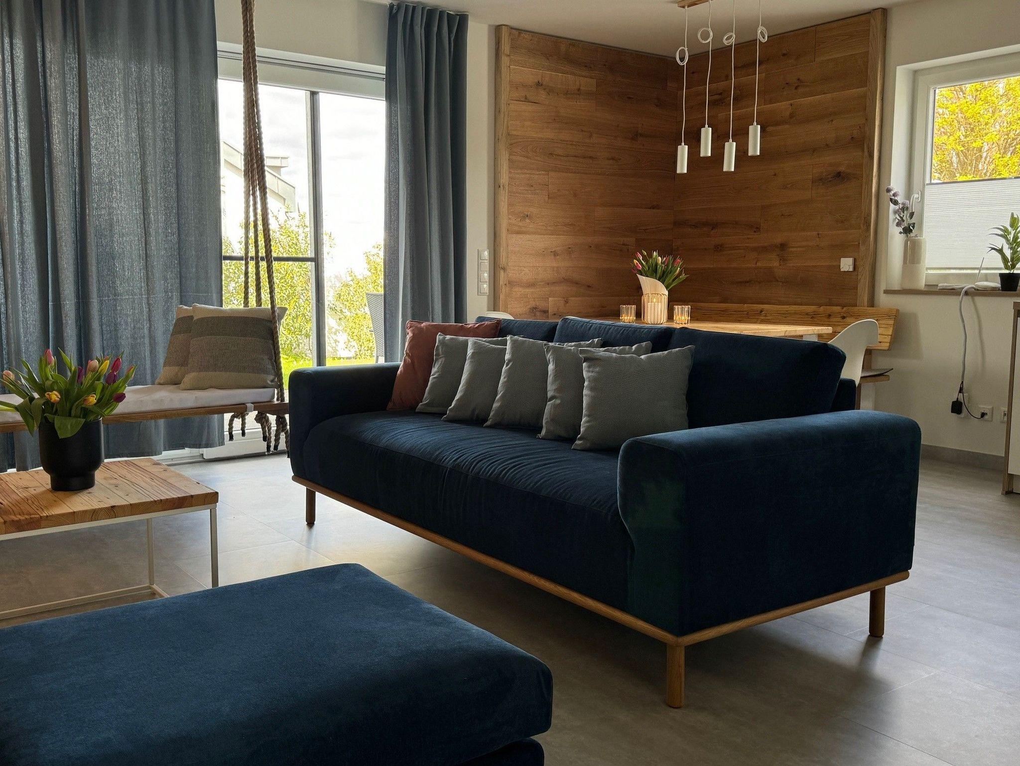Genießen Sie ein Ambiente der Extraklasse mit hochwertigen Designmöbeln und einer geschmackvollen Einrichtung. Unser großzügiges Ferienhaus besticht durch seinen gemütlichen und gleichsam modern designten Charakter und bietet bis zu sechs Personen eine unvergessliche Urlaubsheimat. Das Leben spielt sich im großen Wohn-/Essbereich ab. Die loungeartige Sofaecke mit Indoor-Schaukel, dem Beamer mit Sky und dazwischen der moderne Glaskamin, wird sicherlich einer Ihrer Lieblingsplätze sein. Der große Esstisch und die offene, moderne und gut ausgestattete Küche bilden eine harmonische Einheit, die zum gemeinsamen Kochen und Genießen einladen. Im Erdgeschoss liegt ein helles, modernes und großzügiges Badezimmer mit Dusche und einer echten Wohlfühlsauna. Die beiden großen Schlafzimmer im Obergeschoss sind mit großen Hotelboxspringbetten aus der fränkischen Bettwarenfabrik ausgestattet, sodass Sie Schlafkomfort und Erholung auf höchstem Niveau erleben.