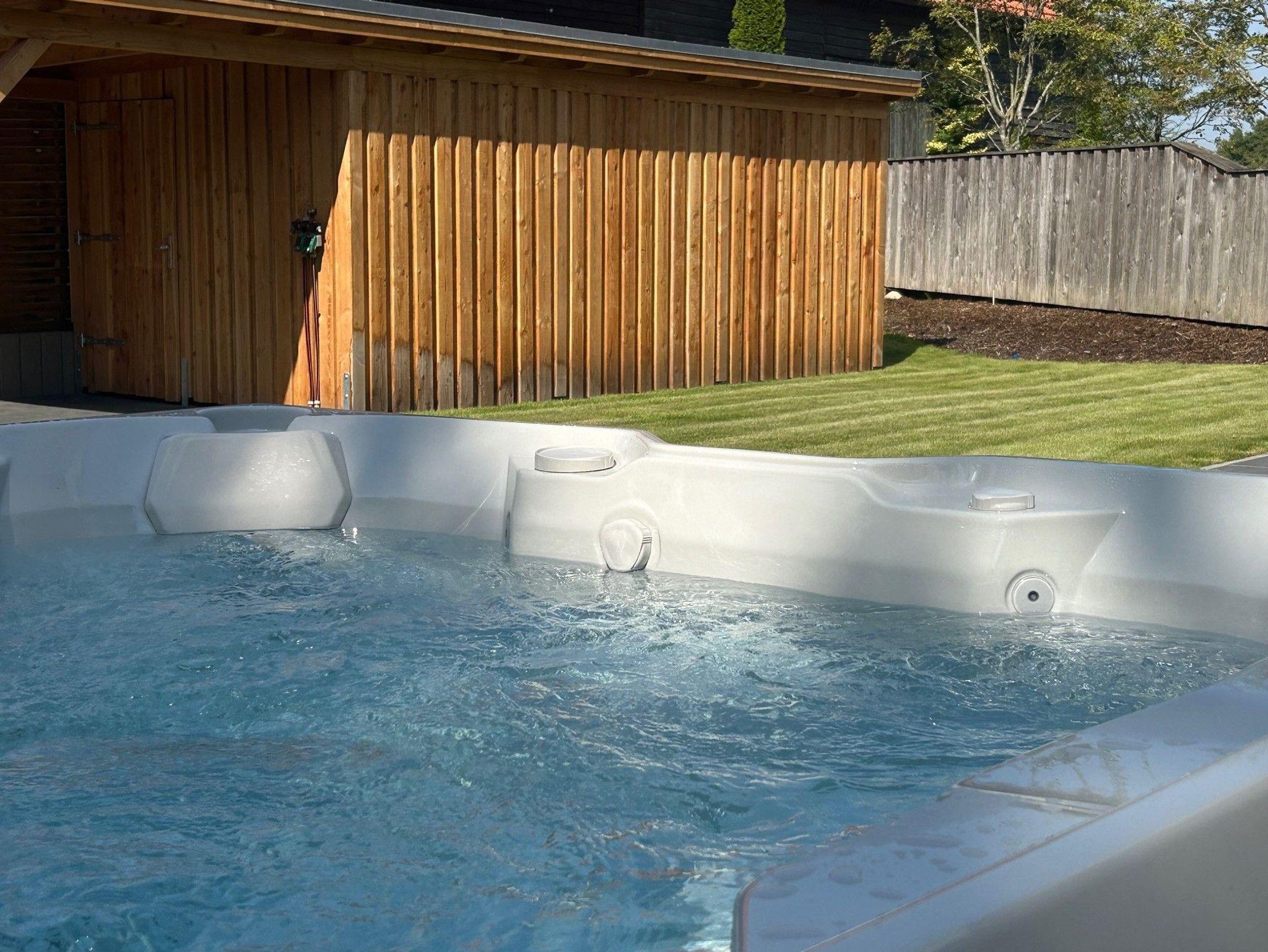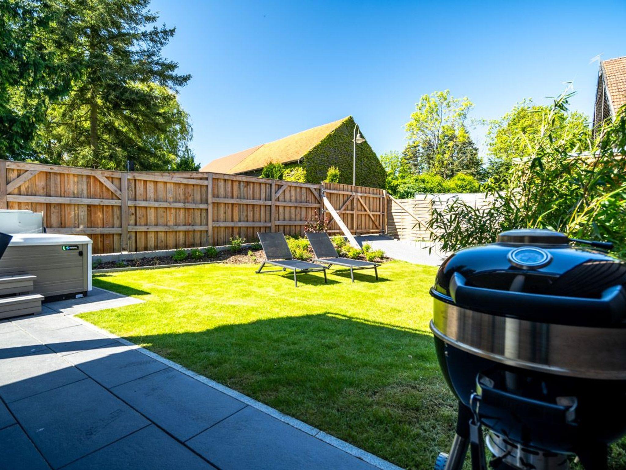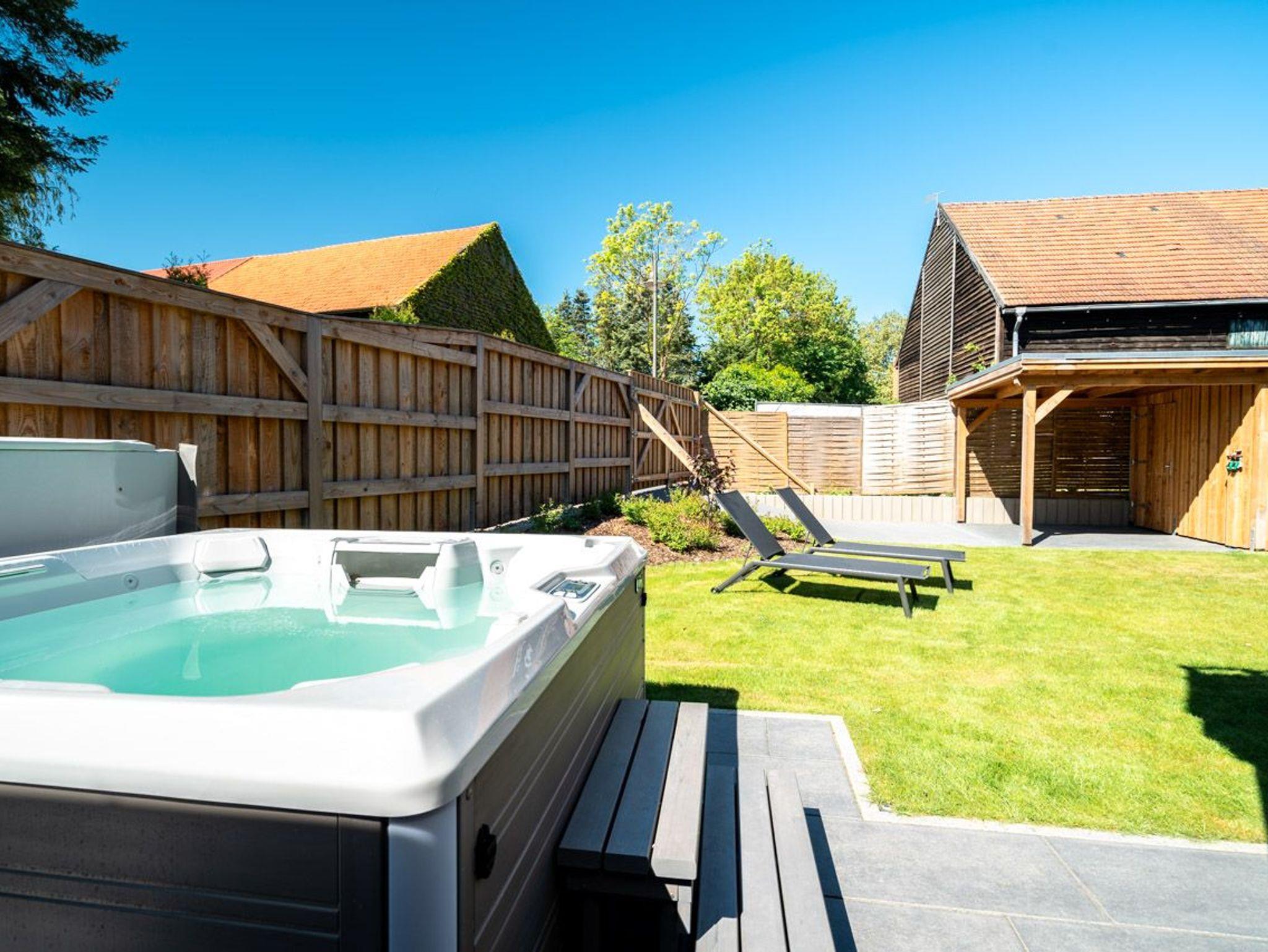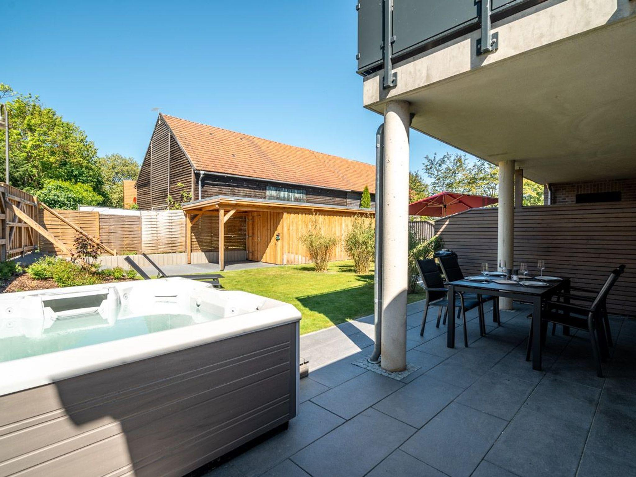 Treten Sie auf die Terrasse mit Außenwhirlpool und genießen Sie die frische Luft. Der gemeinsam genutzte Garten bietet Raum für Entspannung im Freien und lädt zu geselligen Momenten ein.