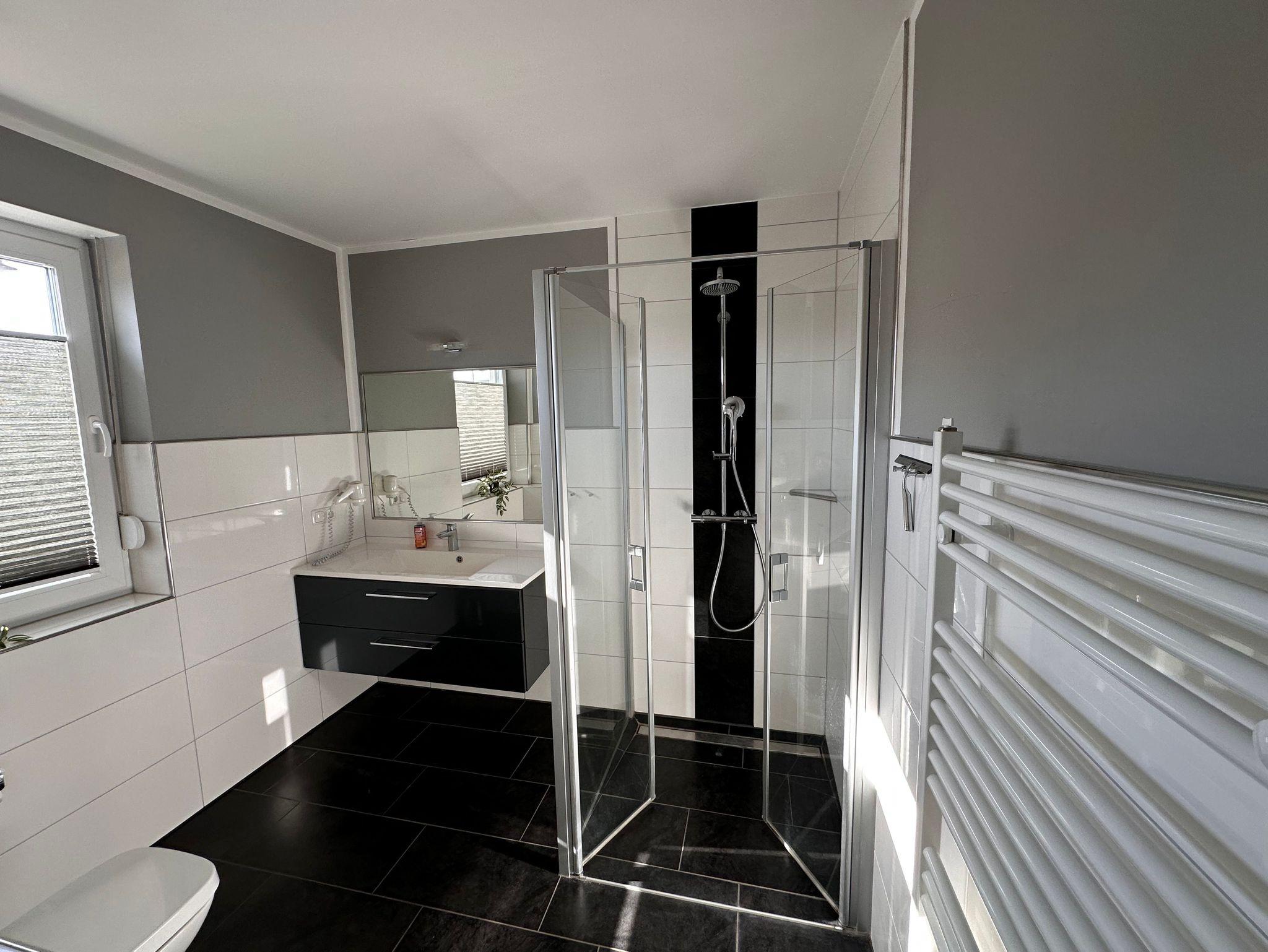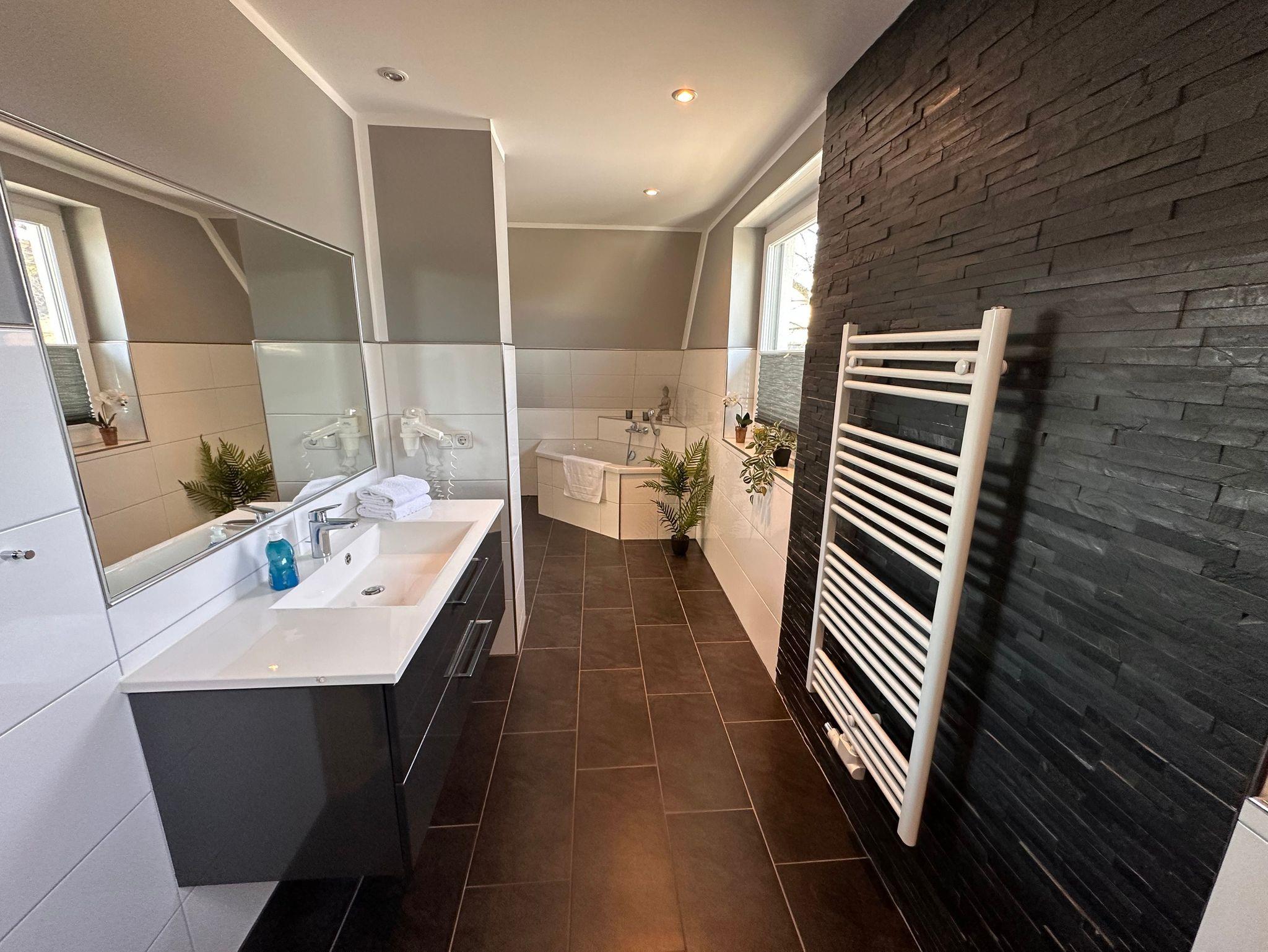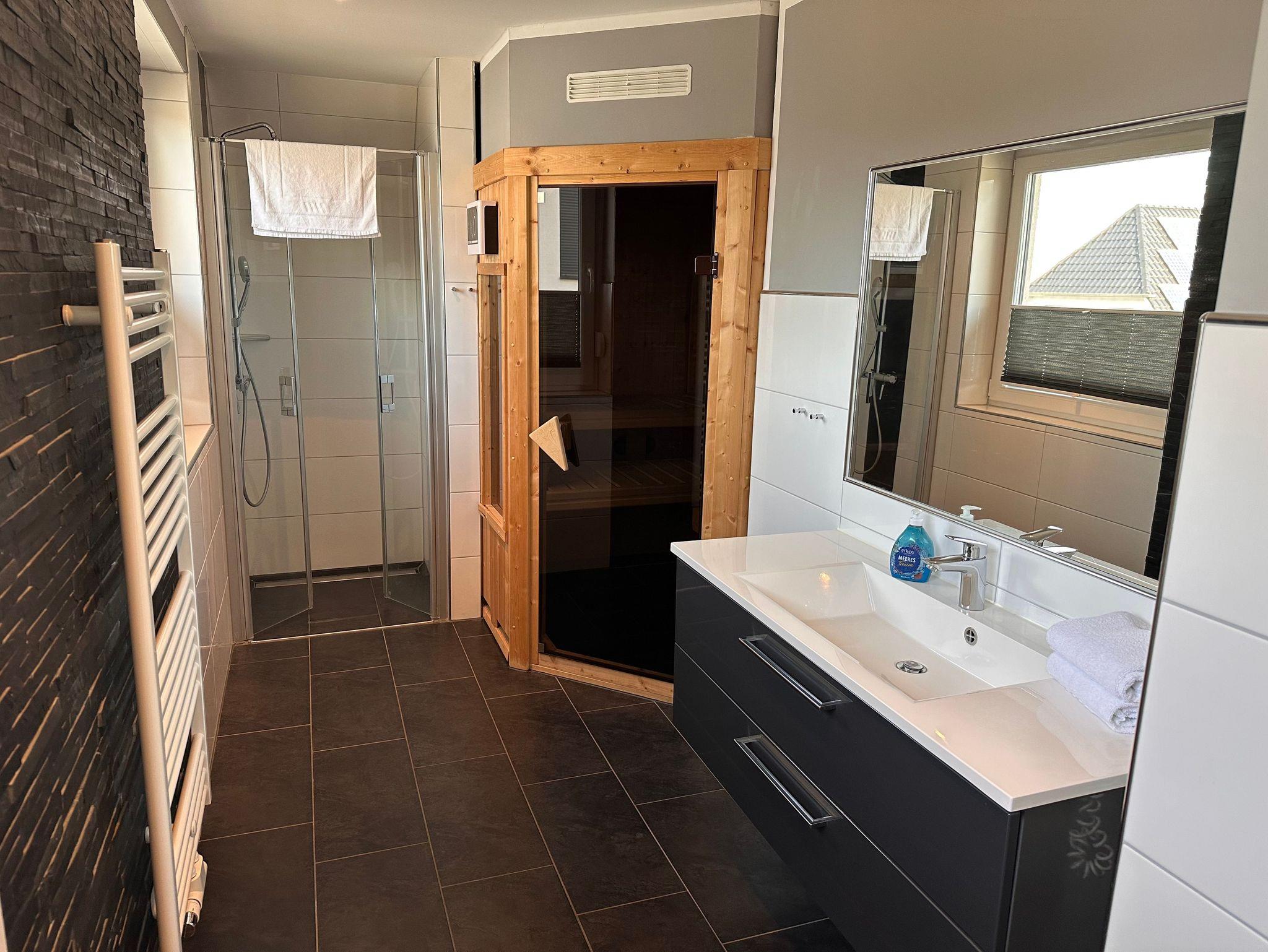 Die Bäder bieten moderne Waschtische und Raindanceduschen. Das große Bad verfügt zusätzlich über eine Badewanne und eine Sauna. Alle Räume werden über eine Fussbodenheizung beheizt..
