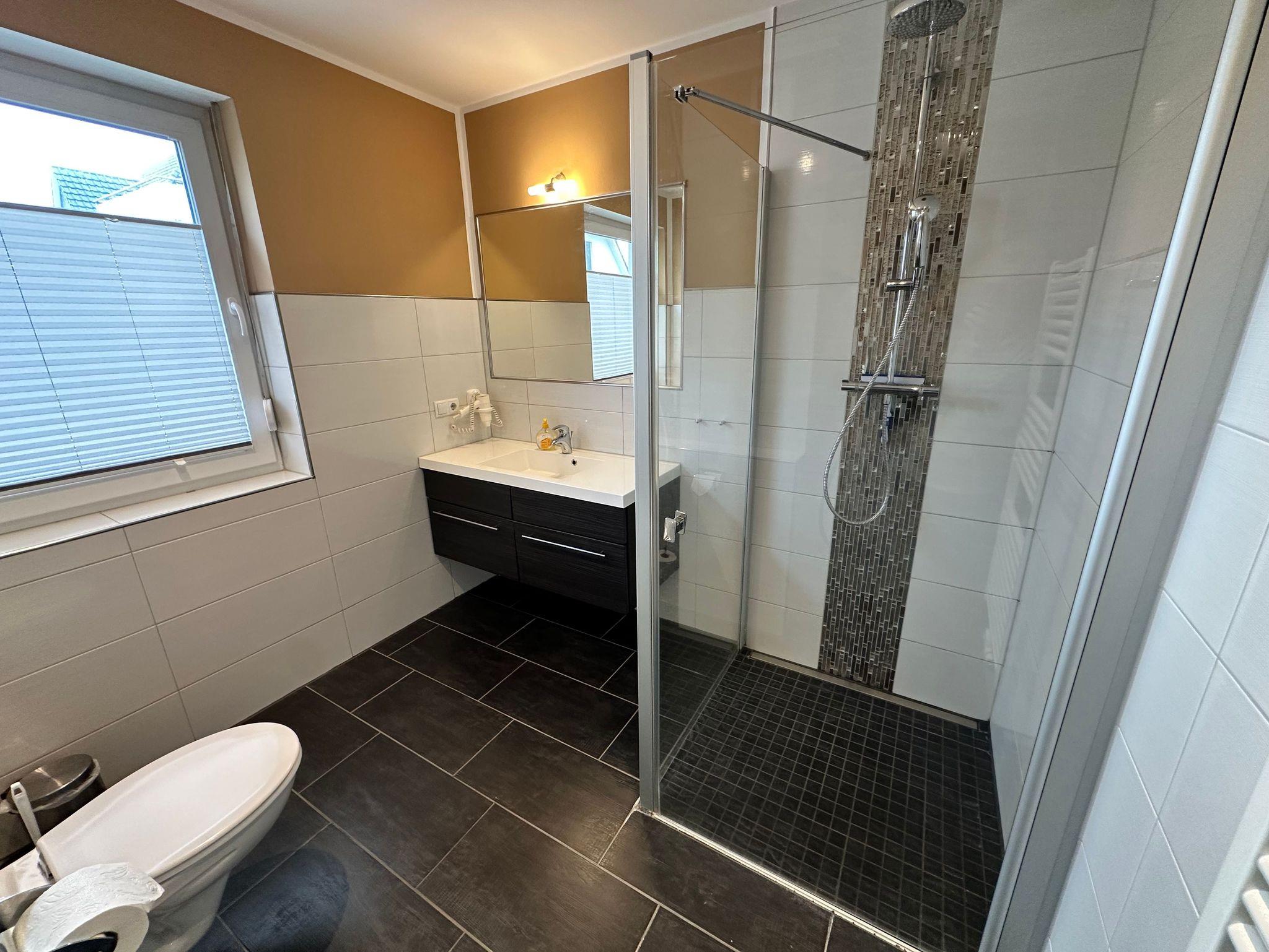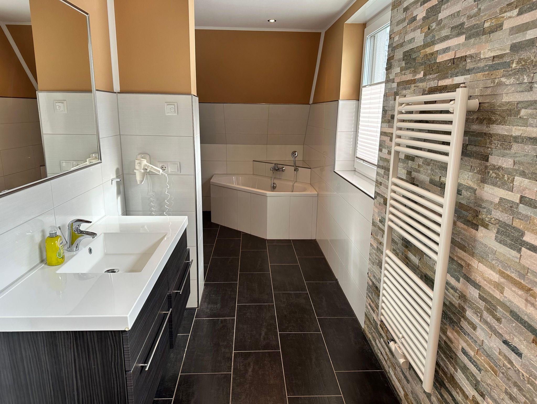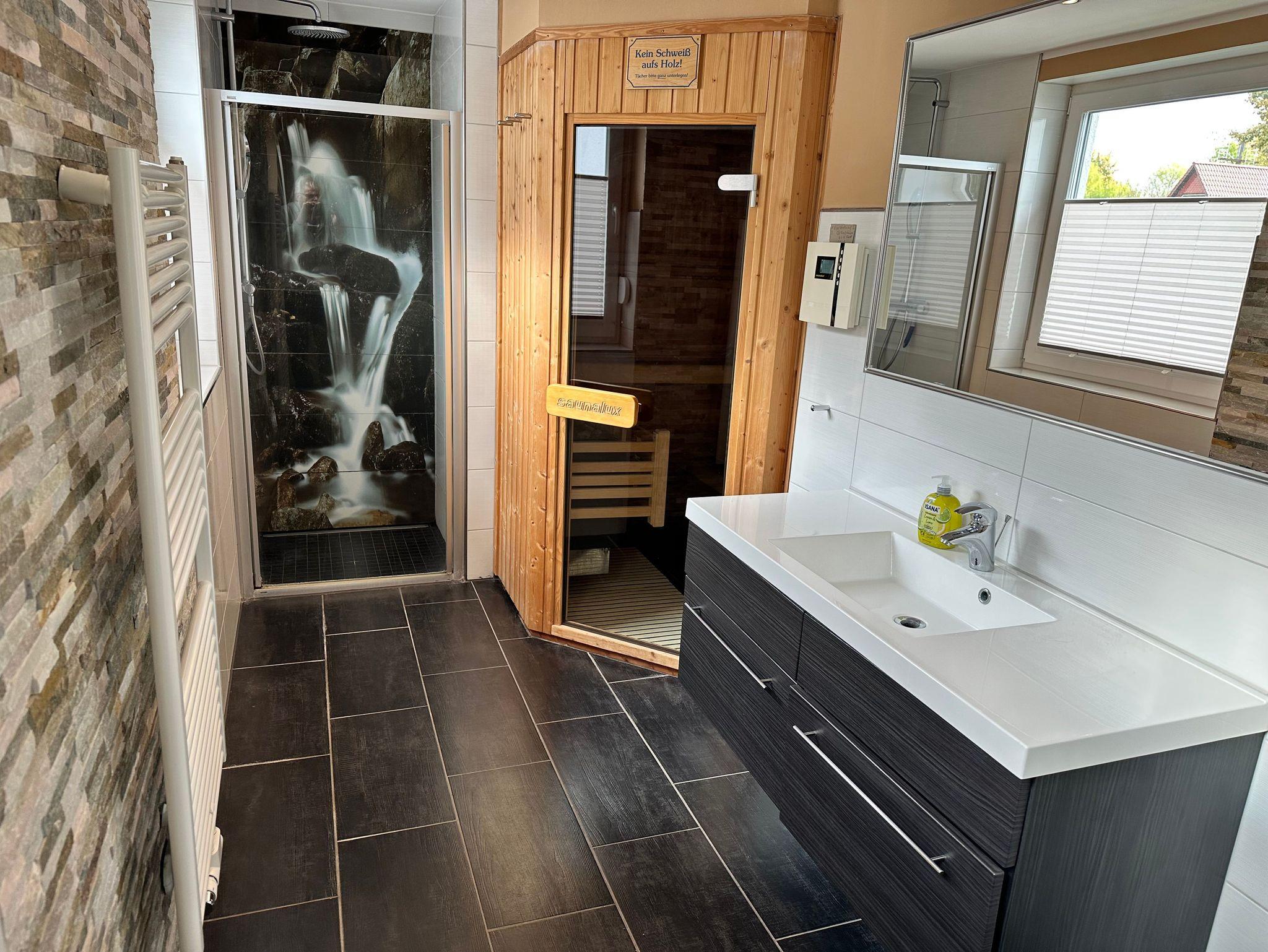 Die Bäder bieten moderne Waschtische und Raindanceduschen. Das große Bad verfügt zusätzlich über eine Badewanne und eine Sauna. Alle Räume werden über eine Fussbodenheizung beheizt..