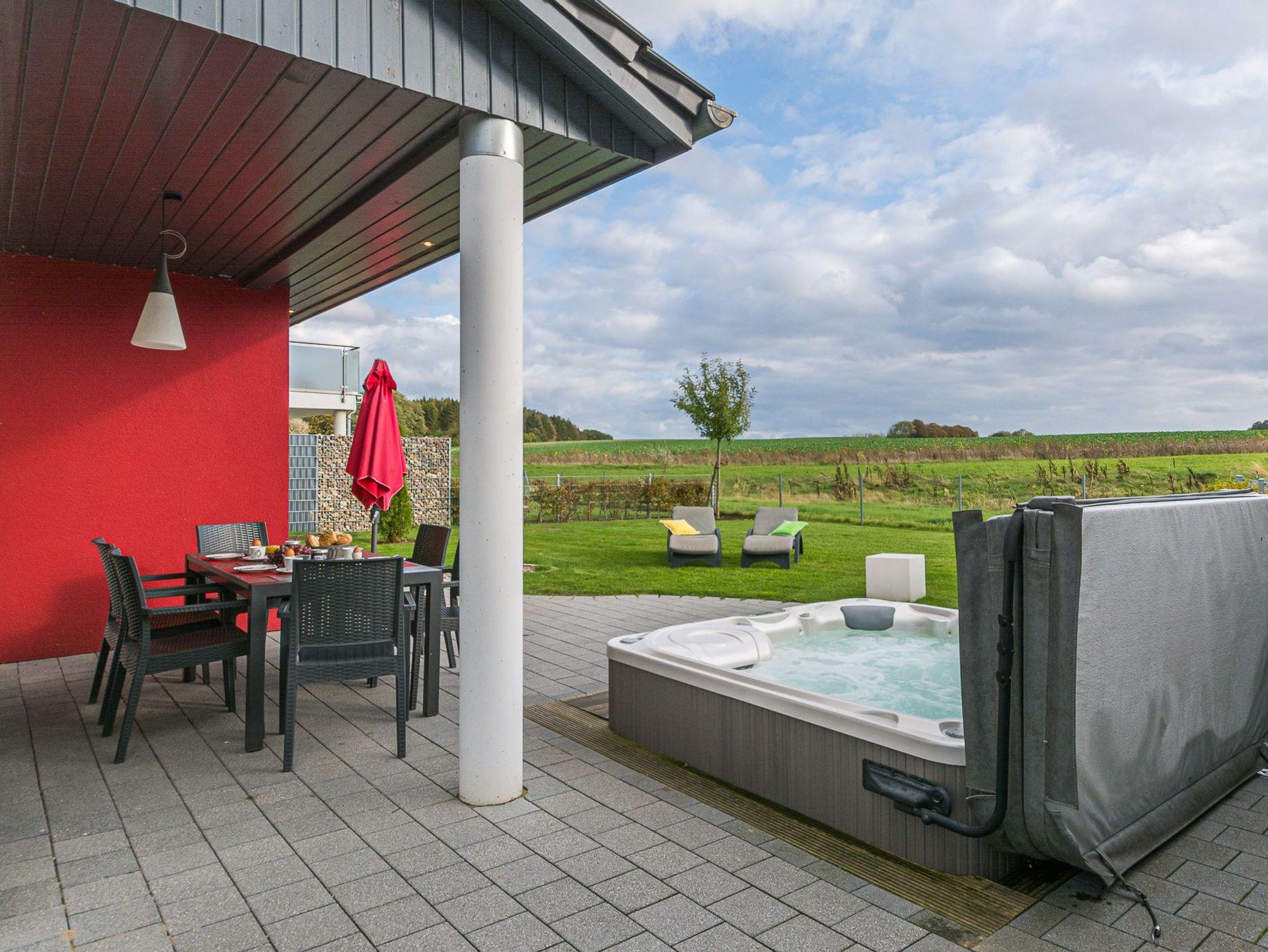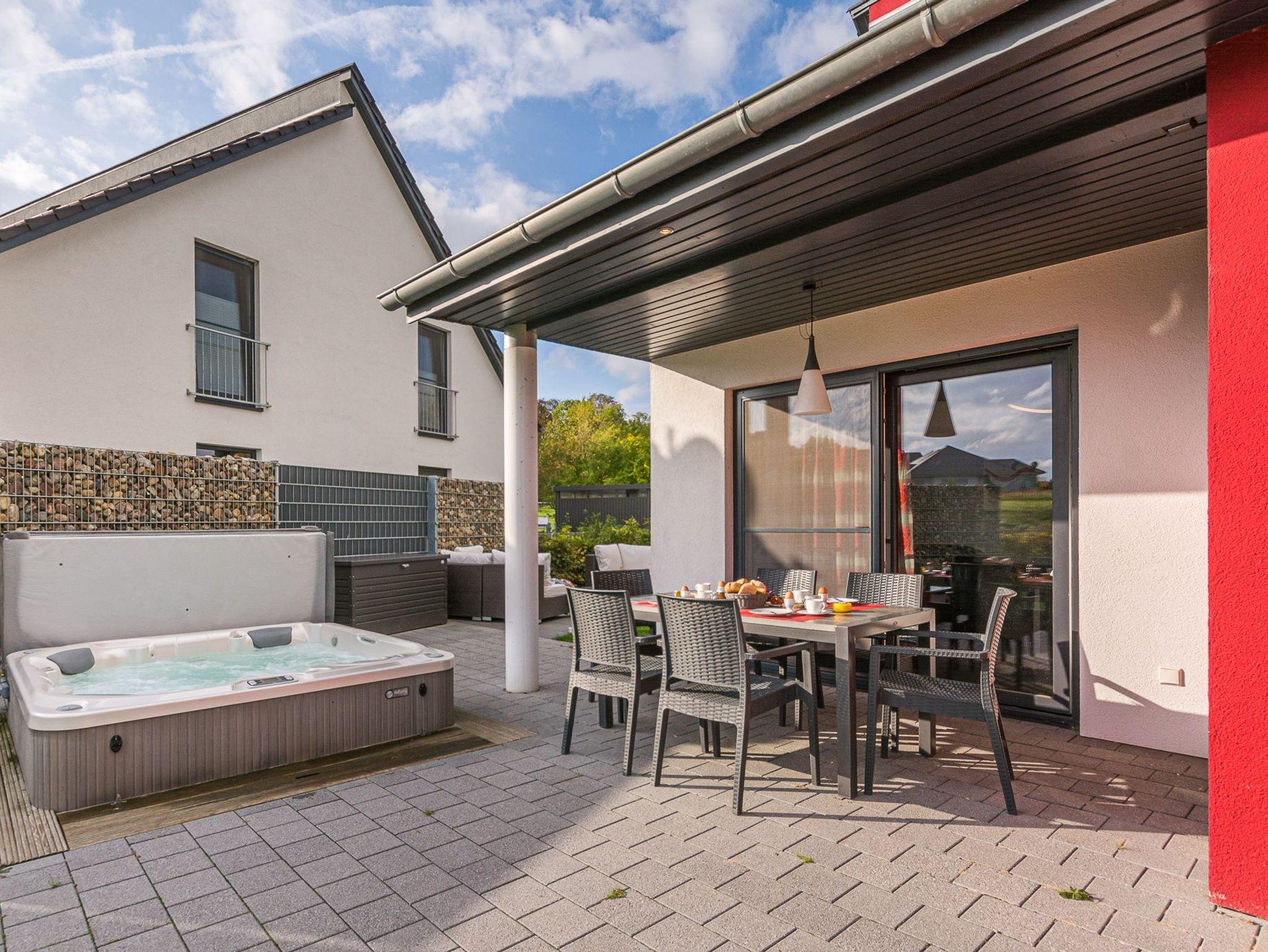 Der Außen-Whirlpool ermöglicht Ihnen entspannte Stunden unter freiem Himmel. Tauchen Sie ein und genießen Sie die wohltuende Massage der sprudelnden Massagedüsen.
