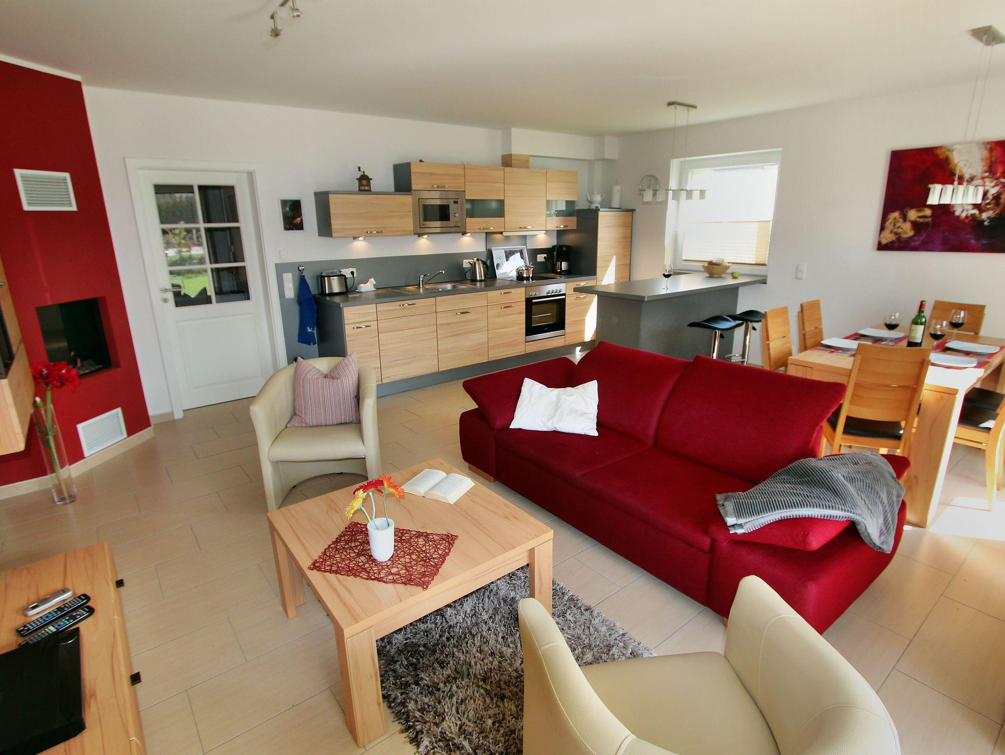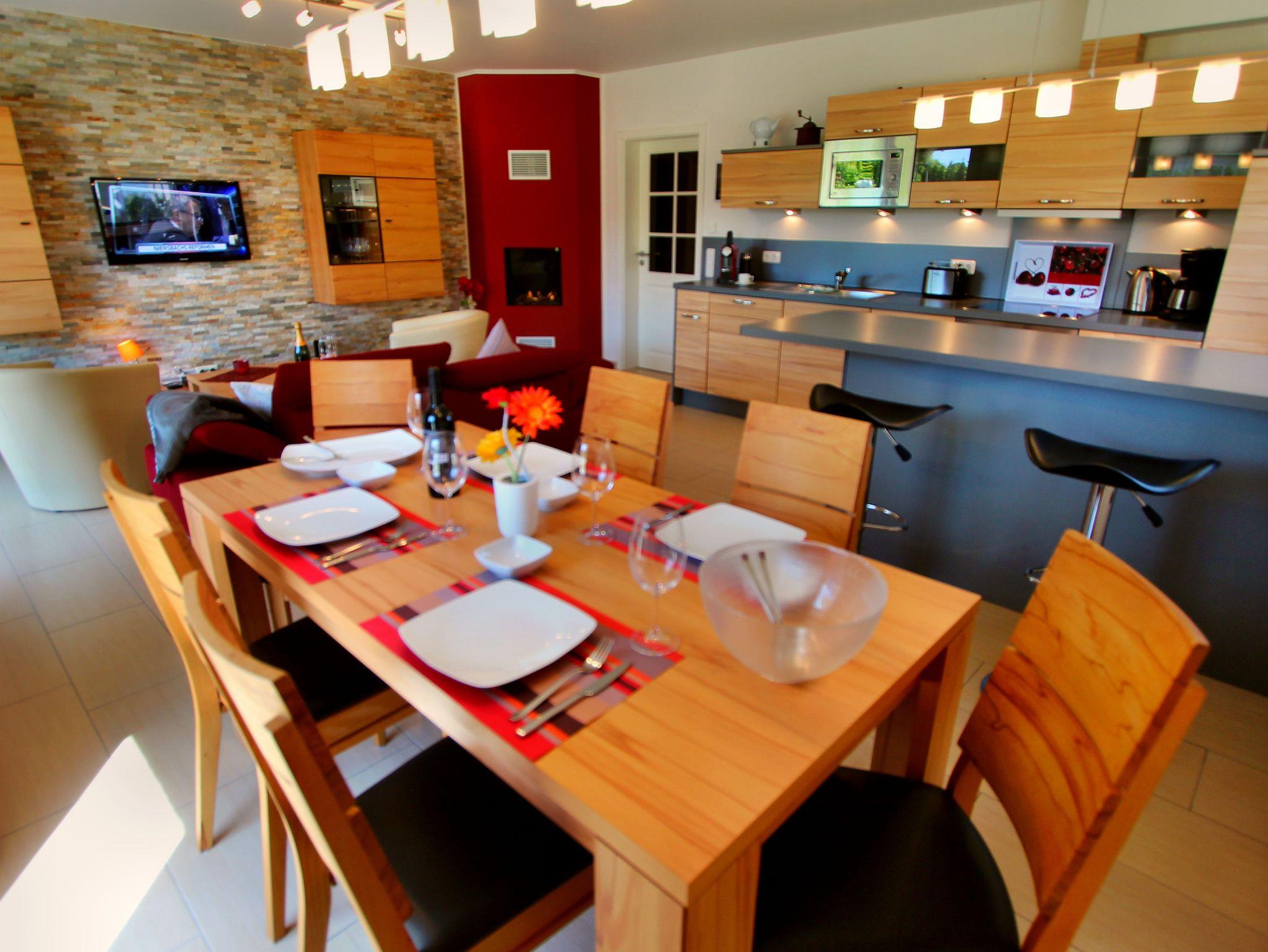 Die Villa Hügel besteht aus zwei separaten Ferienwohnungen und bietet insgesamt 110 m² Wohlfühl-Wohnfläche für Sie und Ihre Familie. Der großzügige Wohn- und Essbereich mit einem gemütlichen Gas Kamin lädt zum Verweilen und Entspannen ein. Hier können Sie gemeinsam schöne Stunden verbringen und sich wie zu Hause fühlen. Die offene Küche ist voll ausgestattet und bietet Ihnen alles, was Sie benötigen, um leckere Mahlzeiten gemeinsam zu genießen.