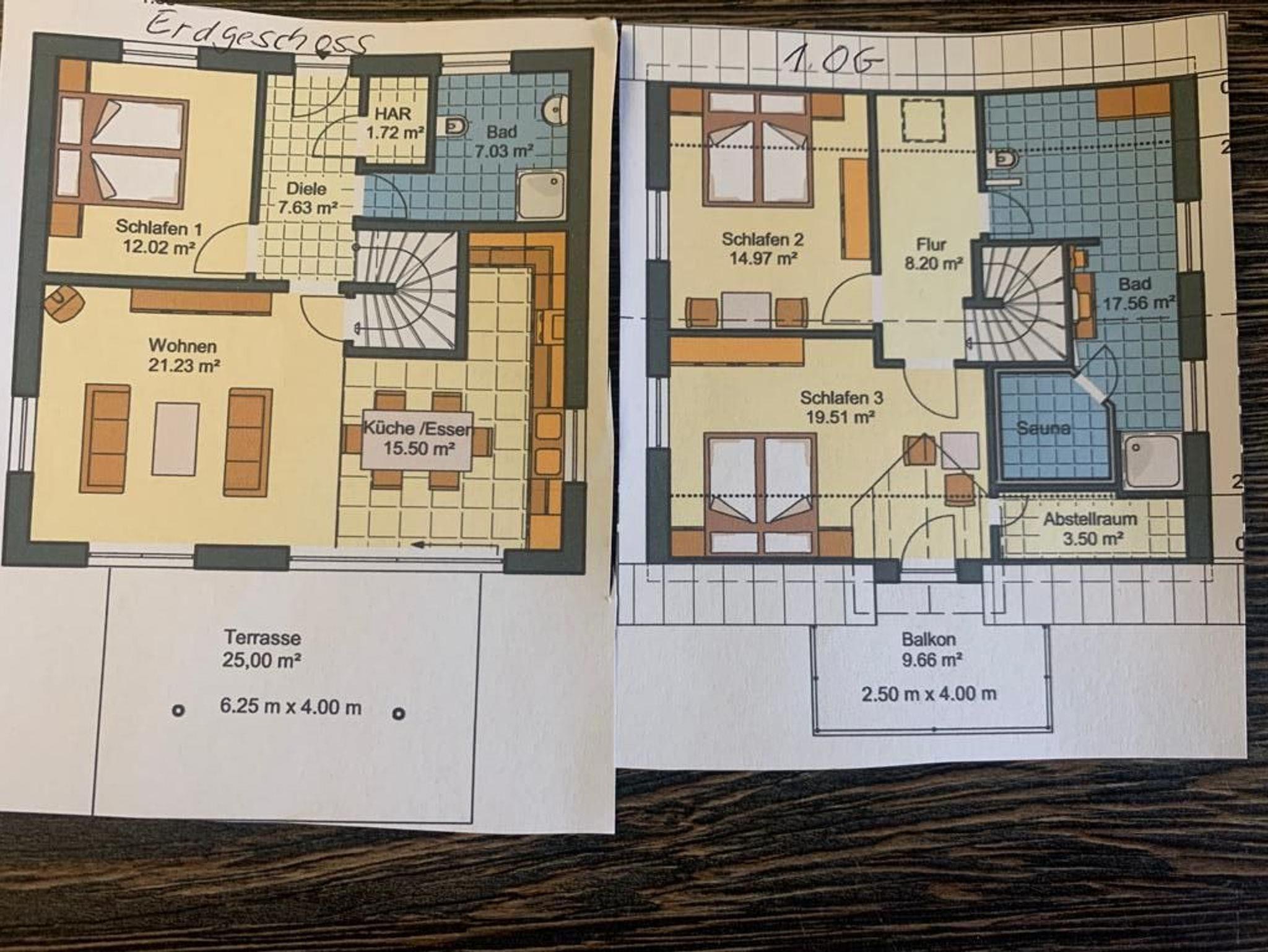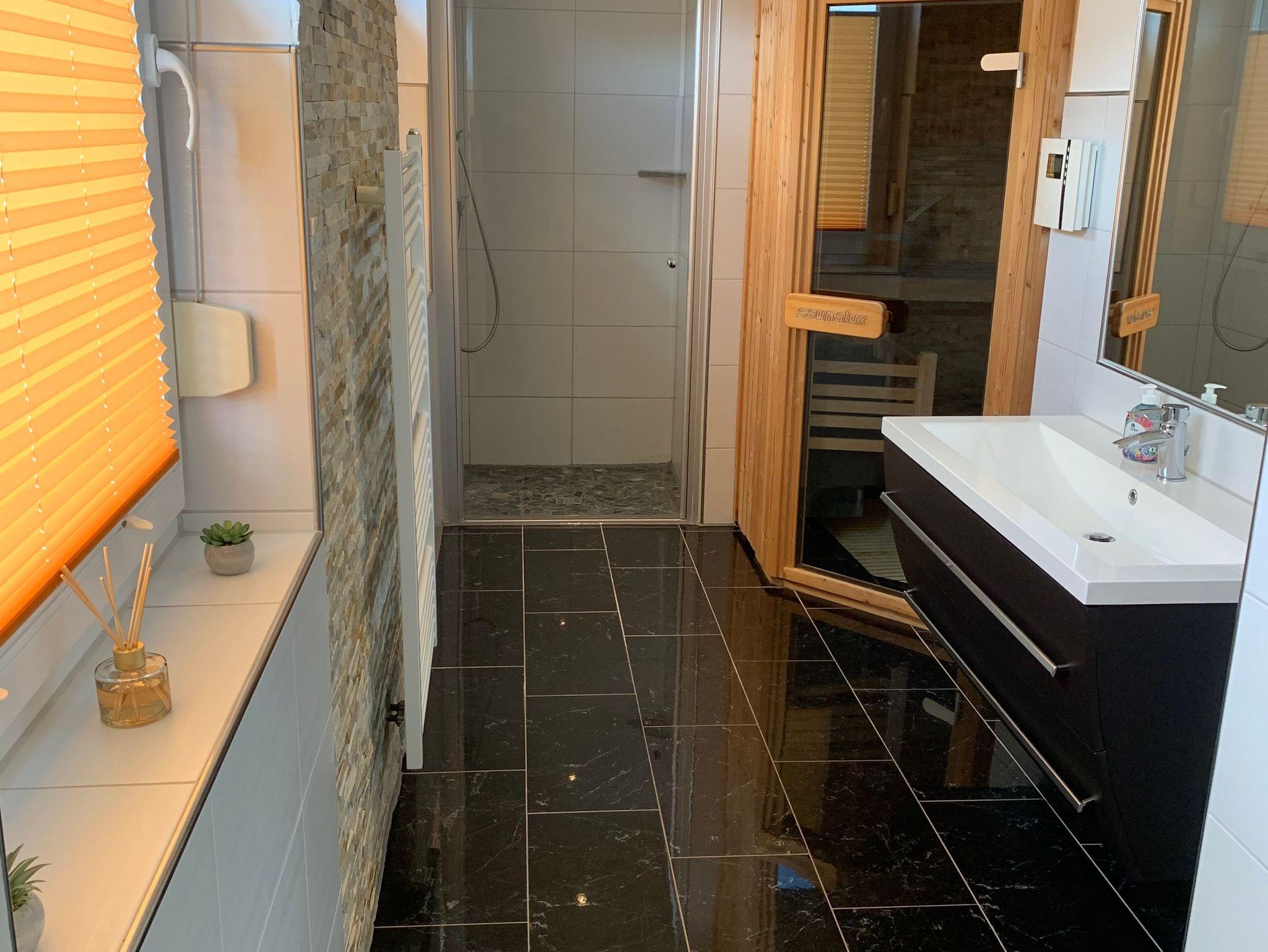 Die Bäder bieten moderne Waschtische und Raindanceduschen. Das große Bad verfügt zusätzlich über eine Sauna. Alle Räume werden über eine Fussbodenheizung beheizt..