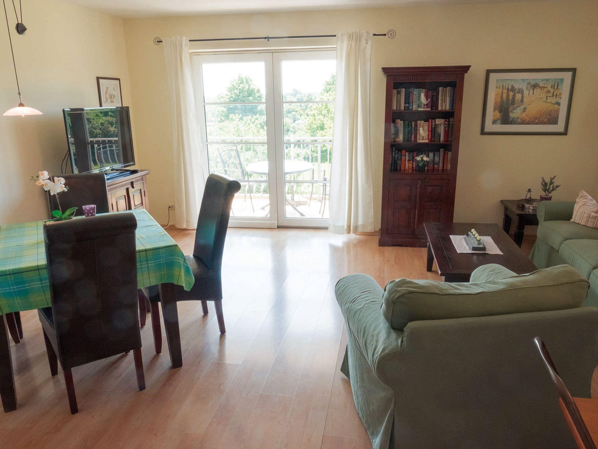 Im kombinierten Wohn- und Esszimmer mit offener Küche, steht Ihnen eine geräumige Ausziehcouch mit zwei weiteren Schlafplätzen zur Verfügung.