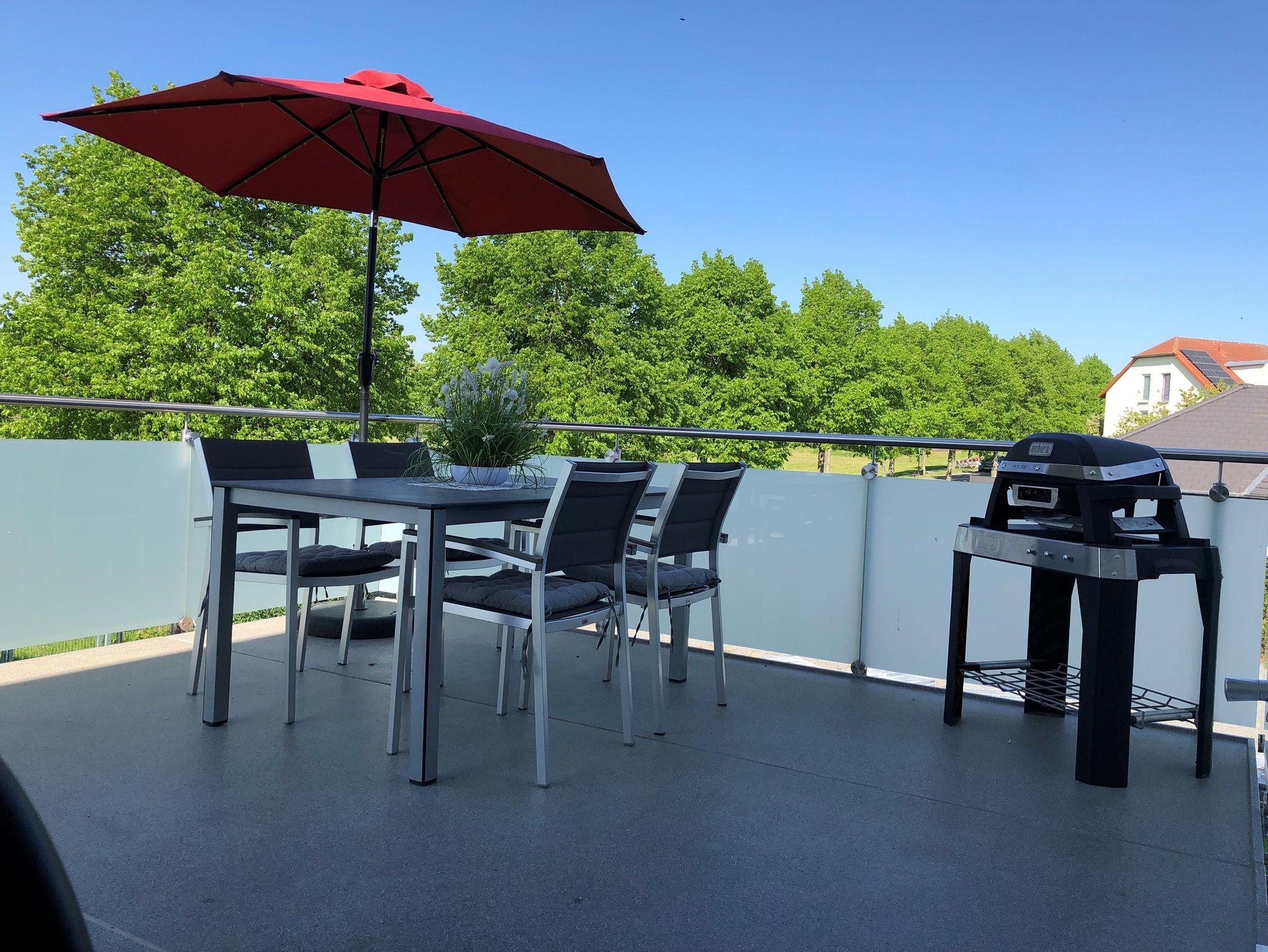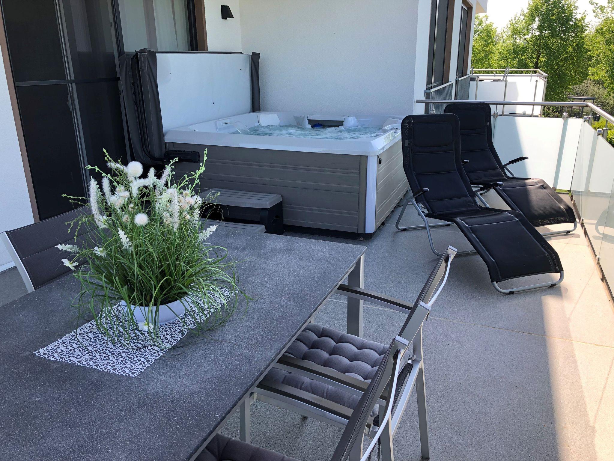 Der große Balkon lädt zum Verweilen ein und bietet Ihnen einen herrlichen Blick auf die Umgebung. Hier können Sie die frische Luft genießen und entspannte Stunden verbringen. Ein besonderes Highlight ist der Außen Whirlpool auf dem Balkon, der Ihnen wohltuende Momente der Entspannung und Luxus beschert.