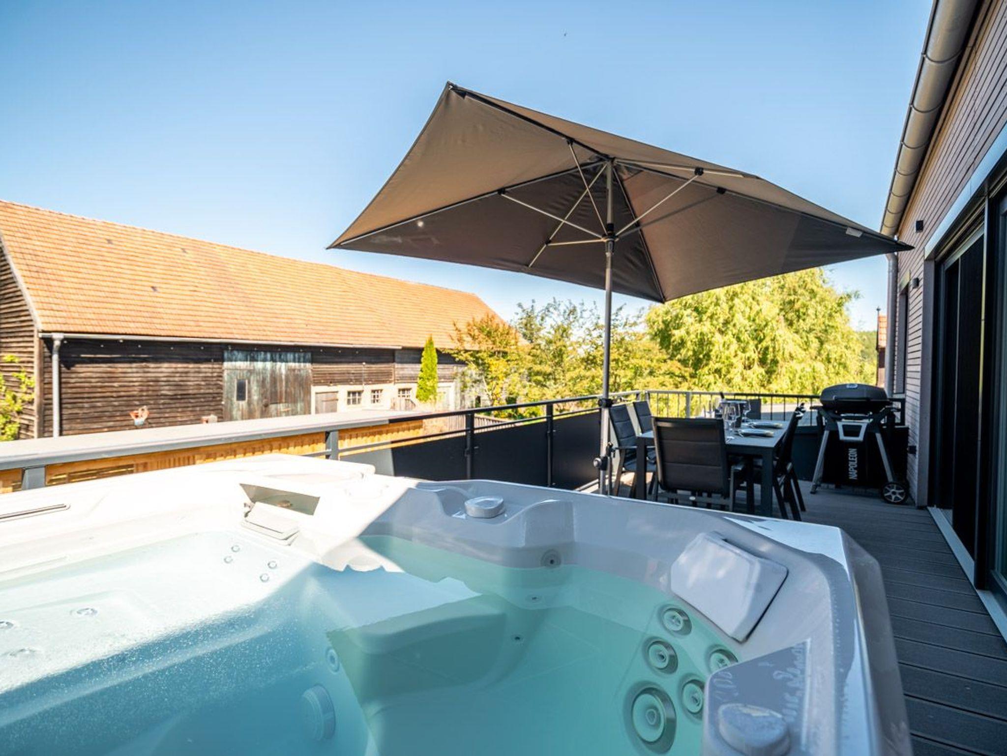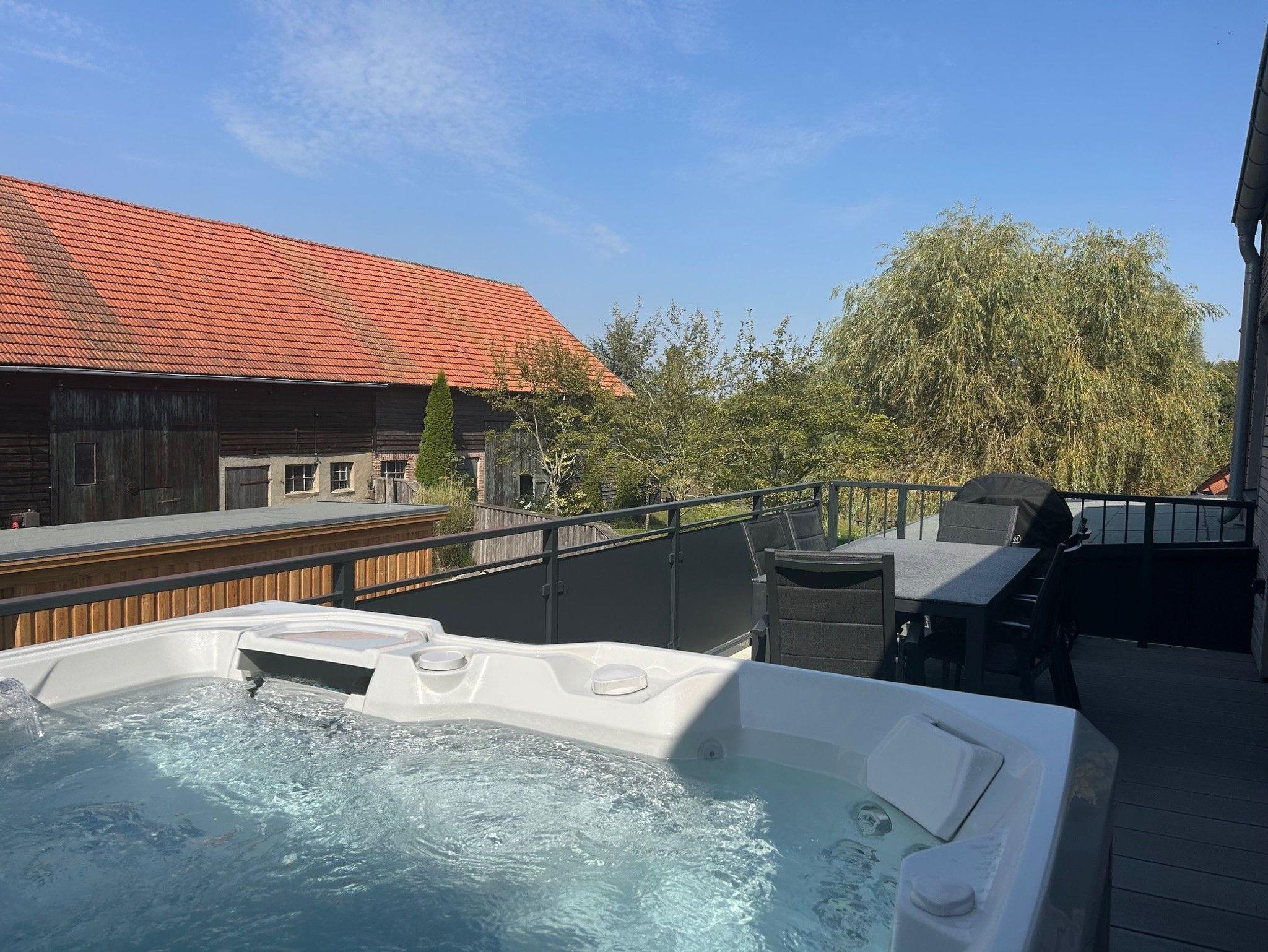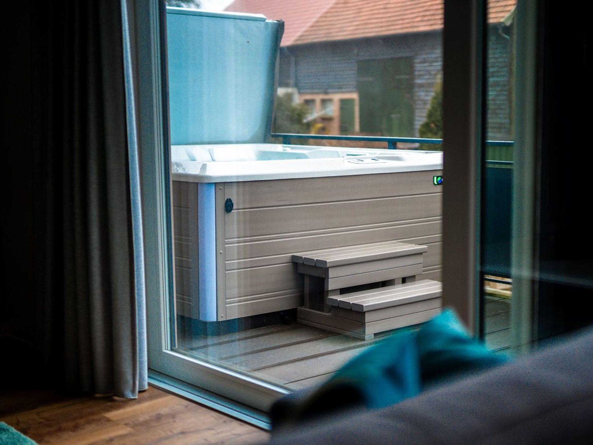 Der Balkon ist mit einem Außen-Whirlpool ausgestattet und lädt dazu ein, unter freiem Himmel zu entspannen oder gemeinsam gemütliche Grillabende zu verbringen.