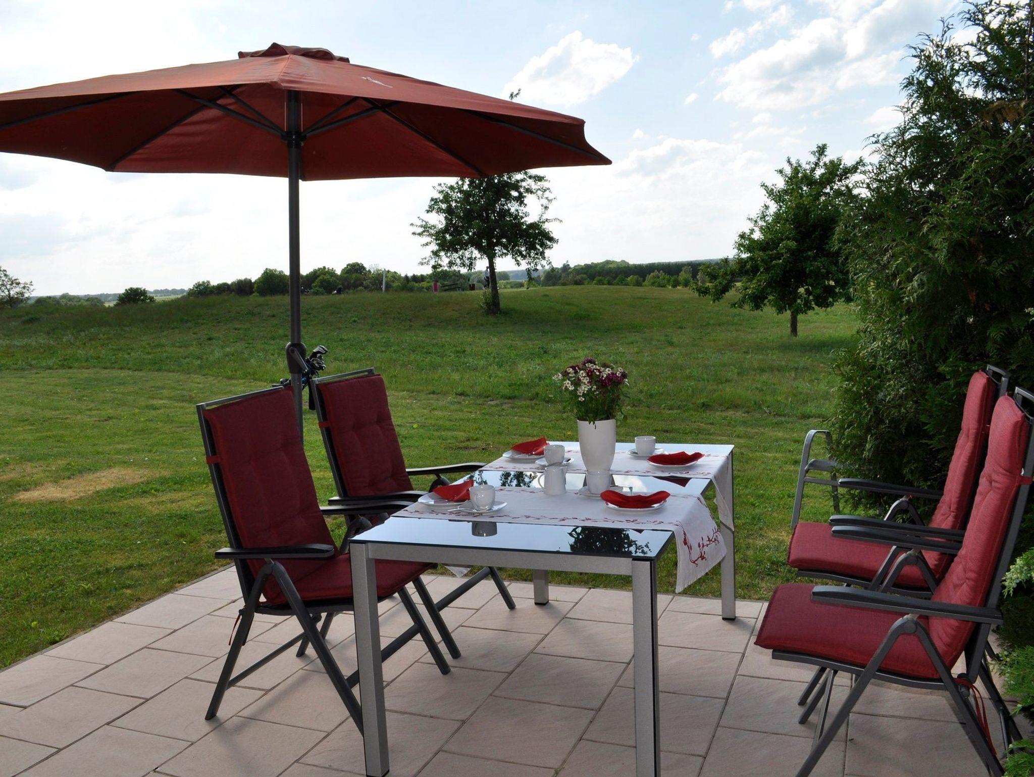 Große Terrasse mit einem herrlicher Panoramablick über die Golfplätze. Spektakuläre Sonnenuntergänge. Der Fleesensee ist 20 Gehminuten entfernt.