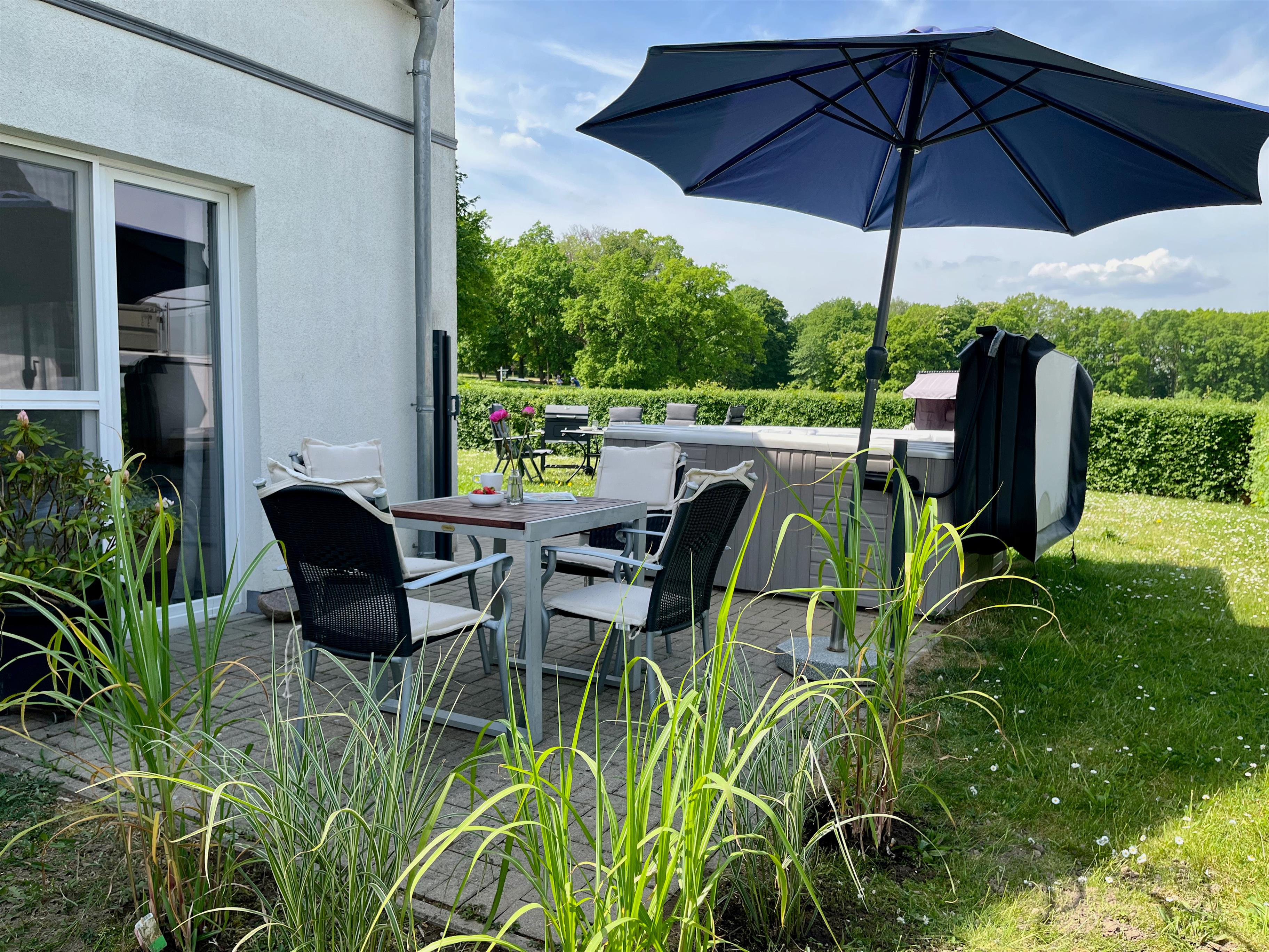 * Gartenbereich: Terrasse mit Whirlpool, Esstisch für 4 Personen und Gartenliegen, Strandkorb zum Entspannen, Holzkohlegrill