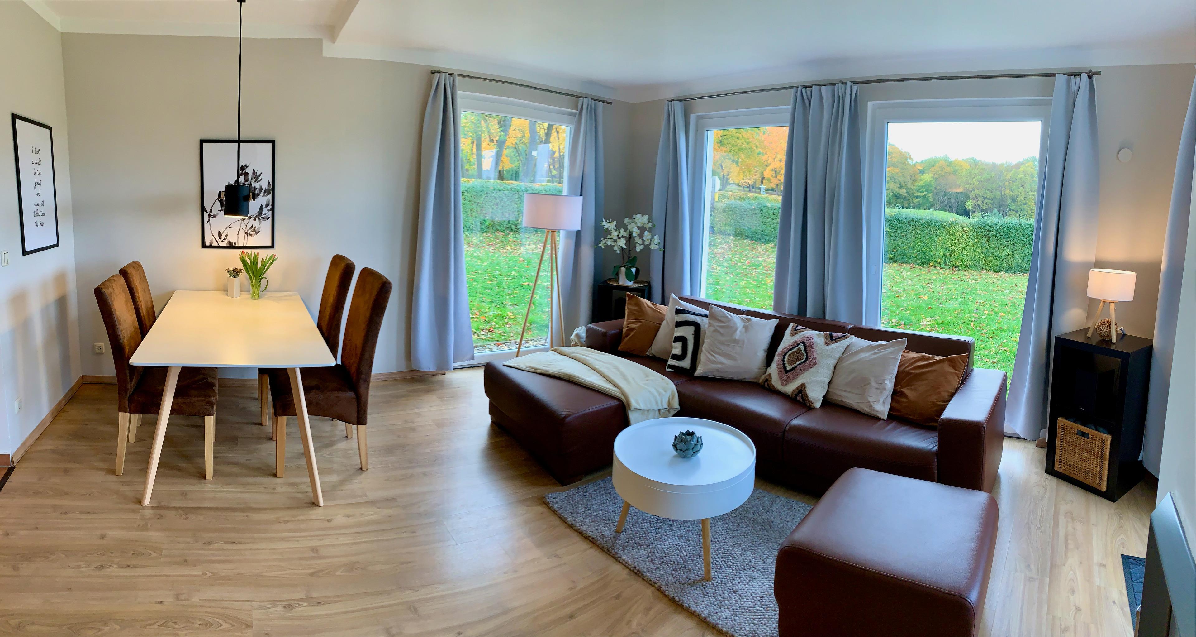 Auf 75m² finden Sie eine Komfortausstattung zum Wohlfühlen und Entspannen in allen Zimmern vor. Mit der Regendusche starten Sie gut in den Tag und aus dem Schlafzimmer können Sie morgens gleich auf die umlaufende Terrasse ins Freie treten und den Blick auf Bäume und Wiesen genießen. Die Fußbodenheizung wärmt Ihre Füße an kalten Tagen und der Insektenschutz sorgt für einen erholsamen Schlaf. Auch die technisch hochwertige Ausstattung lässt keine Wünsche offen! Im gesamten Wohnbereich können Sie das kostenlose W-Lan nutzen. Ebenso kostenfrei ist der Netflix-Account der Wohnung auf jedem der 3 Smart-TV nutzbar.