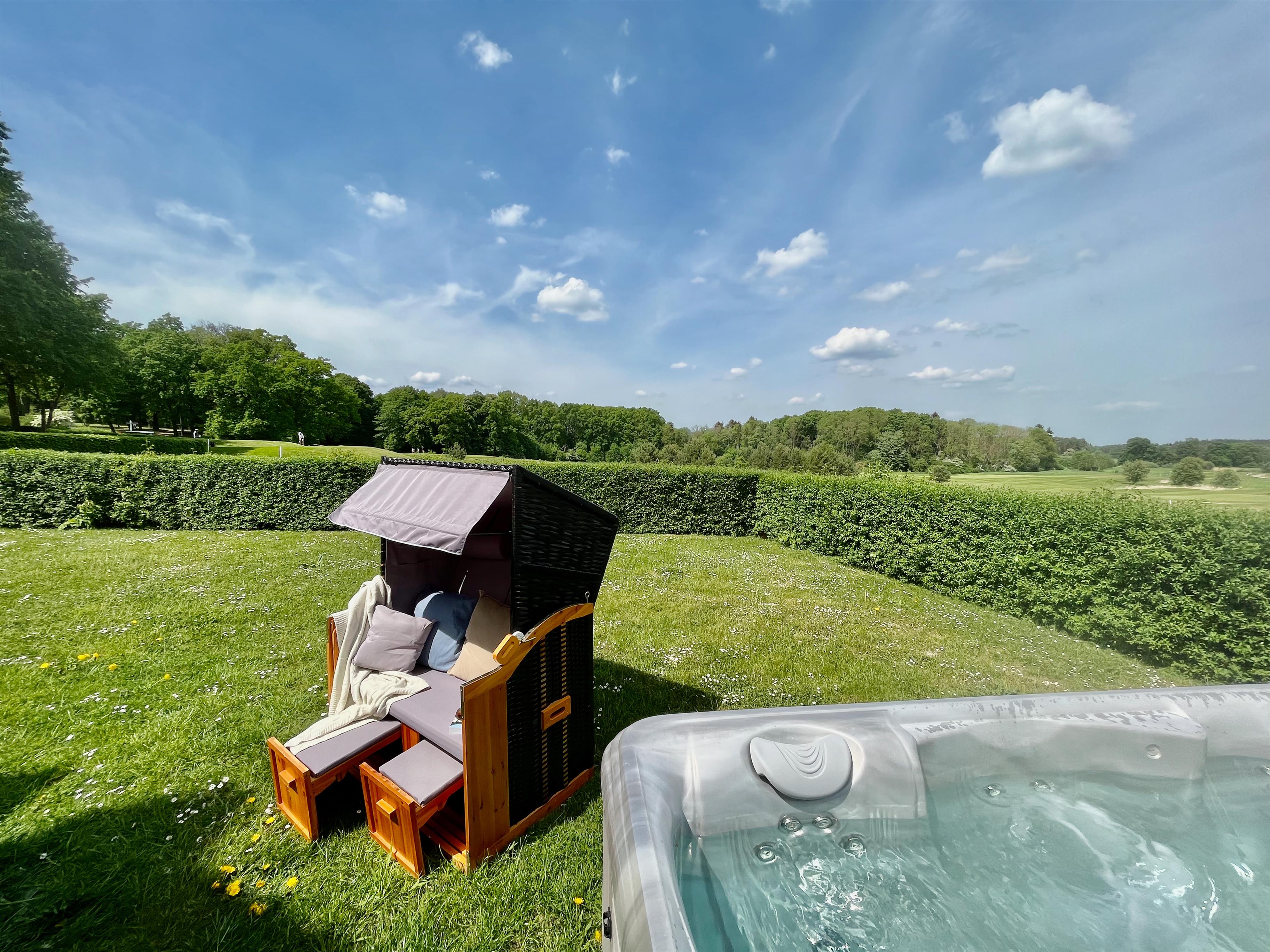 Im Außenbereich können Sie im 38 Grad warmen Hottub die Seele baumeln lassen- zu jeder Jahreszeit! Der gemütliche Strandkorb und die einladenden Sitz- und Liegegelegenheiten auf der Terrasse laden zum Verweilen ein und runden das Außenangebot zusammen mit der schönen Rasenfläche im Garten ab. Perfekt um im Kreise der Liebsten zu grillen und den Tag bei einem Glas Wein ausklingen zu lassen!