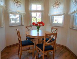 Das Ferienhaus am Fleesensee betreten Sie über einen offenen Flur zum Wohn- und Esszimmer. Die Küchenzeile ist mit einem Backofen, einem Cerankochfeld, einem Geschirrspüler, einem Kühlschrank mit Tiefkühlfach, einer Kaffeemaschine, einem Toaster und einem Wasserkocher ausgestattet. Der Esstisch mit Stühlen befindet sich in dem Teil des Wohnraumes, der durch das 8-eckige Türmchen geprägt ist. Im Wohnbereich gibt es eine Eckcouch, einen Tisch, zwei Schwingsessel, eine Stereoanlage mit Blu-ray/DVD-Player und einen modernen 50-Zoll-Flachbildfernseher. Das Haus verfügt über einen modernen Glasfaseranschluss (150 Mbit). Verschiedene Gesellschaftsspiele sind vorhanden. In der unteren Etage befindet sich außerdem ein Gäste-WC mit Waschbecken sowie ein extra Raum mit einem zweiten Zugang zum Haus. Eine Flurgarderobe und ein Schuhschrank sind hier vorhanden. Über eine Treppe gelangen Sie in die obere Etage. Im kleinen Flur stehen ein Kleiderschrank, ein Schreibtisch und ein Stuhl. Das große Bad ist ausgestattet mit einer Eckbadewanne, einer Dusche, einem Waschbecken und einem WC. In einem Schlafzimmer stehen ein Doppelbett und eine Kommode. Das zweite Schlafzimmer ist mit zwei Einzelbetten, einem Kleiderschrank und einem weiteren Flachbildfernseher sowie im Türmchen mit einem Schwingsessel und einem kleinem Tisch eingerichtet. Das Ferienhaus ist mit einer Heizung (teilweise Fußbodenheizung) ausgestattet und somit für die ganzjährige Nutzung geeignet. Vom Wohnzimmer aus gelangen Sie auf die Terrasse im Garten. Sie ist ausgestattet mit Gartenmöbeln und einen Grill. Im Garten befindet sich eine Liegewiese mit einer Schaukel. Ihren PKW können Sie auf dem Grundstück parken. Sie dürfen gern den abschließbaren Carport benutzen. Mitgebrachte Fahrräder können dort untergebracht werden. Da das Grundstück komplett eingezäunt ist, eignet es sich besonders auch für Familien mit kleinen Kindern.