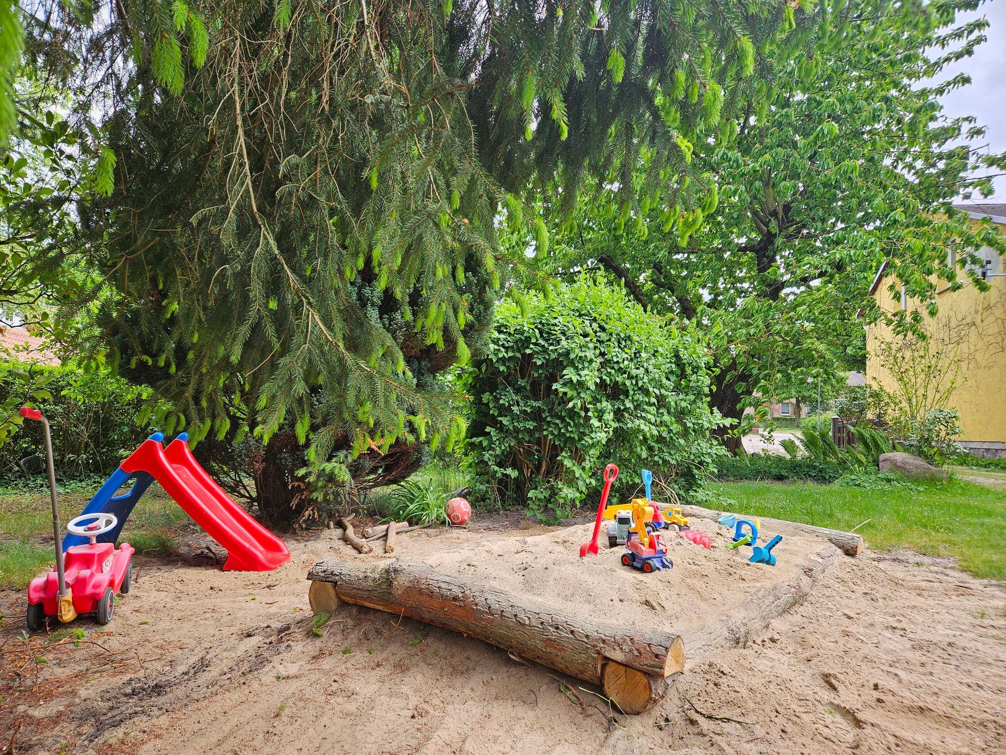 Der Kamin im Wohnzimmer sorgt zu jeder Jahreszeit für eine gemütliche Stimmung. Dank der neuen Zentralheizung ist das Haus das ganze Jahr bewohnbar. Die im Obergeschoss 2025 verlegten Landhausdielen sorgen für ein angenehmes Raumklima unter dem Dach. Genießen Sie im Obergeschoss den Blick auf den nur 200m entfernten wunderschönen Fleesensee mit seinem zum Baden einladenden Sandstrand, den großen Liegewiesen, Wassersportangeboten & der Strandpromenade. In nur 2 Minuten sind sie vom Haus zu Fuß bequem am Wasser. Abgerundet wird das ganze durch eine überdachte Terrasse mit Sitzgelegenheiten, 2 Parkplätzen am Haus & einen eingezäunten grünen sonnigen Garten mit Sitzgelegenheiten, Liegen, großem Sandkasten mit kleiner Rutsche, Feuerkorb, Wäschespinne & Fahrradständern. Abends lädt der Grill zum Barbecue ein.