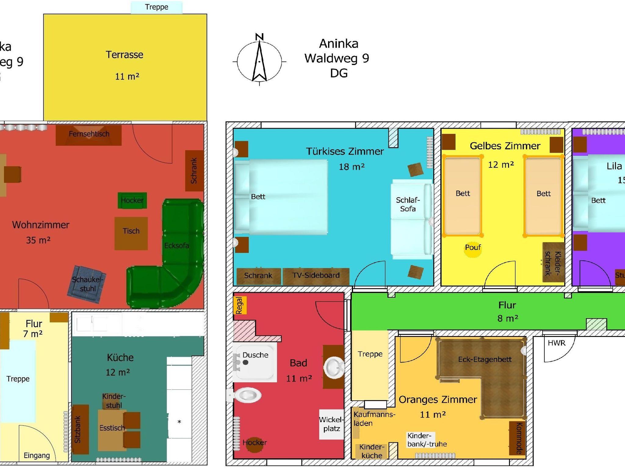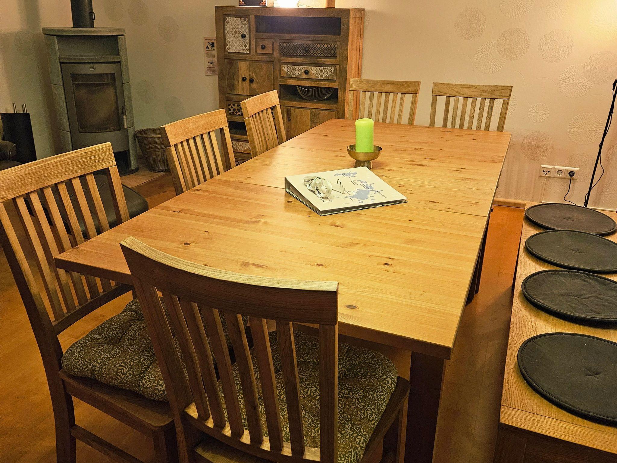Beim Ferienhaus Aninka handelt es sich um ein über 150 Jahre altes historisches Schnitterhaus, das 2025 saniert & mit Massivholzmöbeln modern ausgestattet worden ist. Unsere Aninka bietet Platz für 6 bis 10 Personen zuzüglich 1-2 kleineren Kindern. Auf großzügigen 140m² über 2 Etagen befinden sich 5 Wohnräume: Ein 35m² großes Wohnzimmer mit Kamin, Sitzgelegenheiten, Relax-Sessel, einem großen Esstisch, smartem Flachbild-TV (mit DVD-Player & einigen DVDs) & smarter Musikanlage (mit Bluetooth/CD/Radio/USB). Daneben gibt es 2 Tageslicht-Vollbäder (1 mit Dusche, Badewanne & WC, 1 mit Dusche & WC), eine vollausgestattete große Küche mit weiterem Esstisch & insgesamt 4 separate Schlafzimmer im Obergeschoss: