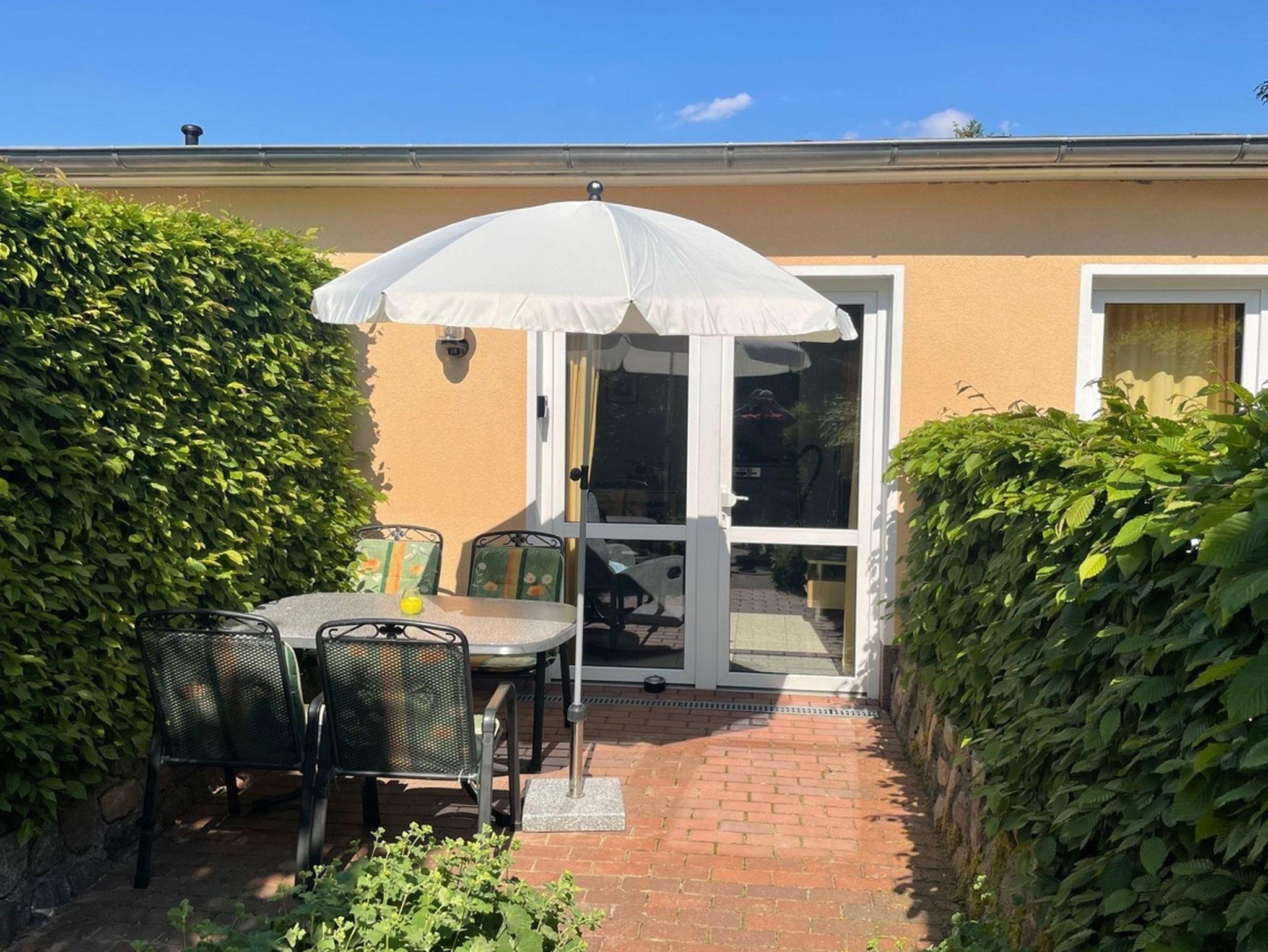 Die gemütliche Terrasse ist mit einem großzügigen Esstisch, vier Stühlen, einem Sonnenschirm sowie einem Grill ausgestattet.