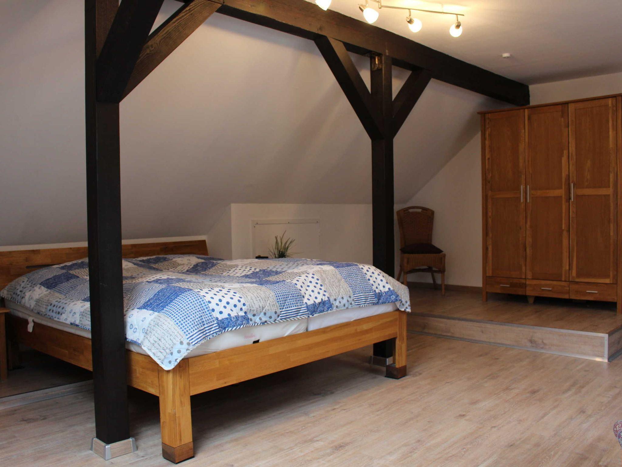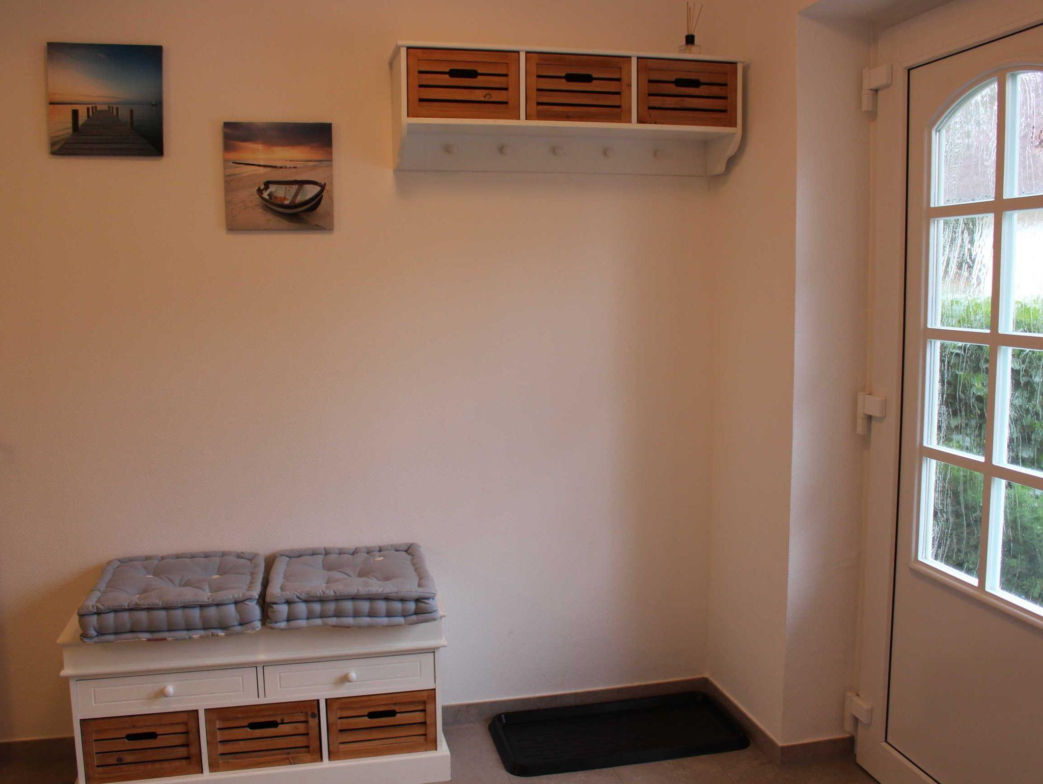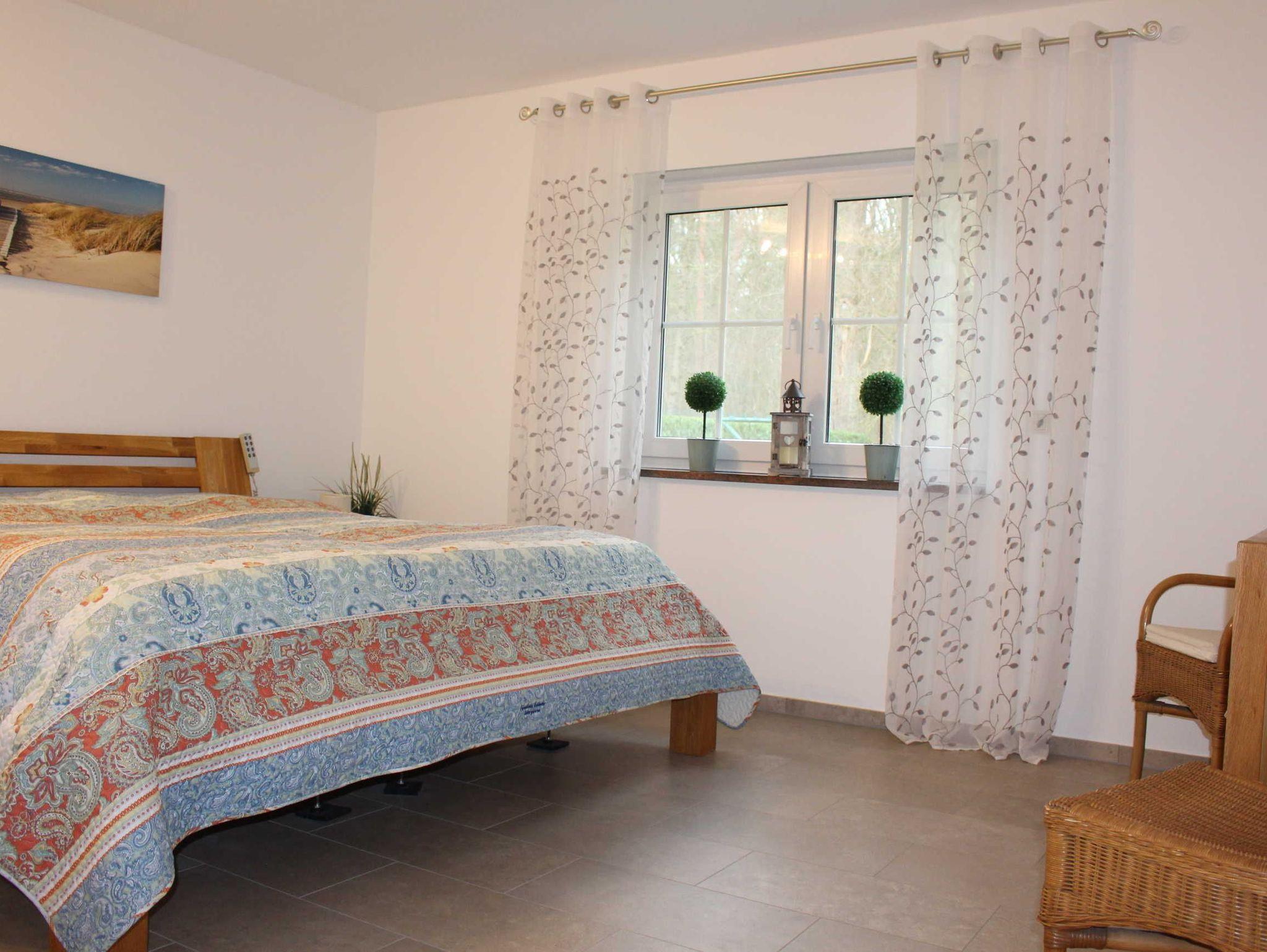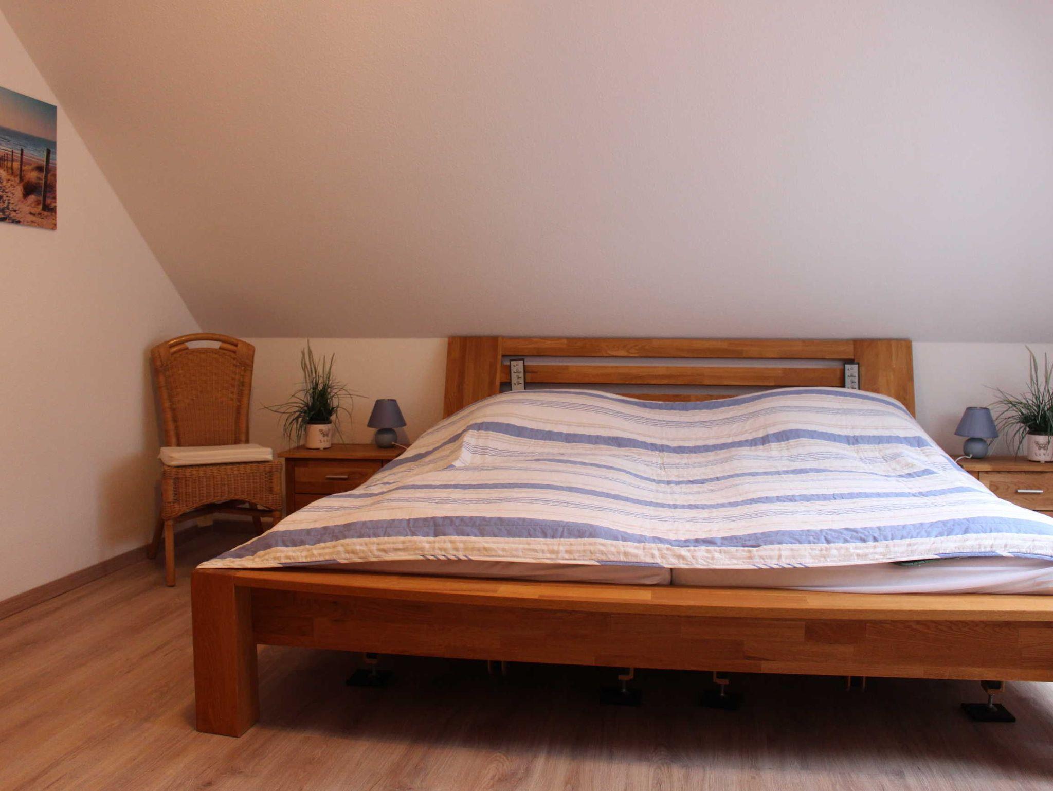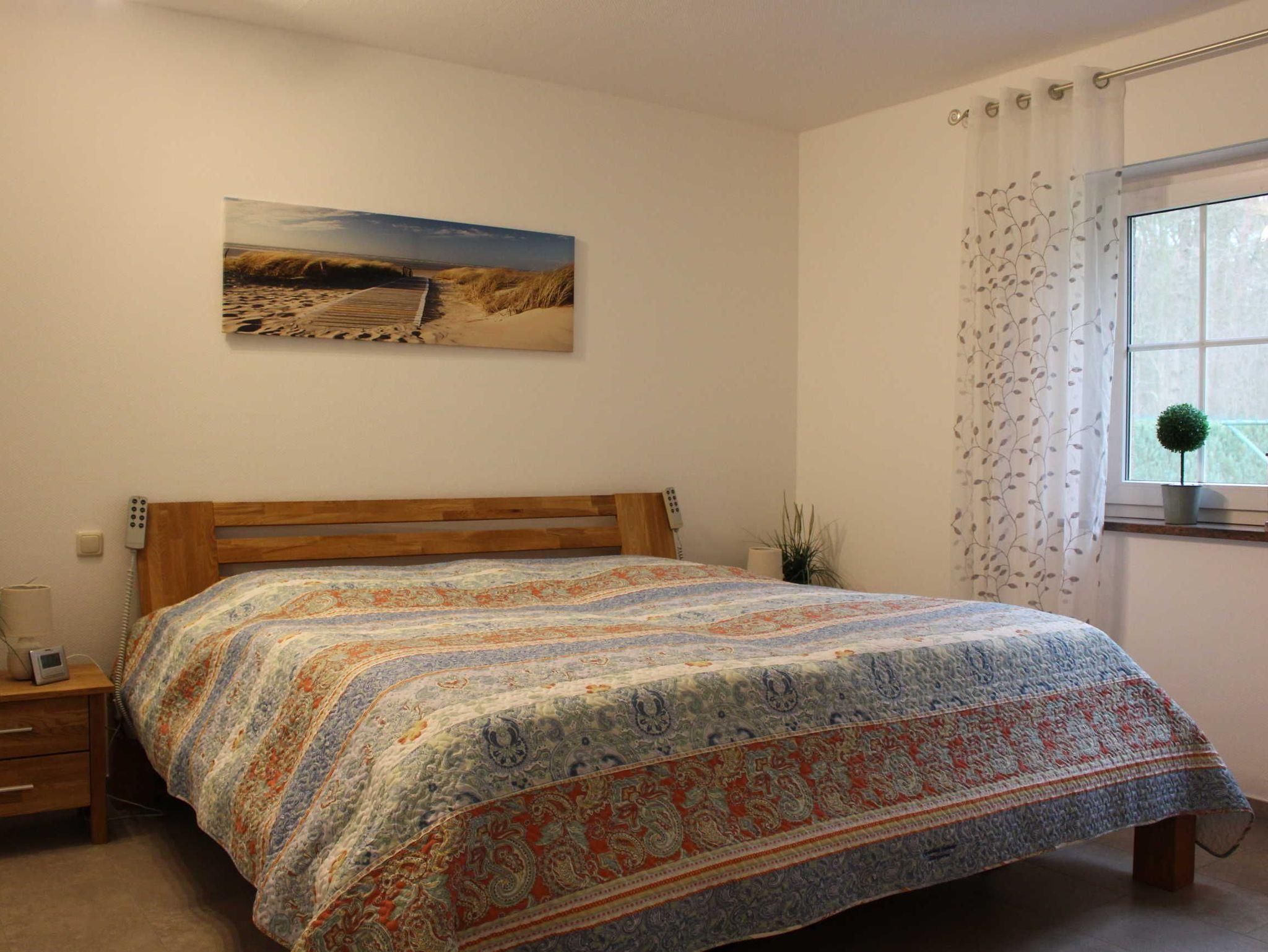 Im EG unseres 2021/22 renovierten Hauses befindet sich eine kleine Diele mit Garderobe und Spiegel und ein Hauswirtschaftsraum mit Waschmaschine und Wäschetrockner sowie eine Kühl-und Gefrierkombination, welche Sie kostenlos nutzen können. In einem separaten Trakt befindet sich ein großes Schlafzimmer mit einem 2x2 m großen Bett (elektrisch verstellbar), ein Badezimmer mit ebenerdiger Dusche, Badewanne und WC. Angrenzend finden Sie einen begehbaren Kleiderschrank.