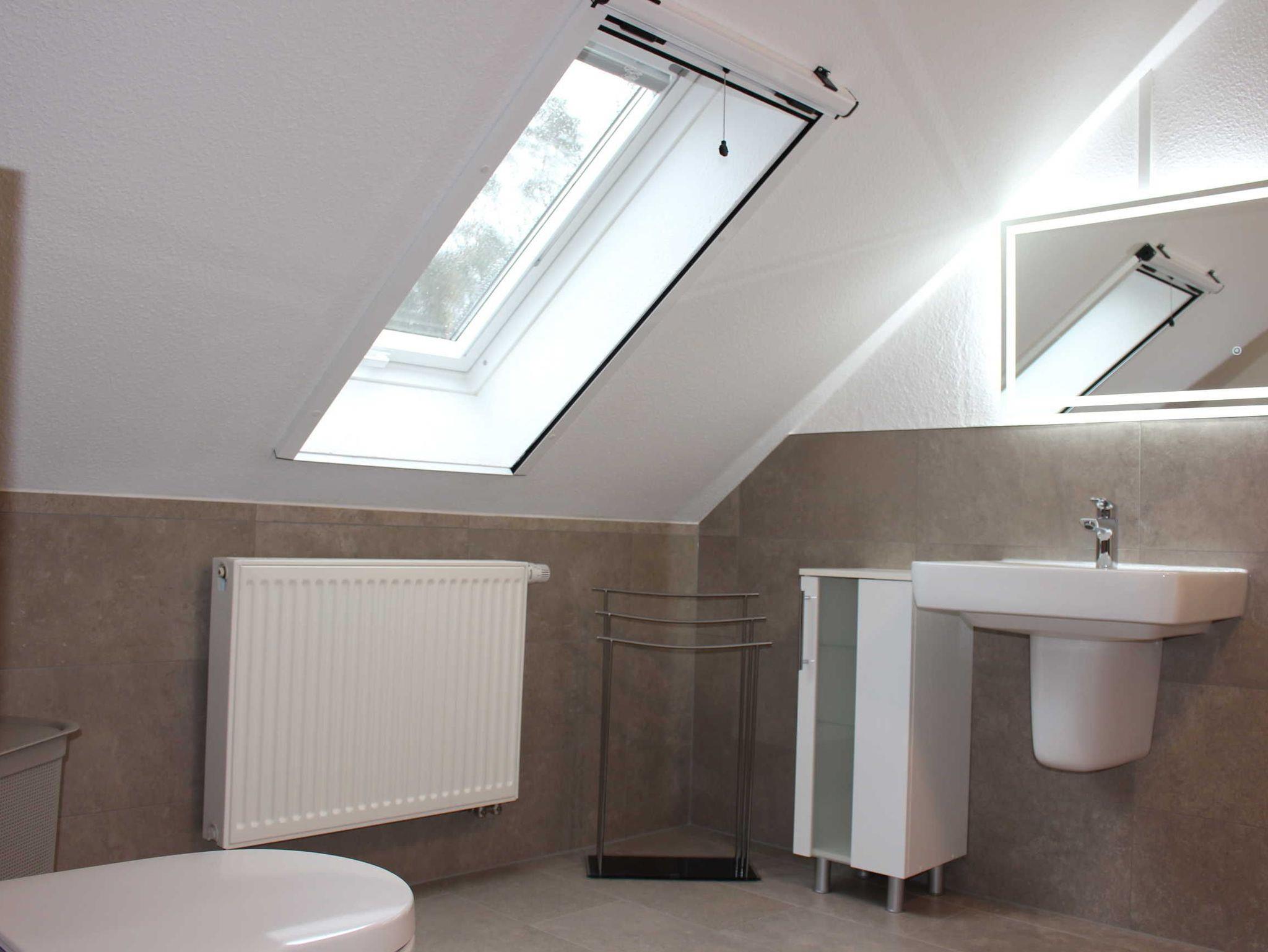 Aus der Diele gelangen Sie über eine Treppe ins Dachgeschoss. Dort befinden sich zwei weitere Schlafzimmer und ein Badezimmer mit Dusche und WC. Ein Schlafzimmer ist mit einem Ehebett und einem Einzelbett ausgestattet (alle Betten sind mechanisch verstellbar, teilweise elektrisch) und im zweiten Schlafzimmer befindet sich ein Ehebett. In beiden Schlafzimmern stehen Kleiderschränke und jedes der insgesamt 3 Schlafzimmer ist mit einem Fernseher ausgestattet.