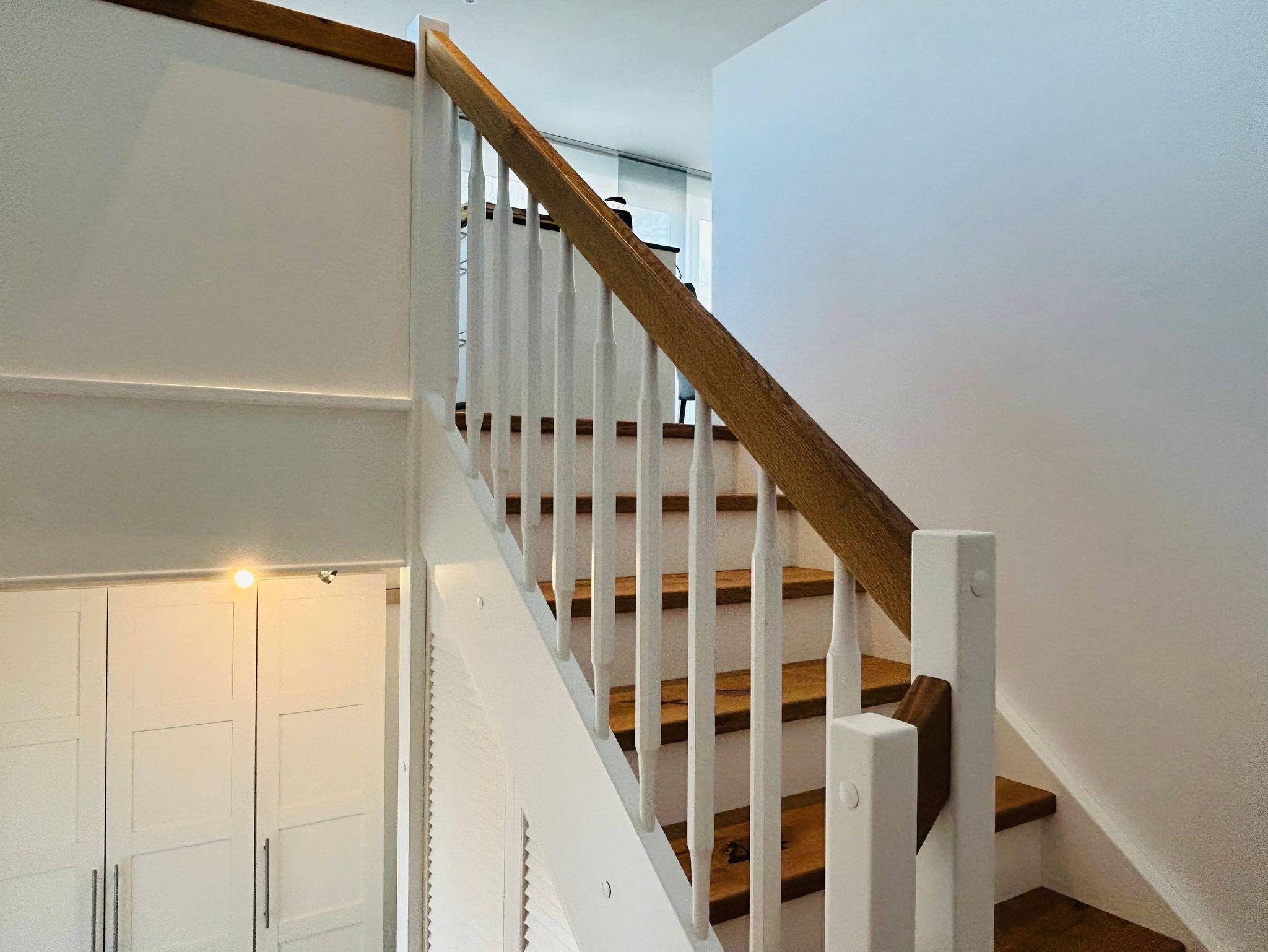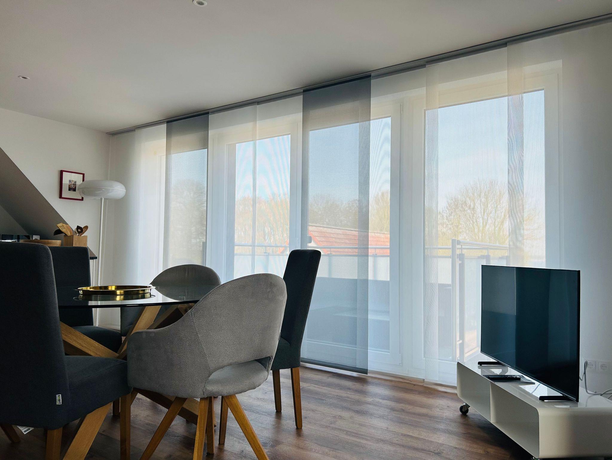 Im Erdgeschoss befinden sich zwei Schlafzimmer sowie 2 Badezimmer. Im Obergeschoss befindet sich ein offener Wohn- und Essbereich mit Zugang zum Balkon. 2 PKW-Stellplätze befinden sich direkt am Ferienhaus.