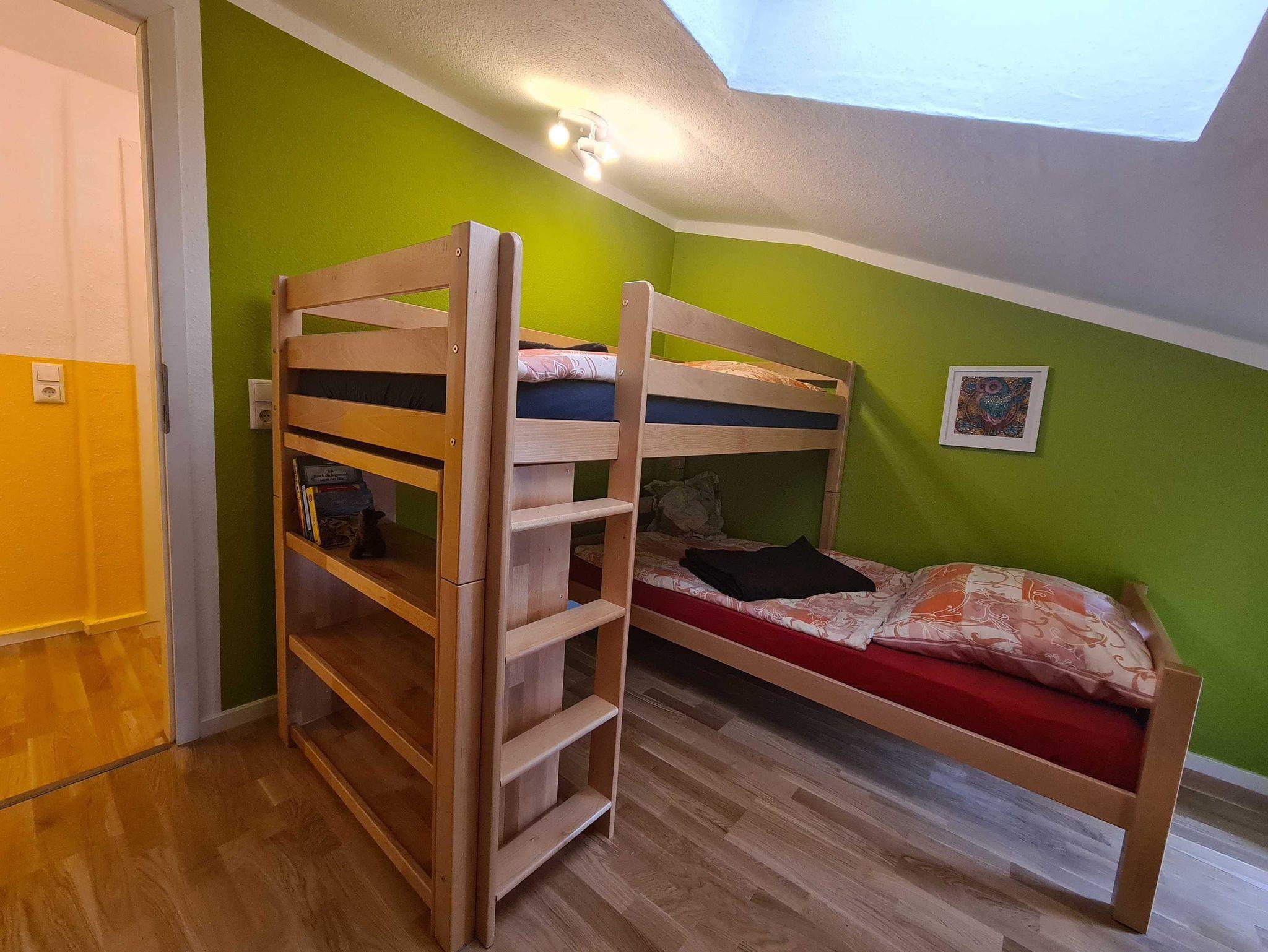 - grünes Zimmer im OG mit 2 Einzelbetten in einem massiven Eck-Etagenbett Kinder lieben es (je 90x200m)