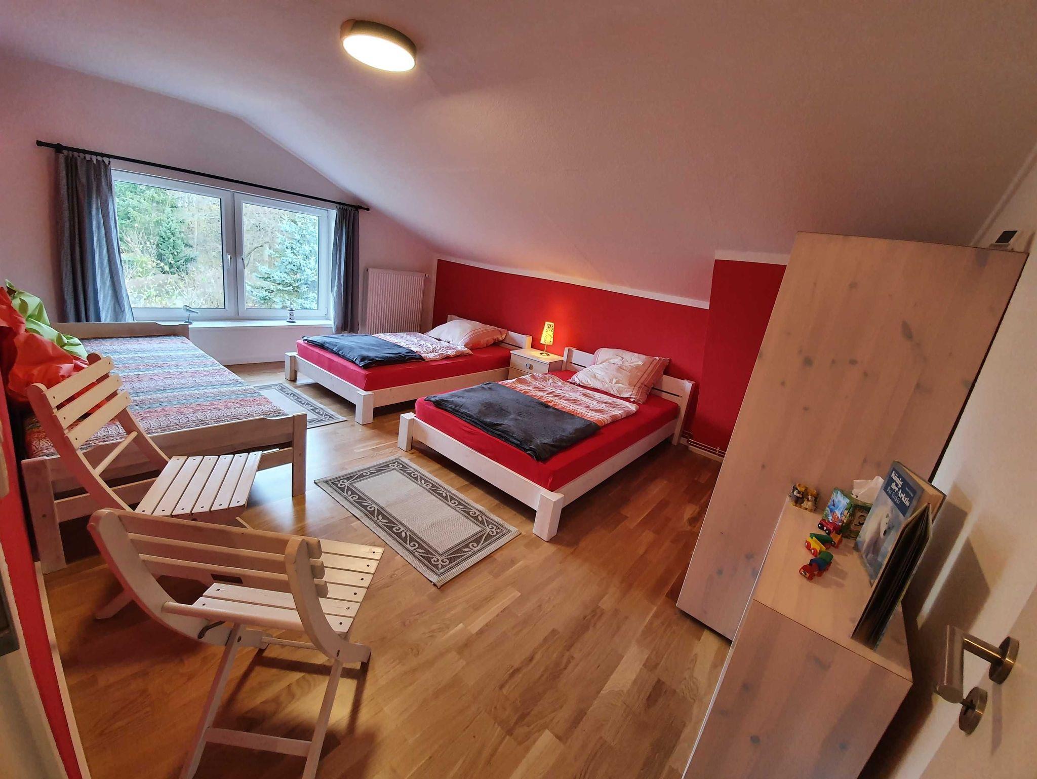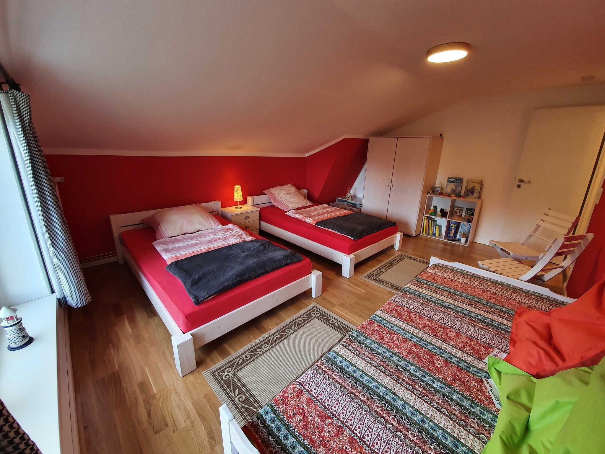 - rotes Zimmer im OG mit 2 gemütlichen Kingsize-Einzelbetten (120x200cm) & 1 zusätzlichen Einzelbett (90x200cm),