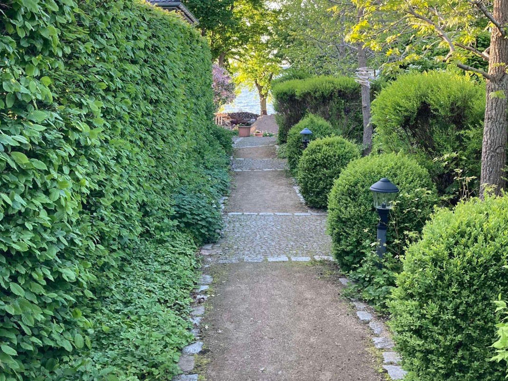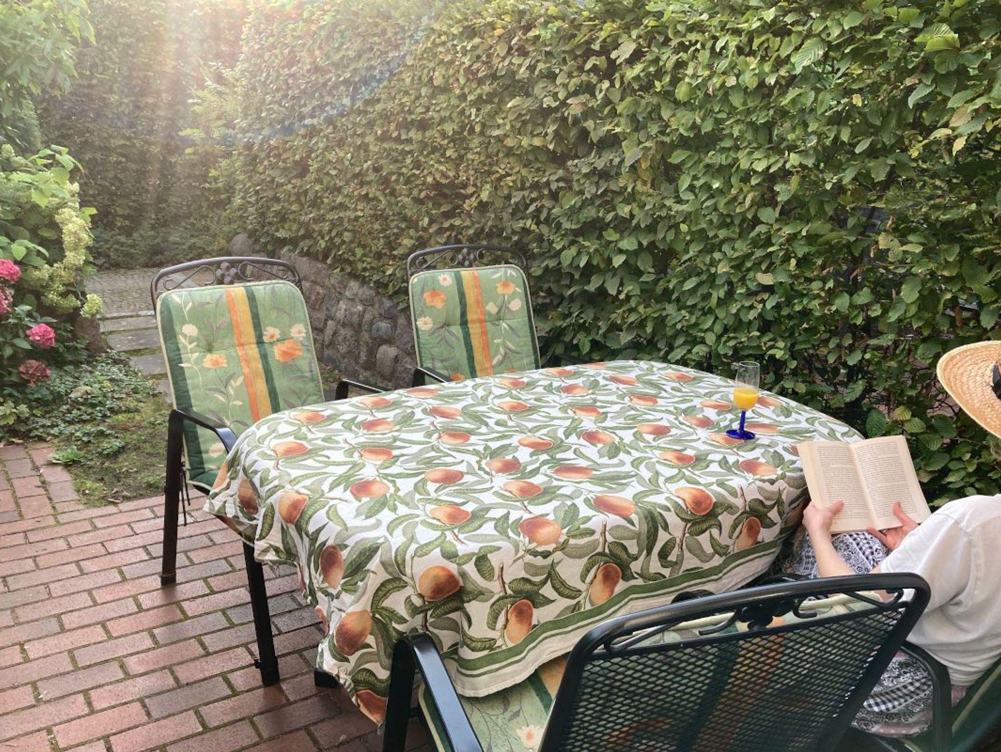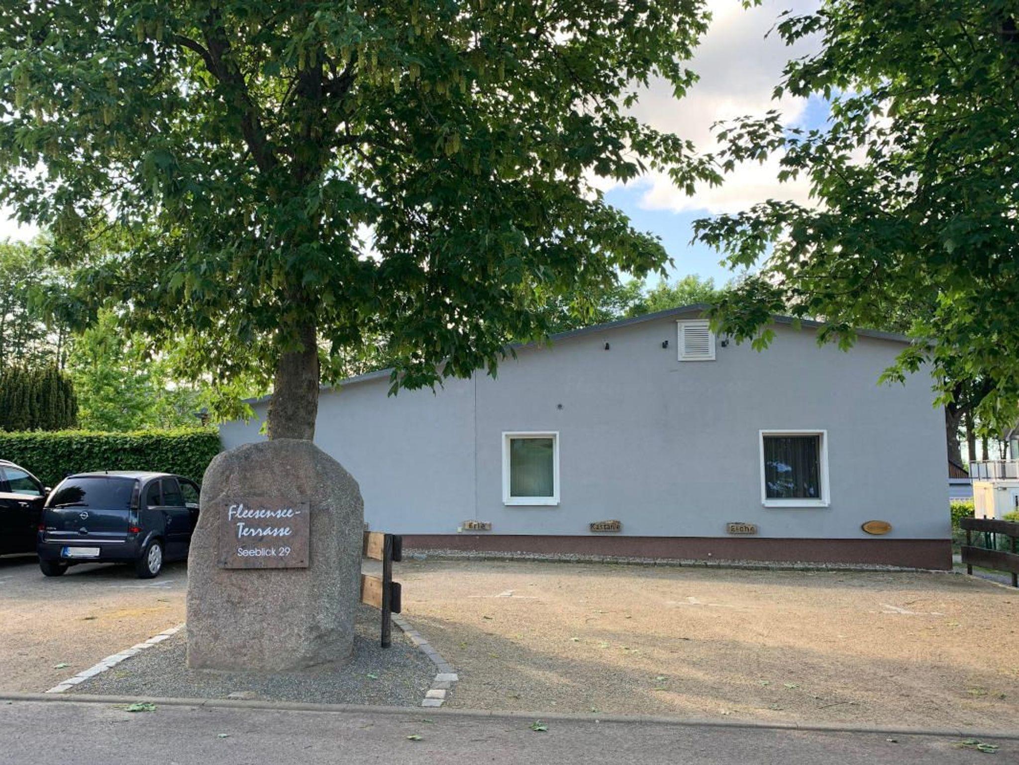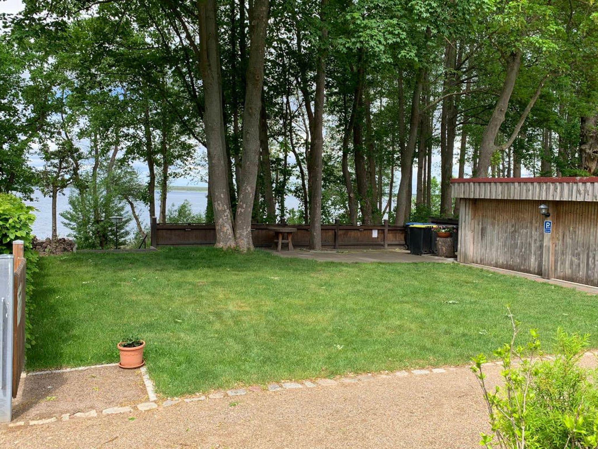 Auf der Terrasse stehen Gartenmöbel und ein Sonnenschirm für entspannte Stunden bereit. Darüber hinaus können Sie die großzügige Gemeinschaftswiese mit traumhaftem Blick auf den Fleesensee zum Sonnen, Liegen oder Entspannen nutzen.