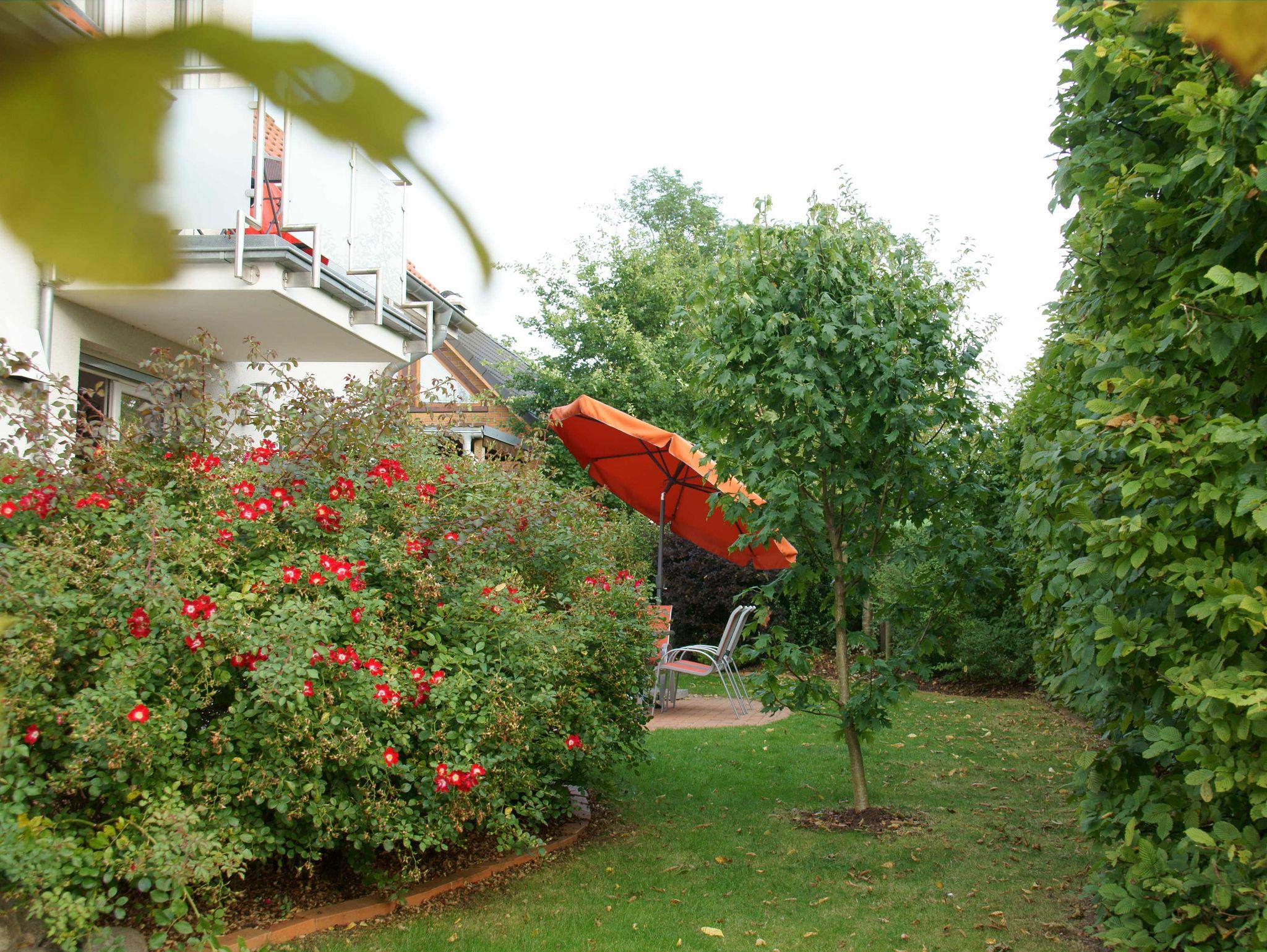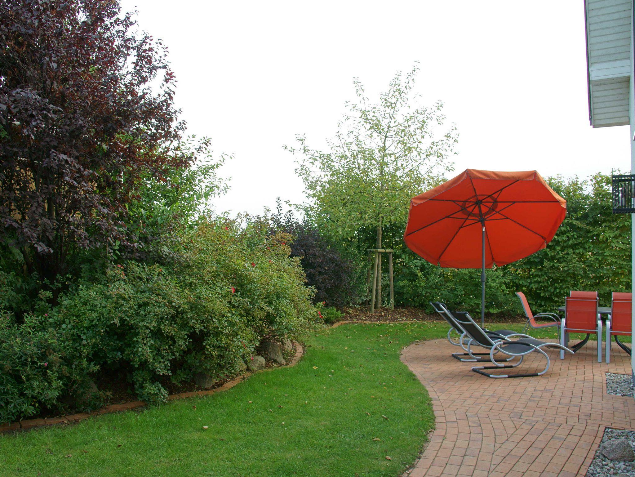 Die Terrasse mit Gartenmöbeln, Ampelsonnenschirm und einem Grill lädt zum Aufenthalt im Freien ein. Sie führt um das Haus herum und bietet Ihnen Sonnenschein von morgens bis abends.