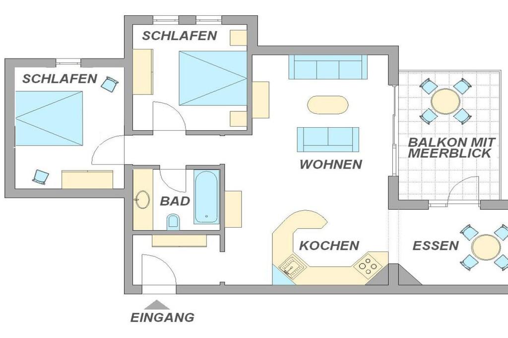 Das großzügig geschnittene und liebevoll eingerichtete Ferienwohnung im 2. Stock des Appartementhauses ermöglicht Ihnen einen angenehmen Aufenthalt für max. 5 Personen (4 Erw. + 1 Kleinkind). Die Ferienwohnung besteht aus einem großen, stilvoll gestalteten Wohnzimmer mit Küche und Essbereich, zwei getrennten Schlafzimmern, Bad mit Dusche/WC und einer 12 qm großen Holzveranda mit Panoramablick zur Ostsee. In der komplett ausgestatteten Küche mit Backofen, Mikrowelle und Geschirrspüler werden Sie auch im Urlaub keinen Komfort missen. Der Essbereich ist geschmackvoll eingerichtet und bietet einen unvergesslichen Ostseeblick. Im Wohnraum stehen Ihnen TV, DVD-Player und Stereoanlage zur Verfügung.