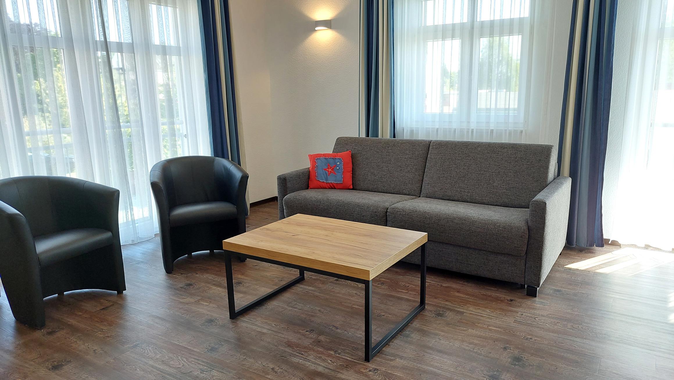 Diese freundliche Wohnung ist aufgeteilt in einen Wohnraum mit Balkon und integrierter Küchenzeile, ein Schlafzimmer und ein Duschbad mit Waschtisch und WC. Das Wohnzimmer begrüßt Sie mit einem Schlafsofa und Sessel sowie Flachbild-TV. Das Schlafzimmer verfügt über ein Doppelbett (1,80m x 2m) sowie einen Kleiderschrank. Die Küchenzeile ist mit Backofen, Geschirrspüler, Cerankochfeld, Kühlschrank mit kleinem Gefrierfach, Cerankochfeld, Mikrowelle, Kaffeemaschine, Wasserkocher und Toaster ausgestattet. Highlights: Kostenfreies WLAN sowie ein frei wählbarer PKW-Stellplatz direkt am Haus.