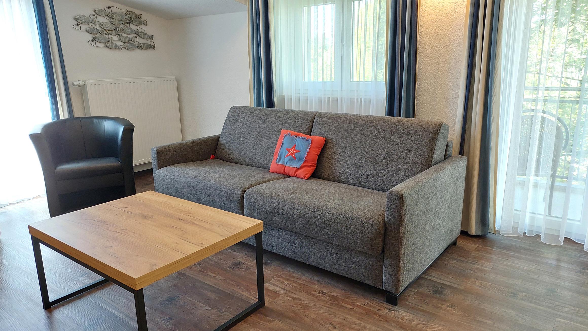 Diese freundliche Wohnung ist aufgeteilt in einen Wohnraum mit Balkon und integrierter Küchenzeile, ein Schlafzimmer ebenso mit Balkon und ein Duschbad mit Waschtisch und WC. Das Wohnzimmer begrüßt Sie mit einem Schlafsofa und Sessel sowie Flachbild-TV. Das Schlafzimmer verfügt über ein Doppelbett (1,80m x 2m) sowie einen Kleiderschrank. Die Küchenzeile ist mit Backofen, Geschirrspüler, Cerankochfeld, Kühlschrank mit kleinem Gefrierfach, Cerankochfeld, Mikrowelle, Kaffeemaschine, Wasserkocher und Toaster ausgestattet. Highlights: Kostenfreies WLAN sowie ein frei wählbarer PKW-Stellplatz direkt am Haus.