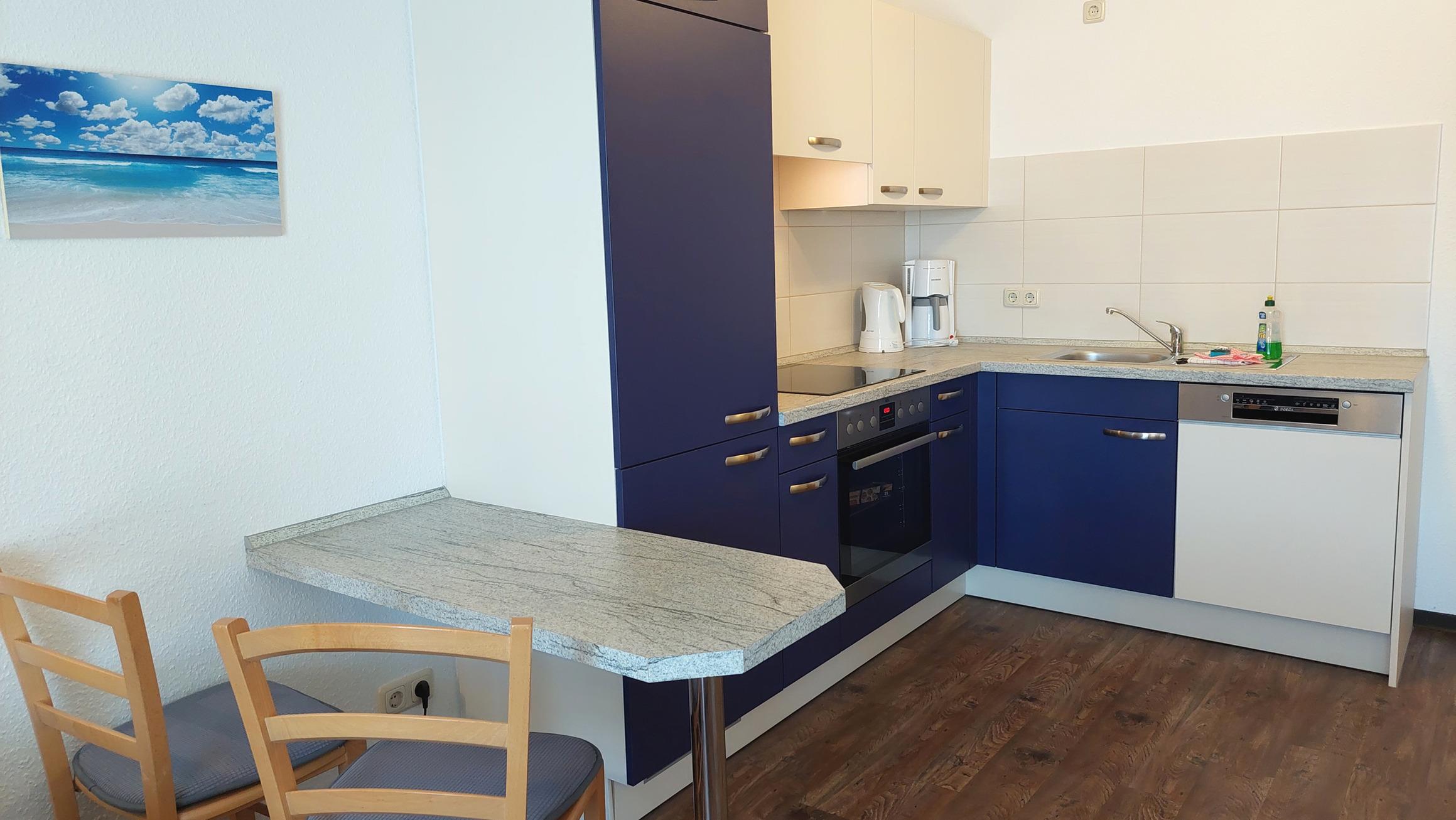 Diese freundliche Wohnung ist aufgeteilt in einen Wohnraum mit Balkon und integrierter Küchenzeile, ein Schlafzimmer ebenso mit Zugang zum Balkon und ein Duschbad mit Waschtisch und WC. Das Wohnzimmer begrüßt Sie mit einem Schlafsofa und Sessel sowie Flachbild-TV. Das Schlafzimmer verfügt über ein Doppelbett (1,80m x 2m) sowie einen Kleiderschrank. Die Küchenzeile ist mit Backofen, Geschirrspüler, Cerankochfeld, Kühlschrank mit kleinem Gefrierfach, Cerankochfeld, Mikrowelle, Kaffeemaschine, Wasserkocher und Toaster ausgestattet. Highlights: Kostenfreies WLAN sowie ein frei wählbarer PKW-Stellplatz direkt am Haus.